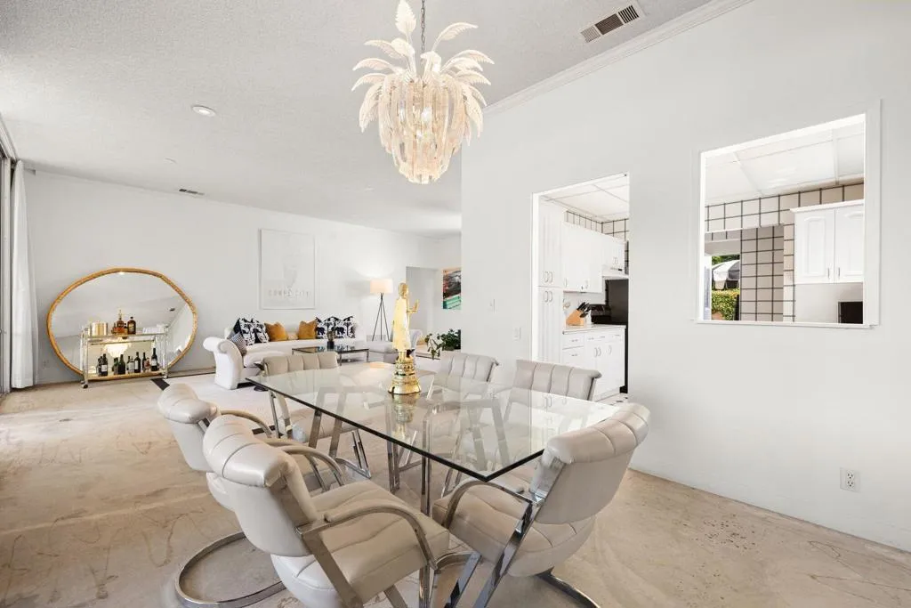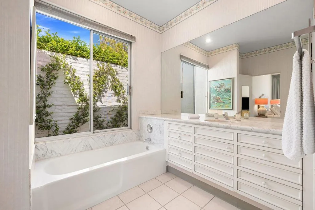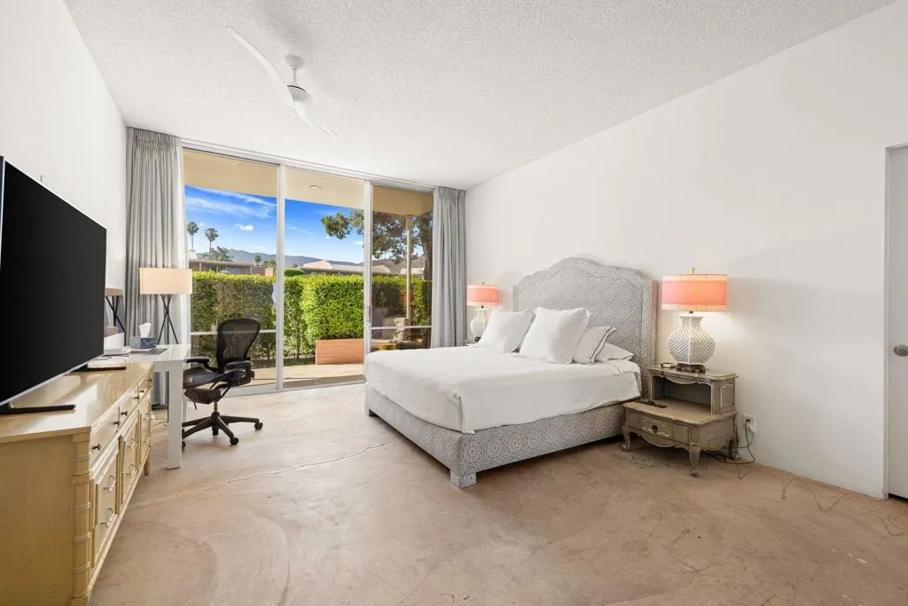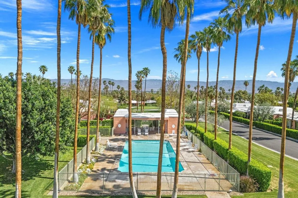 Situated in historic Marrakesh Country Club, this charming John Elgin Woolf-designed Hollywood Regency villa is brimming with potential and offers a rare opportunity to obtain a renovation project within Marrakesh. Ideally situated on a large, elevated corner lot offering open mountain views from the expansive courtyard and beyond, this property is a true find. Once inside via the iconic Marrakesh double Pullman entry doors, you will find this light-filled two-bedroom, two-bathroom, 1,808 sq. ft. B Plan residence ready for your personal vision. Soaring 10' ceilings and abundant natural light create an inviting foundation for reimagining.The light and bright kitchen showcases beautiful mountain views from the window and offers open-door access to the courtyard. The expansive courtyard serves not only as a grand entry but as an ideal airy outdoor living space. A newly landscaped south-facing terrace, complete with privacy hedges, overlooks the golf course and delivers gorgeous mountain views.The primary suite features a walk-in closet and classic marble counters, while the guest suite includes a versatile retreat space that can be used as a home office or extra sleeping area. Additional highlights include installed solar.Marrakesh is a boutique country club with an ideal central valley location amongst a few of the desert's finest private clubs. Amenities include an 18-hole private executive Ted Robinson designed golf course, tennis, pickleball, 14 pools and spa, a fitness center, and an active and newly-remodeled clubhouse with fine dining. Just minutes away is renowned El Paseo, lined with elegant boutiques, restaurants, art galleries, and coffee shops. Come experience Marrakesh--schedule your private tour of 73597 Minzah today.