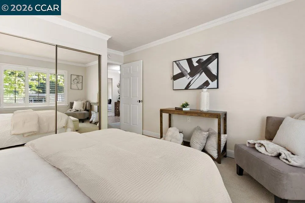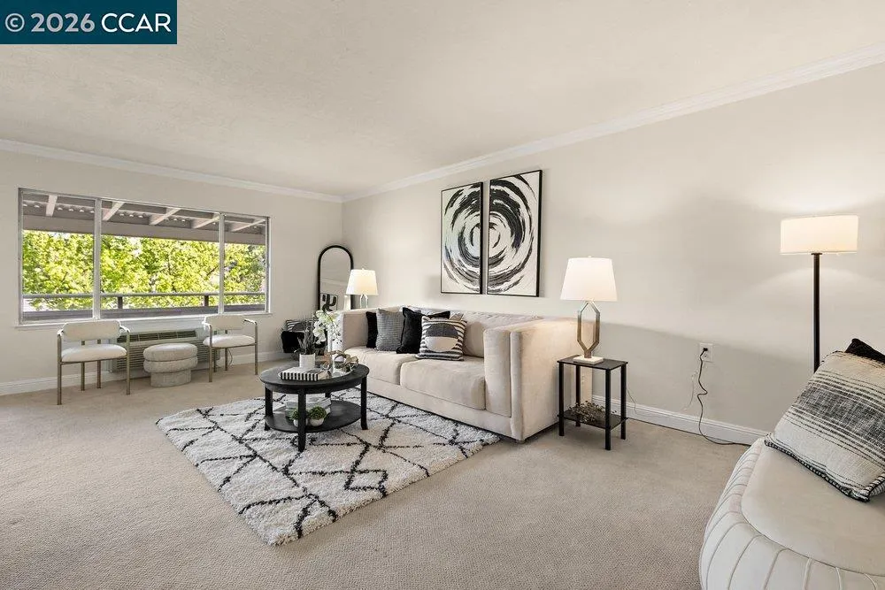 Upper 2 bed/ 1 bath Saratoga Co-op. Stylish, well maintained, plantation shutters in bedrooms, stacked washer/dryer. Fresh interior paint, plush carpet, smooth ceilings, crown moulding and baseboards. Peaceful view of trees and hills from dining room and exterior balcony. Cheerful morning sun and afternoon shade. Enjoy Rossmoor’s 55+ lifestyle, gold, tennis, pickle ball, workshops, clubs, fitness facility, event center and more.