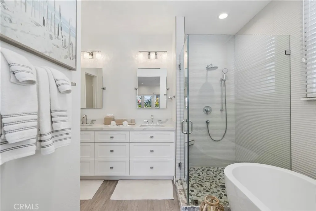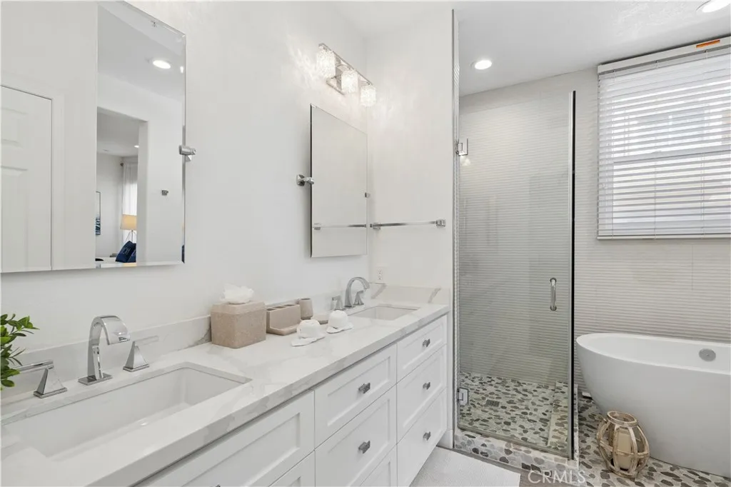 Introducing a refined coastal residence ideally positioned just across from the sand, this fully furnished two-bedroom condominium offers an exceptional Huntington Beach lifestyle from its desirable first-floor setting. Thoughtfully designed with an emphasis on light and scale, the open-concept living space is framed by soaring ceilings and expansive windows that invite in the natural beauty of the coastline. The living room is anchored by a striking stacked stone fireplace and complemented by a custom dry bar. Adjacent, the dining area flows seamlessly into a well-appointed kitchen featuring a waterfall-edge breakfast bar, stainless steel appliances, and sleek contemporary finishes. The primary suite offers a serene escape, complete with a private balcony, a plush king-sized bed, and a spa-inspired bath featuring an oversized walk-in shower, a separate soaking tub, and a dual-sink vanity with generous storage. A spacious secondary bedroom, full guest bath, and dedicated laundry room provide both comfort and convenience. Multiple private outdoor spaces invite in the ocean breeze, while the community spa and lounge offer an additional layer of relaxation. Moments from the iconic Huntington Beach Pier and just a short walk to Downtown Main Street, this exceptional offering places world-class dining, boutique shopping, and vibrant coastal energy right at your doorstep, all set along the shoreline of renowned Surf City.