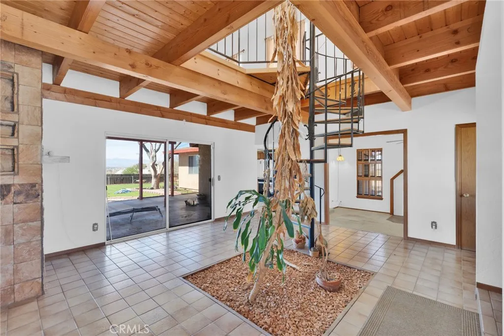Set on 2 acres in Apple Valley mid-century modern-inspired home blends style, function, and desert living. The 2,010 sq ft residence includes 2 bedrooms, 2.5 bathrooms, and a flexible third room that can serve as an additional bedroom, home office, media space, gym, guest room, or creative studio. Inside, a spiral staircase adds a striking architectural touch, and windows filling the home with natural light while offering peaceful desert and mountain views. Step outside to a private balcony or a backyard oasis with an in-ground pool, perfect for relaxing, entertaining, or enjoying the High Desert sun. Additional highlights include a 2-car garage with a large driveway and fully paid solar, combining convenience and energy efficiency. Located in a quiet neighborhood, this home offers architectural charm, versatile living spaces, and private desert tranquility.