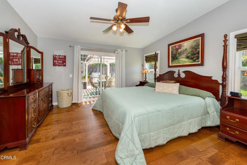 Welcome to this beautifully updated home located on a quiet street in desirable Moorpark. This meticulously maintained residence features three bedrooms and two bathrooms within 1,595 square feet of carefully planned living space. The property seamlessly combines comfort, elegance, and contemporary enhancements throughout. Step inside to find stunning hardwood flooring complemented by fresh interior paint, creating a light and inviting atmosphere. The recently remodeled bathrooms showcase tasteful finishes, while the kitchen is both functional and elegant with granite countertops, pull-out shelving, and newer Samsung stainless steel appliances, including a convection/air fryer oven and quiet dishwasher. The home features dual-pane windows with custom trim, 6 panel solid core interior doors, ceiling fans throughout, and a whole house fan for added efficiency. The spacious living area is centered around a cozy wood-burning fireplace with a gas port, perfect for relaxing evenings. Outside, enjoy a private backyard retreat with a pergola-covered patio and a programmable sprinkler system, ideal for entertaining or everyday enjoyment. The garage is equipped with built-in cabinets, shelving, and a workbench, offering excellent storage and workspace. Major system upgrades provide peace of mind, including newer HVAC system (2021), hot water heater (2021) and a tile roof with 50-year felt. New exterior paint (2024) provides a clean and crisp appearance. With its blend of modern updates, quality features, and inviting indoor-outdoor living, this Moorpark home is a true standout.