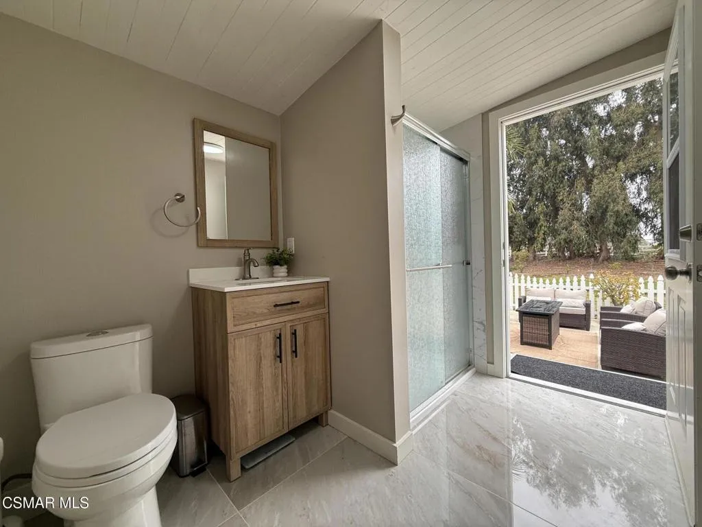 A truly special offering in the coveted Lamplighter community of Camarillo. This completely reimagined residence offers a versatile layout with 2 bedrooms and 2 bathrooms in the main home, plus an attached guest suite featuring an additional bedroom, full bathroom, and kitchenette, ideal for extended family or guests. At the heart of the home is a stunning chef's kitchen, highlighted by a massive waterfall quartzite island that serves as the centerpiece. The kitchen opens seamlessly to the family room, creating an inviting space perfect for both everyday living and entertaining. The family room is anchored by a beautiful fireplace and complemented by custom built-ins, ideal for a wine or coffee bar. Down the hall, you'll find a spacious guest bedroom with a large walk-in closet, a fully remodeled guest bathroom, and a serene primary suite tucked toward the rear of the home. The primary offers a peaceful retreat with direct access to the backyard, enhancing the indoor-outdoor living experience. The attached guest suite features its own private rear entrance and includes a generous bedroom, full bathroom, and convenient kitchenette, offering flexibility and privacy. Step outside to the expansive back patio, perfect for relaxing or entertaining, which opens to a large greenbelt, creating a rare sense of openness and privacy. Additional features include a convenient storage shed and ample covered parking. Upgrades include engineered hardwood flooring, Monogram appliances, Built-in Sonos speakers, indoor laundry, electric fireplace, tankless water heater, and much more. The Lamplighter community offers resort-style amenities including a pool, spa, clubhouse, gym, billiards room, and more, providing a lifestyle that blends comfort, convenience, and leisure.