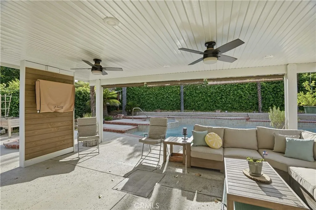 Valencia Pool Home beautifully upgraded 3-bedroom, 2-bath single-story nestled on a double cul-de-sac with NO HOA and NO Mello-Roos! Bonus OWNED SOLAR!!! This light-filled home features an open and inviting layout with recessed lighting, crown molding, tile flooring, dual-pane windows, plantation shutters, french doors, and ceiling fans. Recent upgrades include newer exterior paint, HVAC system, and newer pool equipment and pool plaster refresh. The spacious family room offers a cozy fireplace, abundant natural light, and serene backyard views, flowing seamlessly into the dining area. The upgraded kitchen is both stylish and functional, featuring granite countertops, upgraded cabinetry with pull-out drawers, quality appliances, and an open layout ideal for entertaining. The primary suite boasts high ceilings, mirrored wardrobe doors, and direct backyard access. The remodeled en-suite bath showcases a sleek glass-enclosed walk-in shower. Two additional bedrooms and an upgraded secondary bathroom complete the interior. Step outside to a true entertainer’s dream backyard. Enjoy a sparkling pool and spa surrounded by lush landscaping and beautiful hardscape. Two covered patio areas create the ultimate indoor-outdoor lifestyle—one featuring a TV lounge space perfect for relaxing or game days, ideal for hosting gatherings year-round. Ideally located near top-rated schools, parks, Valencia paseos, shopping, dining, and easy freeway access. This home offers the perfect blend of comfort, style, and convenience. Don’t miss this incredible opportunity to make this your next home!