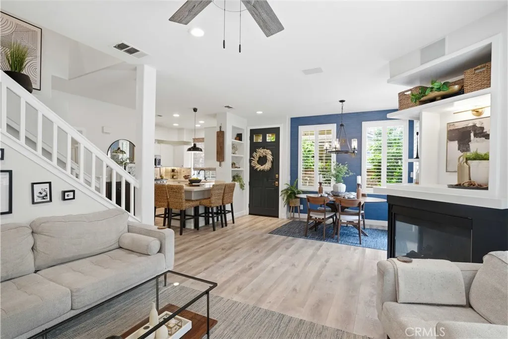Welcome to this model-perfect and professionally designed residence nestled within the highly sought-after Cheyenne community! Step inside to discover a beautifully appointed kitchen featuring sleek quartz countertops, a stylish tile backsplash, shaker cabinetry, stainless steel appliances, and an expansive breakfast bar, perfect for both casual dining and entertaining. The inviting living room offers a cozy fireplace, custom accent walls, and integrated surround sound, creating an ideal space to relax or host guests. The main level also includes a well-appointed guest bathroom with an updated vanity and cleverly designed hidden storage, as well as a rare dedicated laundry room with an adjacent pantry, providing exceptional functionality and storage. Upstairs, the spacious primary suite boasts vaulted ceilings, abundant natural light, and a ceiling fan for added comfort. The en-suite bathroom features dual sinks, a standing shower, and a generous walk-in closet. Two additional bedrooms, each with ceiling fans, share a beautifully updated secondary bathroom with a shower-tub combination. A versatile loft area offers the perfect space for a home office, media room, or flex space. The last elegant touch is plantation shutters throughout the home. Step outside to a tranquil backyard retreat complete with a raised deck, serene landscaping, and ambient string lighting...ideal for outdoor entertaining. You will also find an attached 2 car garage with durable epoxy flooring. Residents enjoy access to exceptional HOA amenities, including a pool, spa, sport court, and trash services. Ideally located near top-rated schools, parks, shopping, and dining, this home offers both comfort and convenience. Meticulously maintained and thoughtfully upgraded, this is a home you’ll be proud to call your own!