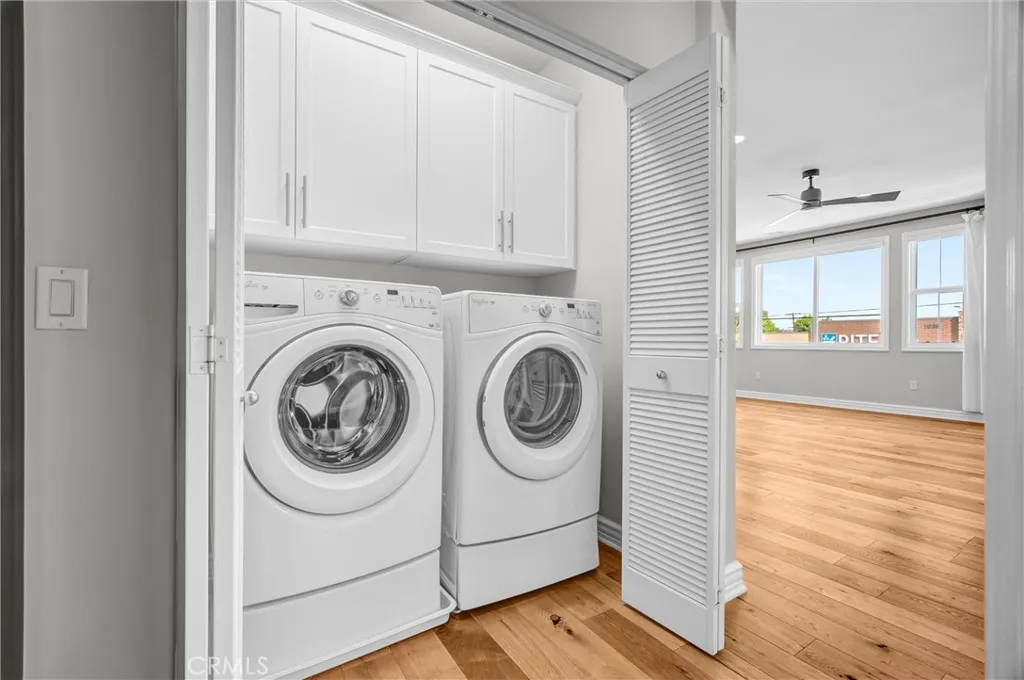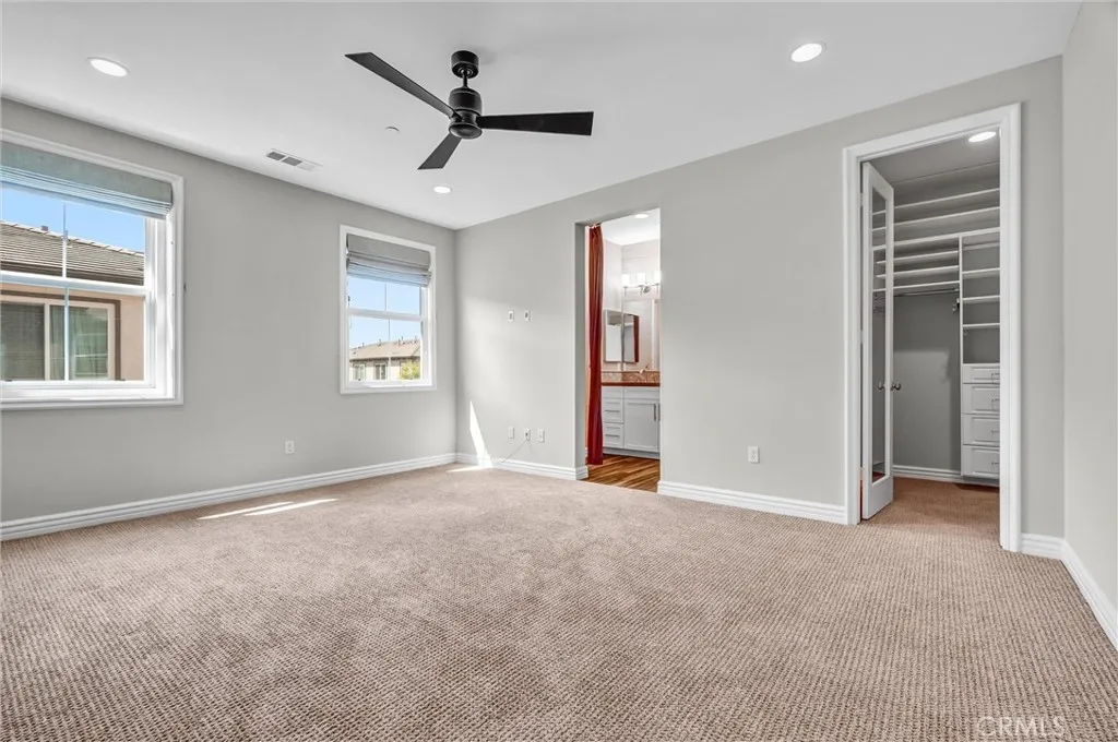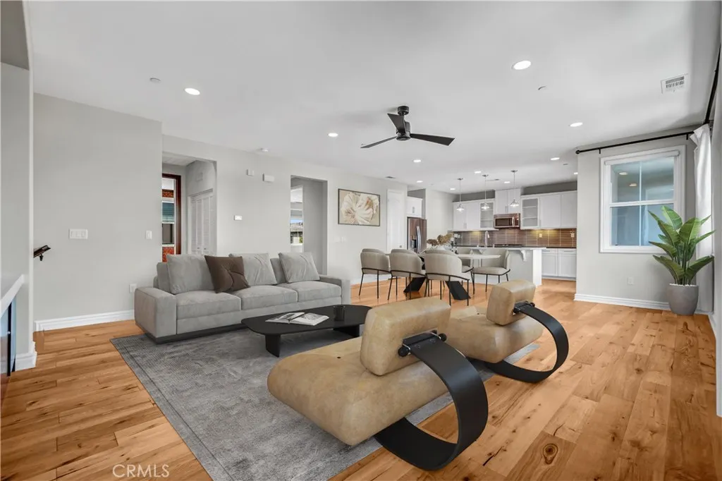 Beautifully designed 3-bedroom, 2-bathroom flat-style condo offering approximately 1,808 sqft of modern & comfortable living in the heart of Fullerton. This thoughtfully planned home features a single-level living layout above the garage, combining the privacy of a townhome with the ease & convenience of a flat. The entry welcomes you with direct access to an attached garage, complete with built-in storage, a custom workbench, and a whole-house Halo water filtration system. Upstairs, the spacious great room is filled with natural light & enhanced by a dedicated tech area, media niche, ceiling fans, and dimmable recessed lighting throughout the home, creating an ideal setting for both everyday living & entertaining. The well-appointed kitchen features a gas cooktop, built-in microwave hood, oven, and refrigerator, and opens to a private deck through sliding glass doors, perfect for outdoor dining or unwinding at the end of the day. A convenient laundry closet includes a washer and dryer. The home also features 9-ft ceilings and 8-ft doors, adding to the sense of openness and modern appeal throughout. The primary suite offers a peaceful retreat, complete with custom Roman shades, a ceiling fan, and two closets—one walk-in and another with built-in drawers for added storage and organization. The en-suite bathroom features dual vanities and a walk-in shower. Additional bedrooms are well-sized & feature built-in closet organizers, providing both comfort and functionality. Ideally located with easy access to the 5, 57, & 91 freeways, this home is perfect for commuters seeking convenience without sacrificing comfort. Enjoy close proximity to multiple shopping centers, dining options, Costco, Target, Walmart, and more. Located within the highly regarded Fullerton Joint Union High School District, this home offers a well-balanced lifestyle of accessibility, comfort, & modern living.