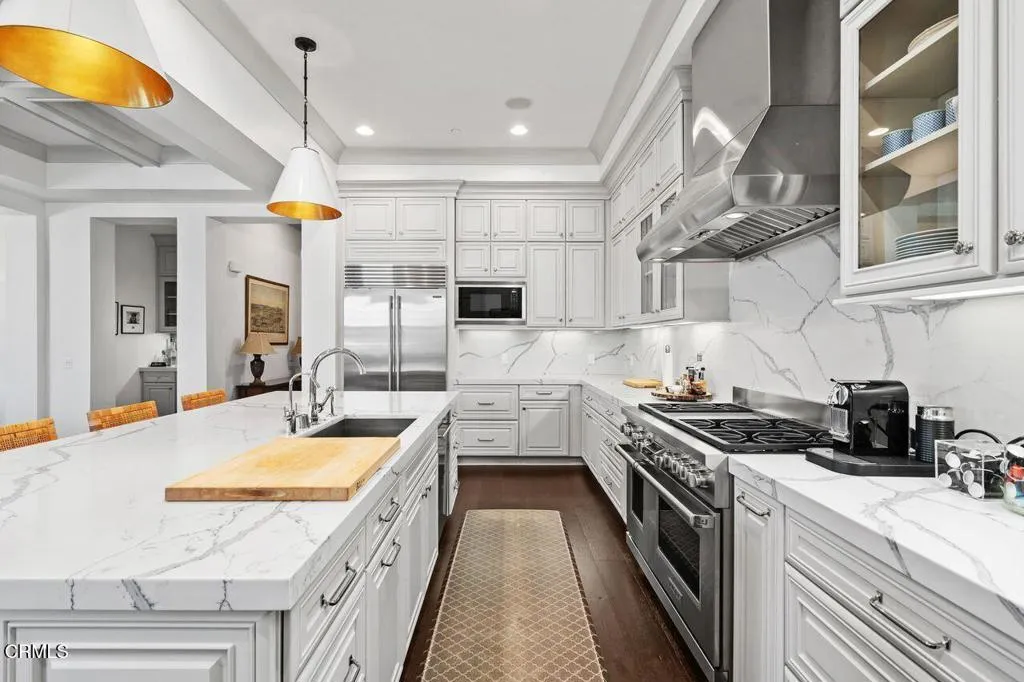 Experience refined living in this stunning 3-bedroom, 3-bathroom luxury condominium at the prestigious Jamison Place on Millionaire's Row. Offering approximately 2,662 square feet of beautifully designed living space, this elegant residence features breathtaking mountain views and exceptional upgrades throughout. The bright and expansive living area showcases gorgeous hardwood floors, abundant natural light, and custom drapery, creating a warm yet sophisticated atmosphere. Just off the living room is a stunning private office, providing a stylish and functional workspace. The gourmet kitchen is designed for both everyday living and entertaining, featuring premium stainless steel appliances including a Wolf range and Sub-Zero refrigerator, custom cabinetry, and a large center island perfect for gathering and meal preparation. The adjoining formal dining area offers an elegant setting for hosting. The primary suite offers a relaxing retreat with a comfortable seating area and private balcony with mountain views. The primary bathroom features a luxurious sunken soaking tub, separate shower, and a custom walk-in closet. Two additional spacious bedrooms are located on the west side of the residence and share a connecting bathroom. A large laundry room with extensive cabinetry adds convenience and storage. A rare highlight is the private 4-car tandem garage, beautifully remodeled with custom cabinetry, wine refrigerator, fitness area, and lounge space, creating a versatile extension of the home. Jamison Place offers beautifully maintained grounds, a community pool, and rooftop viewing areas with sweeping views of the San Gabriel Mountains and the iconic Rose Parade route. This exceptional residence offers luxury, comfort, and an outstanding Pasadena location.