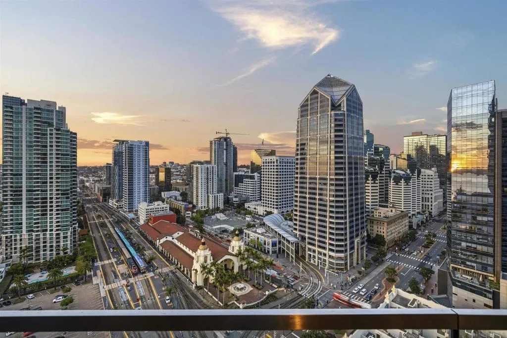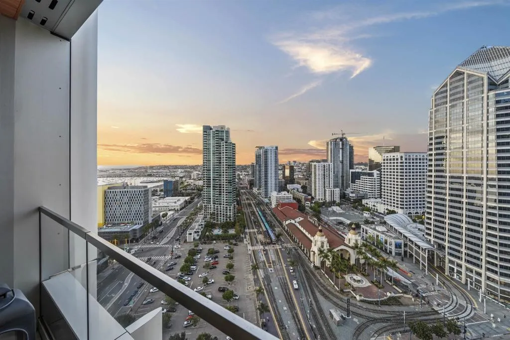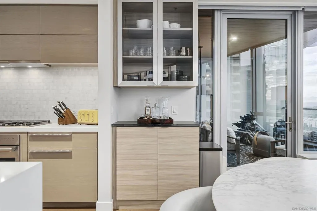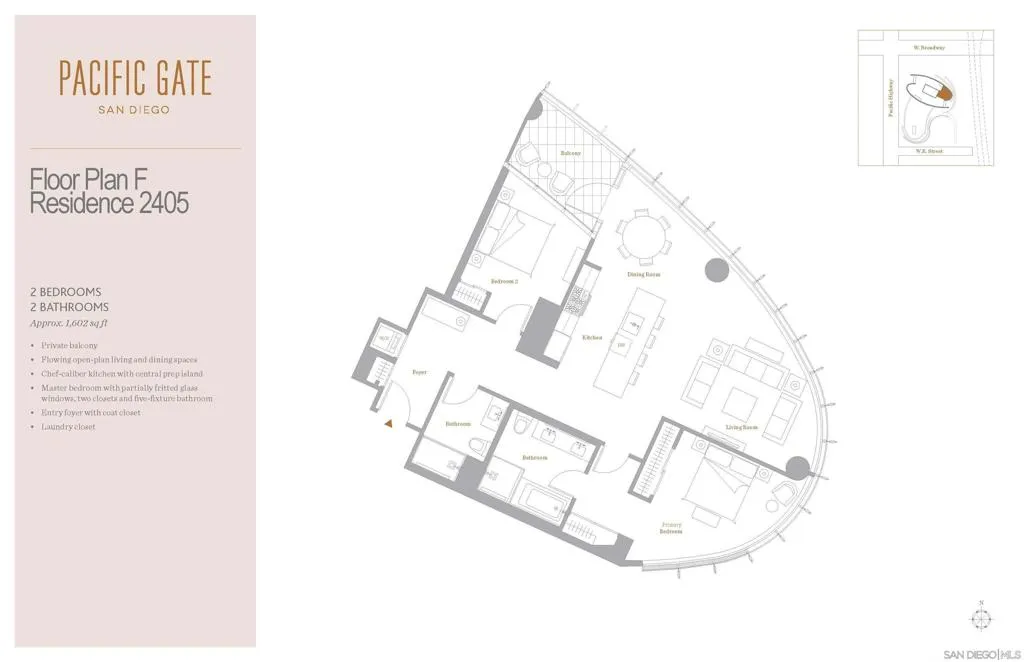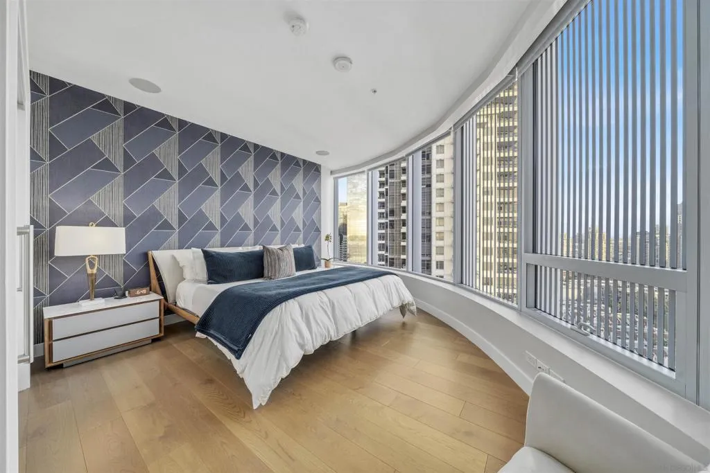 Perched on the 24th floor of Pacific Gate, Residence 2405 offers a rare corner layout with sweeping views of the downtown skyline, San Diego Bay and the Coronado Bridge. This 2BR/2BA residence features an open concept design with expansive windows and views from every room. The large private terrace is uniquely protected from wind while capturing stunning city lights and bay views, perfect for year-round indoor-outdoor living. The home is enhanced with premium upgrades including wood flooring throughout, heated primary bathroom floors and integrated smart home controls for lighting, climate and motorized shades. The modern kitchen showcases power-operated cabinets and a hidden built-in dog feeding station. Designer wallpaper adds a custom, sophisticated touch to the living room and primary suite. Both bedrooms feature custom closets by California Closets. The guest bedroom also includes a custom media and storage center, ideal for guests, a home office or flex space. Designed by Kohn Pedersen Fox, Pacific Gate offers a chef concierge, private yacht access, luxury car fleet, pool/spa, fitness center, steam/sauna, theater, business center and dog retreat.