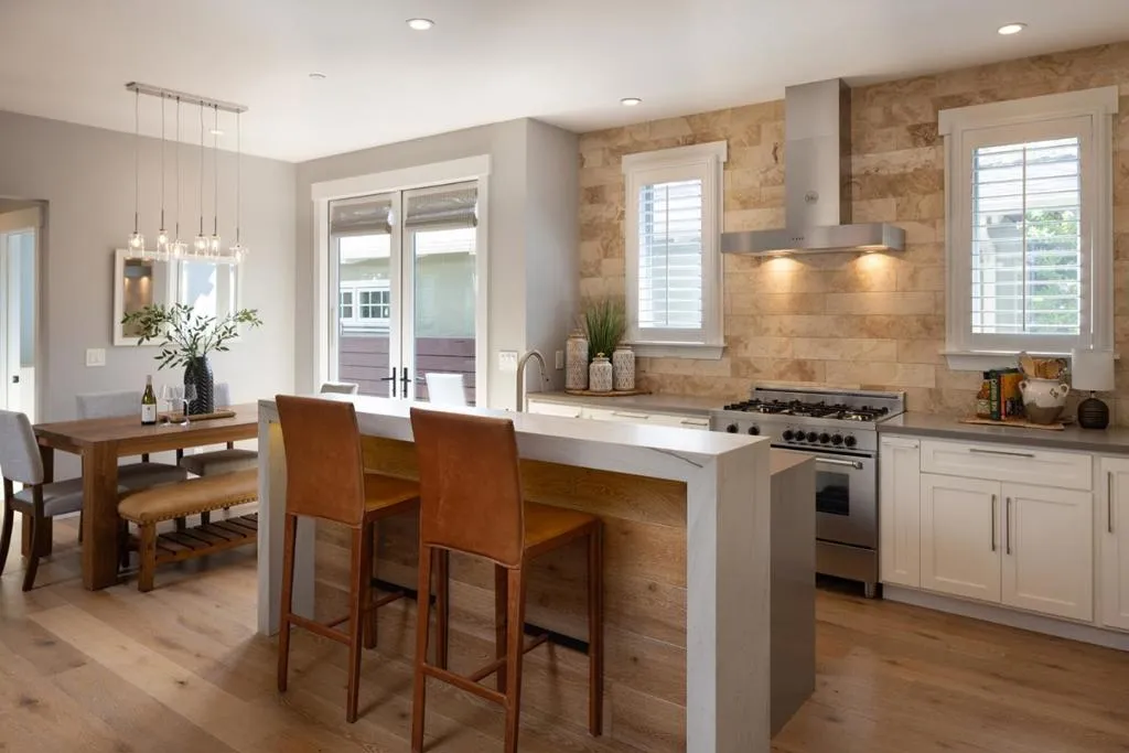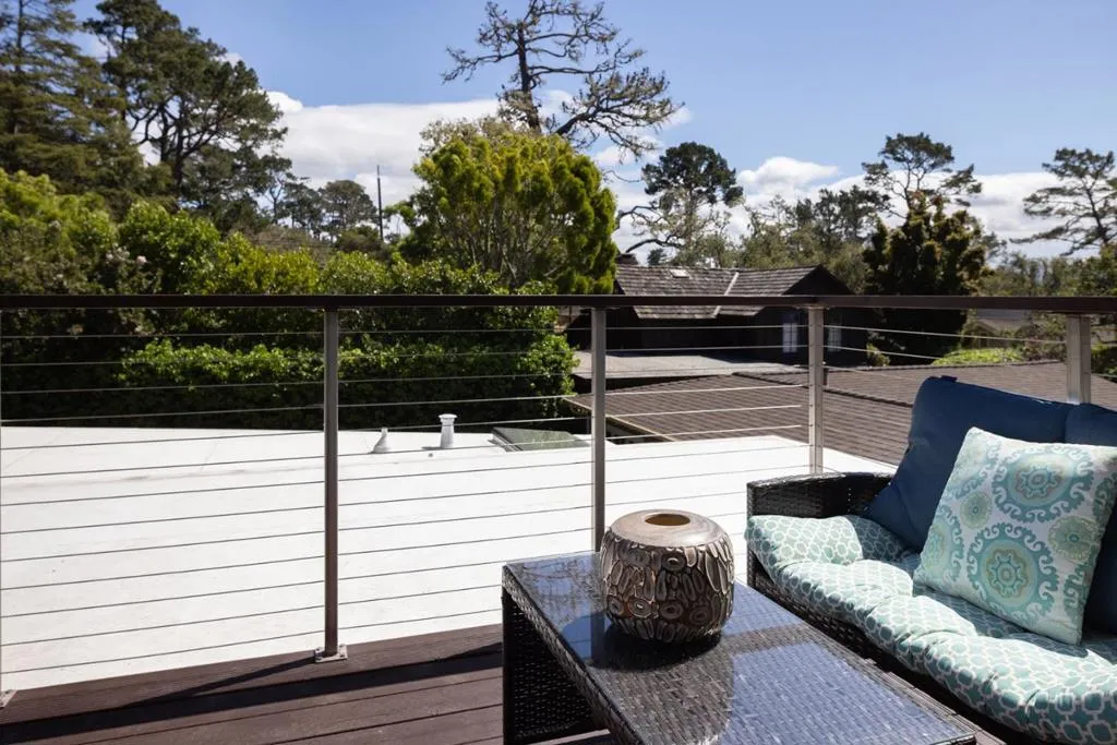 Beautifully reimagined Carmel-by-the-Sea home just moments from downtown, thoughtfully remodeled by Lewis Builders with high-end finishes and timeless design throughout. This 3 bedroom, 2.5 bathroom residence offers ~1,850 sq ft of light-filled living space, featuring an open floor plan, 10-foot ceilings, and wide plank oak flooring. The chefs kitchen is equipped with Calcutta marble and Caesarstone countertops, a Bertazzoni stove and hood and a large island with bar seating, flowing seamlessly into the dining area and living room with a striking stone gas fireplace. Custom lighting enhances every space. The main-level primary suite includes a spa-like bath with a skylit shower, his and her sinks, and direct access to the fenced backyard. A convenient half bath is also on the main level. Upstairs, two bright bedrooms share a beautifully appointed full bath, with one offering a private balcony, plus an additional spacious balcony for outdoor enjoyment. The front yard features a welcoming sitting area with a fire pit, perfect for relaxing evenings. Complete with a 1-car attached garage, this turnkey home blends luxury, comfort, and ideal Carmel living.