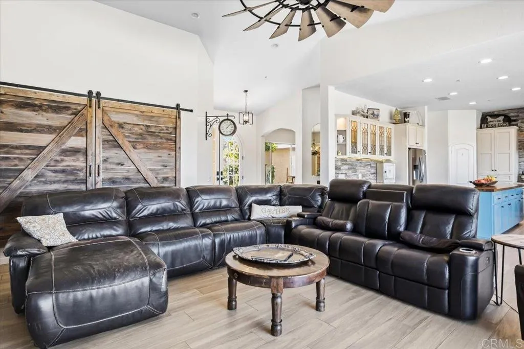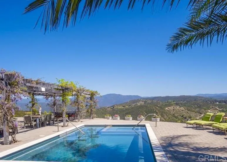 PREMIERE OPEN HOUSE ITALIAN INSPIRED EVENT on SUNDAY APRIL 12, 2:00 - 5:00! Stunning single-level ESTATE on 10.55 private hilltop acres with BREATHTAKING 340° views of rolling valleys, mountains, and the Ramona countryside. Located in the HEART of the Ramona Valley WINE REGION, this exceptional property offers a rare blend of architectural elegance, resort-style living, and agricultural opportunity with an 8+ acre PRODUCING OLIVE ORCHARD. The 3,378 sq ft residence features 4 spacious bedrooms, each with its own en-suite bath and scenic views. The LUXURIOUS PRIMARY suite features a fireplace, a spa-inspired bath, and an expansive walk-in closet. A remodeled GOURMET KITCHEN showcases designer counters, a large center island, and generous pantry, opening to the main living areas. Additional highlights include a private OFFICE with custom cabinetry, a living room with fireplace and built-ins, and a versatile BONUS ROOM ideal for a wine room, study, or playroom. La Cantina doors create seamless INDOOR-OUTDOOR LIVING, opening to a RESORT-STYLE setting with a newer (2023) Hydrazzo pool and spa, expansive paver patio, WISTERIA-COVERED PERGOLA, and a fully equipped outdoor kitchen featuring a WOOD FIRED PIZZA OVEN IMPORTED FROM ITALY, Sub-Zero refrigeration, and more. The GATED entrance and circular driveway provide a grand arrival with ample parking. The oversized 3-car garage includes epoxy floors and a convenient bath. Additional features include 2 new HVAC systems (2024), solar, backup generator, and 10,000-gallon water tank. The A70-zoned property also includes a SMALL VINEYARD, approx. 1,800 sq ft BARN with stalls, CORRALS for farm animals and a separate structure ideal for a studio, retreat, or workshop. Ideally located off Hwy 78, just minutes to the San Diego Zoo Safari Park, wineries, and downtown Ramona.