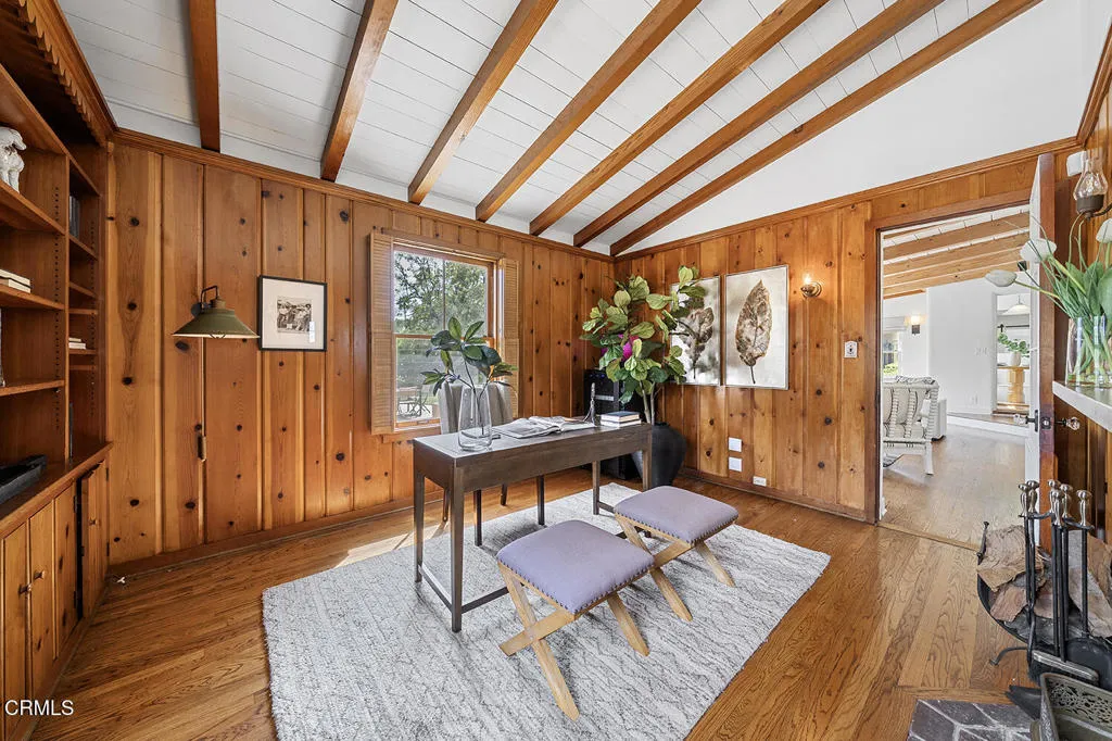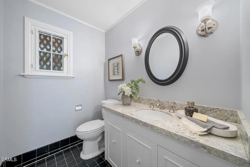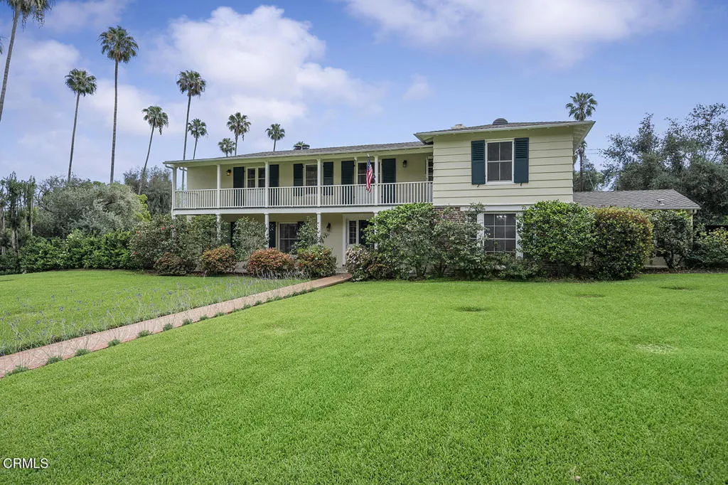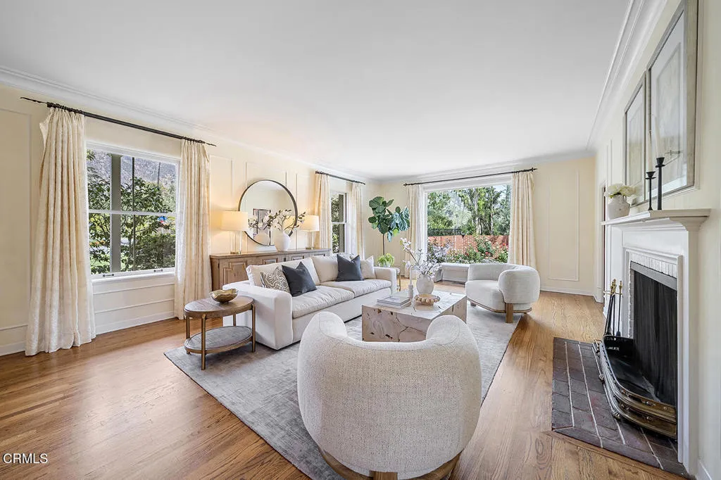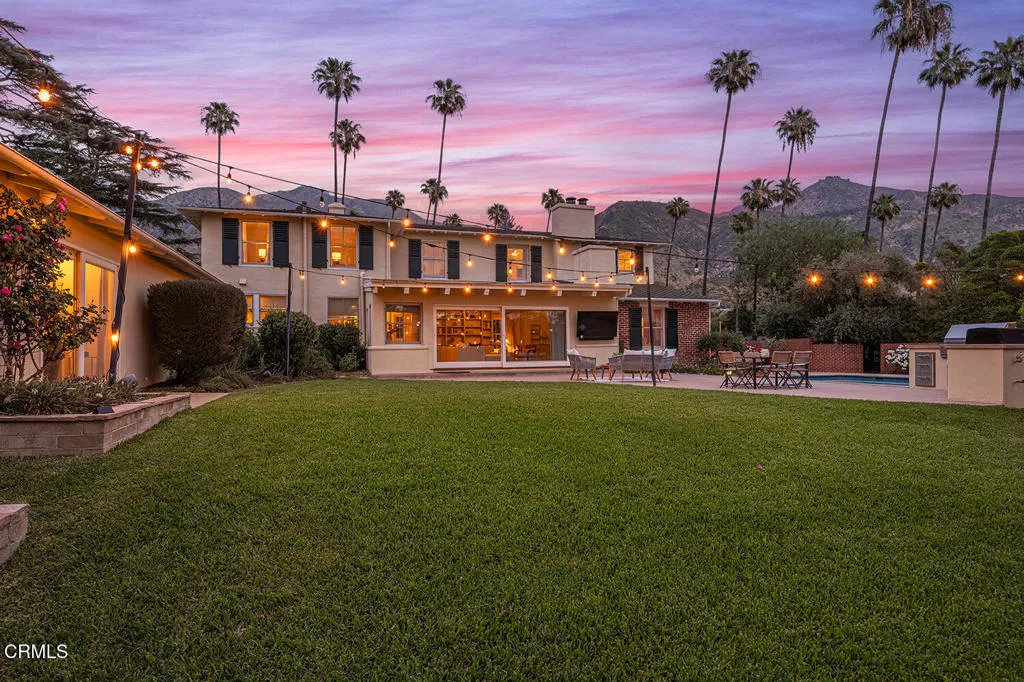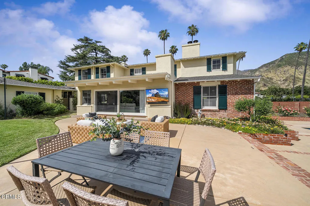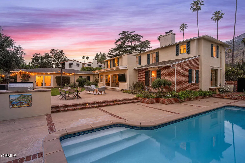 Experience the perfect fusion of classic style and grand scale in this stunning 4-bedroom, 4.5-bath Monterey Colonial estate, situated on a quiet corner of Midlothian Dr. near the prestigious Altadena Town and Country Club. Built in 1930 on a generous .71-acre lot, this 4,245 SF home offers a blend of classic architectural detail and modern luxury. A long brick pathway to the front door flanked by mature camellias and azaleas, offers mountain views and a backdrop of tall, swaying palms. The first floor features a formal entry and hardwood floors throughout. The living room features a fireplace and large bay window. Designed for both sophisticated entertaining and comfortable family life, this home provides dedicated spaces for work and relaxation: a library with classic wood paneling, a family room featuring beamed ceilings, built-in cabinetry and two desk spaces, each with a fireplace, and a massive slider opening to the rear yard. Step into the gourmet kitchen featuring quartz countertops, large pantry, and charming breakfast nook with storage underneath the seating area, high-end appliances, including a Sub-Zero fridge/freezer and wine fridge, Bosch dishwasher, and a built-in microwave - all centered around a fabulous vintage Magic Chef stove with six gas burners and four oven compartments. A Butler's pantry and a separate, large laundry room enhance functionality. The formal dining room boasts wainscotting, large windows, and a crystal chandelier. Upstairs, the spacious, light-filled primary suite features an updated bath and spacious walk-in closet. The landing has French doors leading to a veranda spanning the entire frontage and shared by another bedroom. The expansive, resort-like rear yard is a true oasis. It features a saltwater, heated pool with spa and diving board. The landscaping includes wide-open spaces along with rose bushes, olive and citrus trees. A Viking stainless steel built-in BBQ with concrete countertops and a separate charcoal smoker grill complete the outdoor kitchen. A detached two-car garage accompanies a 356 SF game room/pool house with a full bedroom and 3/4 bath, offering ideal space for guests or recreation. Additional amenities include an extended gated driveway large enough for RV parking, newer roof, dual zone HVAC, and updated electrical panel. This extraordinary estate with enduring elegance is an entertainment haven. This is a rare opportunity to own a unique home on the market for the second time in almost 75 years.