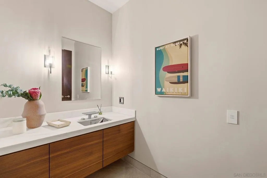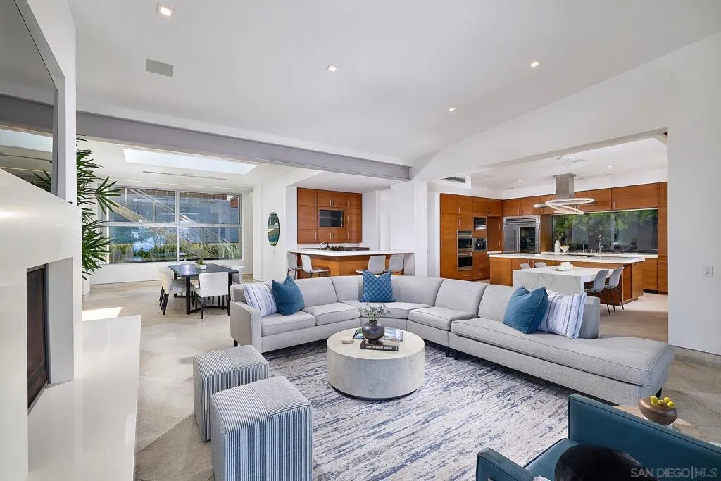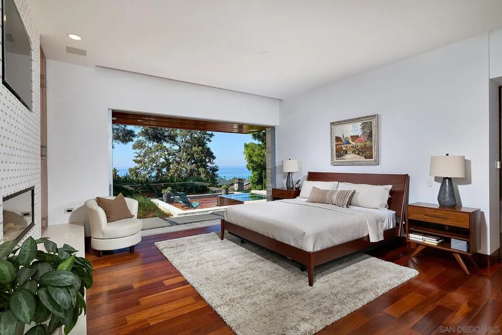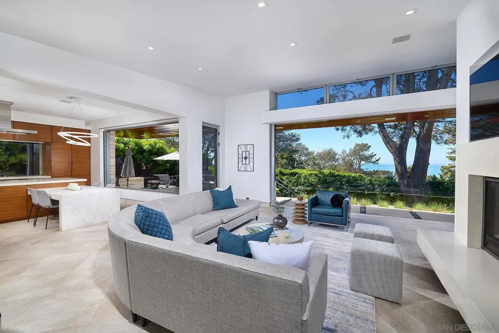 Tucked away in Olde Del Mar and completely hidden from the street, this 5,441 sq ft residence offers exceptional privacy, design, comfort, and effortless coastal living. Its once in a lifetime setting captures panoramic ocean views, Torrey Pines, and endless open sky. A dramatic bridge over the infinity edge pool leads to the main entry, where a light filled open floorplan unfolds. Disappearing glass walls blur the line between indoors and out, creating seamless connection to the surrounding landscape and making the home equally ideal for entertaining or quiet retreat. The chef’s kitchen is designed for both serious cooking and effortless hosting, featuring walnut cabinetry, a Wolf 8 burner gas range with double oven, Sub Zero Professional refrigerator and freezer, dual Miele dishwashers, built in Miele coffee machine, reverse osmosis filtration, and a hidden pantry. A floating prep island with waterfall edge marble dining table anchors the space. The main level primary suite opens to a private ocean view deck and features a spa bath with steam shower and heated floors, just steps from the pool and ocean view jacuzzi. Four additional en suite bedrooms, including one on the main level, offer comfort and privacy. A lower level media and game room with kitchenette sits beneath a pool ceiling, casting shimmering natural light throughout. Skylights further enhance the home’s bright, airy feel throughout. A semi private trail offers direct beach access, with Del Mar Village, dining, coffee shops, hiking trails, Dog Beach, the Racetrack, and easy I 5 access just moments away.