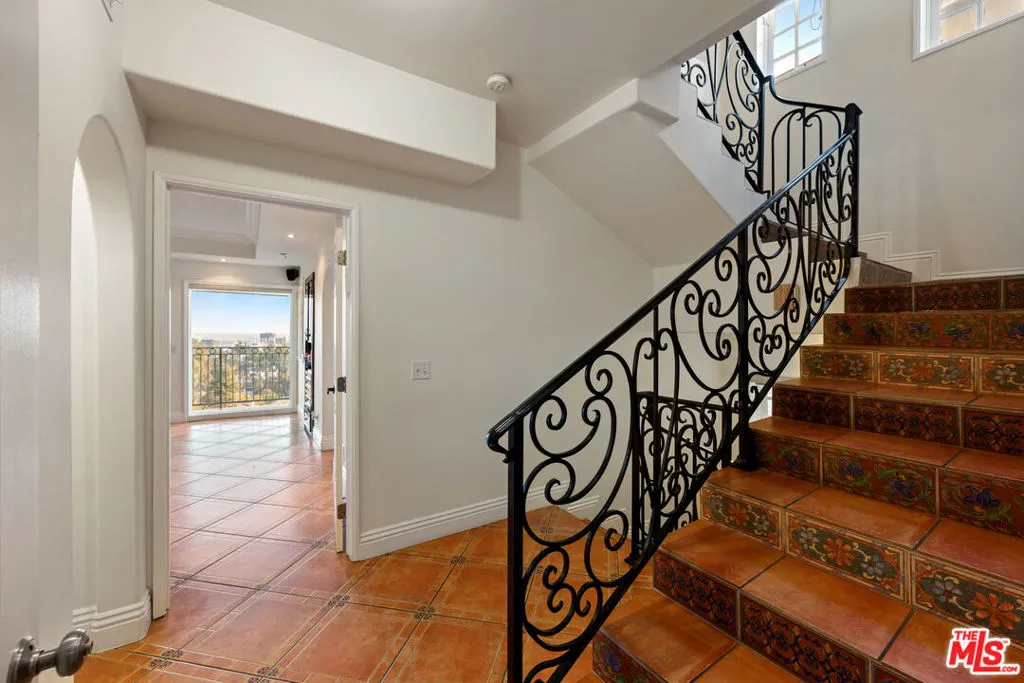 Welcome to a modern, Mediterranean style escape in the heart of the Hollywood Hills. The property is wonderfully complemented by city lights and verdant views out every window. Enter through the main level into a lovely foyer which leads to the living room, dining room, and kitchen, each adorned with architectural details including stylistic archways and vibrant tiles. Descend to the middle level where you'll find the primary retreat, complete with sitting room, walk-in closet, and private terrace. Two additional bedrooms are also located on this floor, each with their own terrace, and a jack-and-jill bathroom between. On the lowest level is the family room, a large deck, a wraparound covered terrace, and the fourth bedroom. Stairs connect the outdoor areas on the lowest and middle floors. The home is complete with a two-car garage and driveway, surrounded by lush landscaping. The home can also be accessed from Bryn Mawr Dr, with stairs leading up to the home from the street.