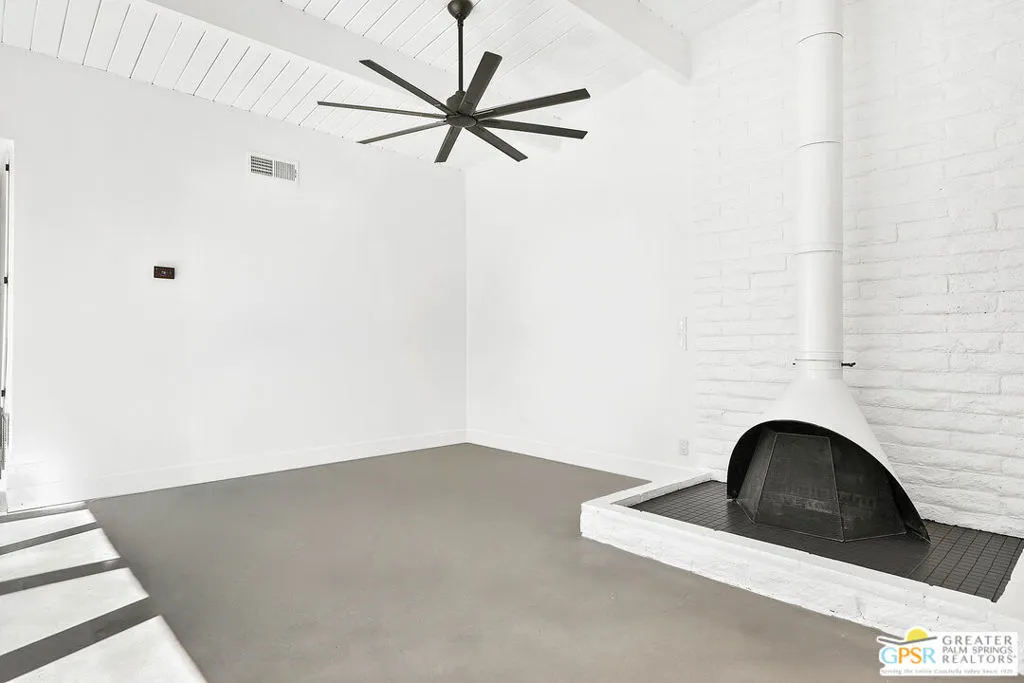 NOT A MISPRINT! Listed at $499,000, this is a rare chance to own a classic Mid-Century 2-bed, 2-bath condo on Fee Land in desirable South Palm Springs. Step into the spacious open-plan living and dining areas, where a wood burning free-standing fireplace sets the tone for cozy evenings. Glass sliders lead out to your own private patio, perfect for soaking up the desert sun or enjoying outdoor dining. The kitchen boasts a double fully operational vintage oven, adding a touch of retro charm, and offers easy access to additional storage. Cool concrete floors flow throughout the home, enhancing its low maintenance appeal, while the convenience of an in-unit washer and dryer makes life even easier. Outside, the immaculate park-like grounds are a true oasis, featuring two sparkling swimming pools and a relaxing spa, all framed by breathtaking mountain views. Opportunities like this don't come along often!!