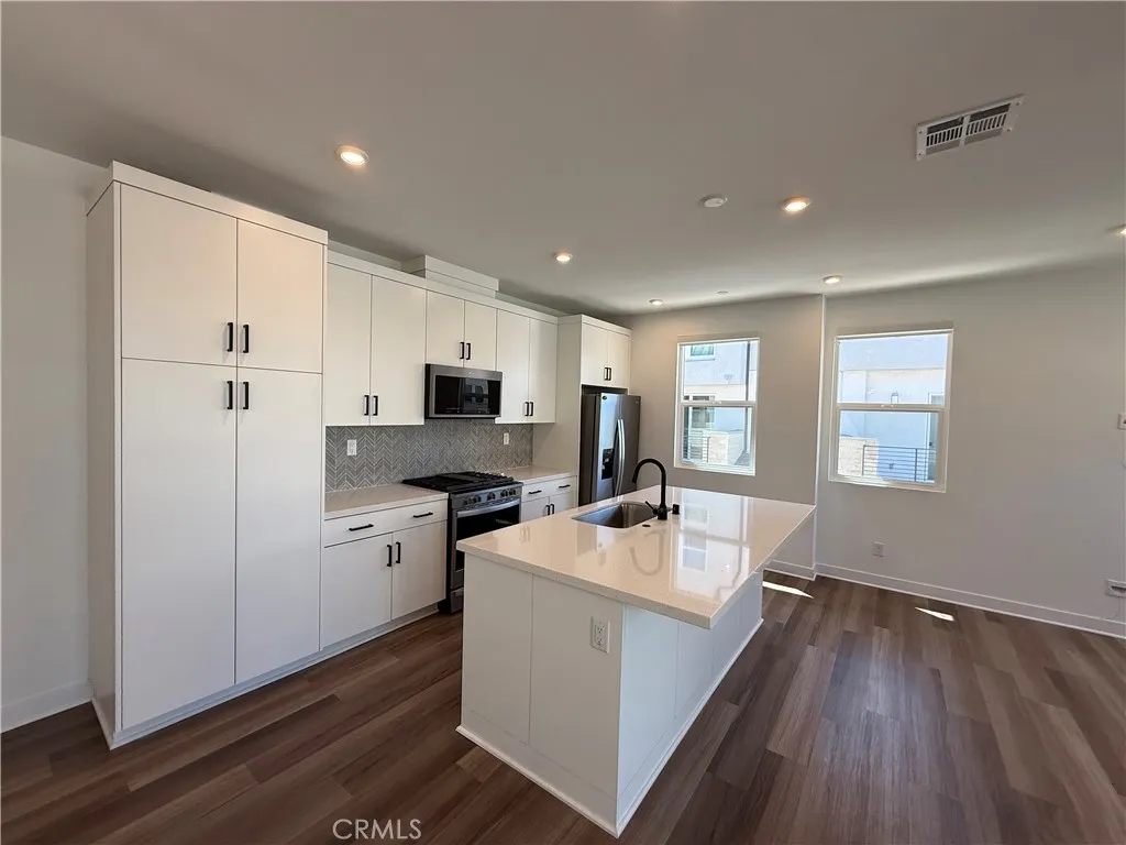 Located in the desirable gated community of 100 West in Anaheim, built by Toll Brothers, this newer end-unit home offers 3 bedrooms and 2.5 bathrooms with a bright, modern design. As an end unit, the home enjoys abundant natural light throughout, enhancing its open and airy feel. The interior features durable vinyl flooring in the main living areas, with comfortable carpeting in the bedrooms. Entry is provided through a direct-access two-car garage on the first floor. The second level showcases an open-concept layout, perfect for both everyday living and entertaining, complete with designer finishes, upgraded cabinetry, a spacious kitchen island, and premium appliances and oversized living and dining areas. The third floor hosts all three bedrooms, including a well-appointed primary suite, along with two full bathrooms and a conveniently located laundry room for added efficiency. This home is equipped with modern smart technology, including solar panels and smart thermostat/AC controls, helping to maximize comfort and energy efficiency. Ideally situated in the heart of Orange County, this home is just minutes from premier entertainment and shopping destinations such as Disneyland Resort, Honda Center, Angel Stadium, and Anaheim GardenWalk. Commuters will appreciate the close proximity to major freeways and the regional transit center. For students, the home offers convenient access to nearby universities including Chapman University, University of California, Irvine, and California State University, Fullerton. Enjoy the perfect blend of comfort, convenience, and location, along with easy access to a wide variety of shopping and dining options nearby.