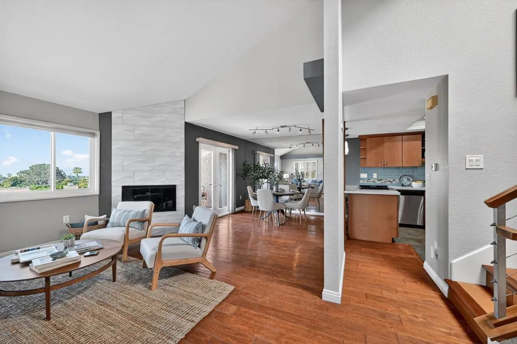 Rarely available in the gated community of Sea Crest, this beautifully updated townhome is steps from Beacons Beach and downtown Leucadia. This 3-bedroom, 2.5-bath home offers panoramic ocean views, 1,554 square feet of thoughtfully designed living space, rich wood flooring, and volume ceilings throughout. The kitchen features quartz countertops, a custom tile backsplash, and stainless steel appliances, opening naturally to the dining area and a private balcony with sunset and ocean views. The primary suite includes dual sinks, stone counters, and a custom tile shower. Two additional bedrooms downstairs share a fully remodeled bathroom with dual sinks, as well as a private patio, offering a quiet outdoor retreat. An attached two-car garage, indoor laundry, and ample storage add to the everyday convenience of this home. The private gated community includes a sparkling pool and lush landscaping with a neighborhood feel. Downtown Leucadia's restaurants, coffee shops, and beach culture are steps away, with easy freeway access nearby. Award-winning Encinitas Union School District.
