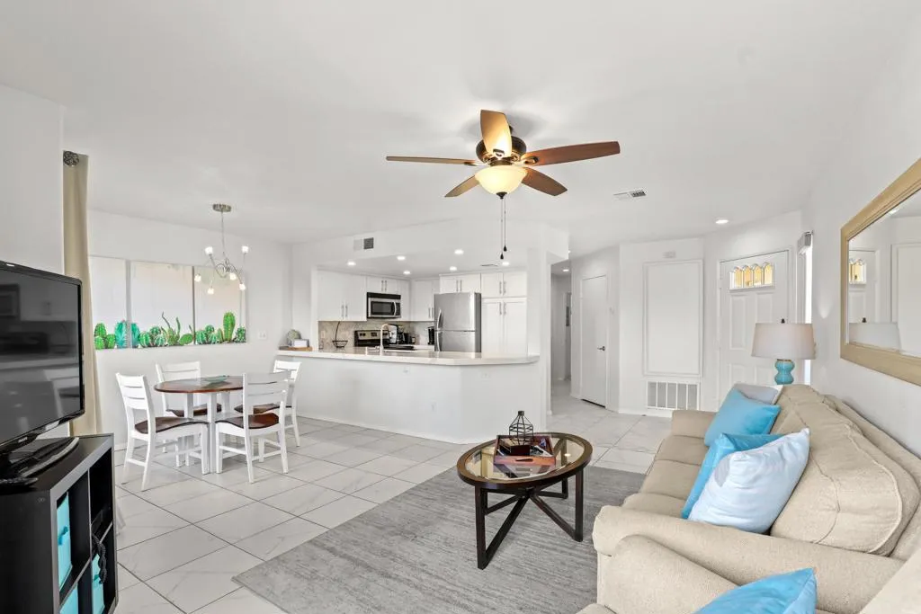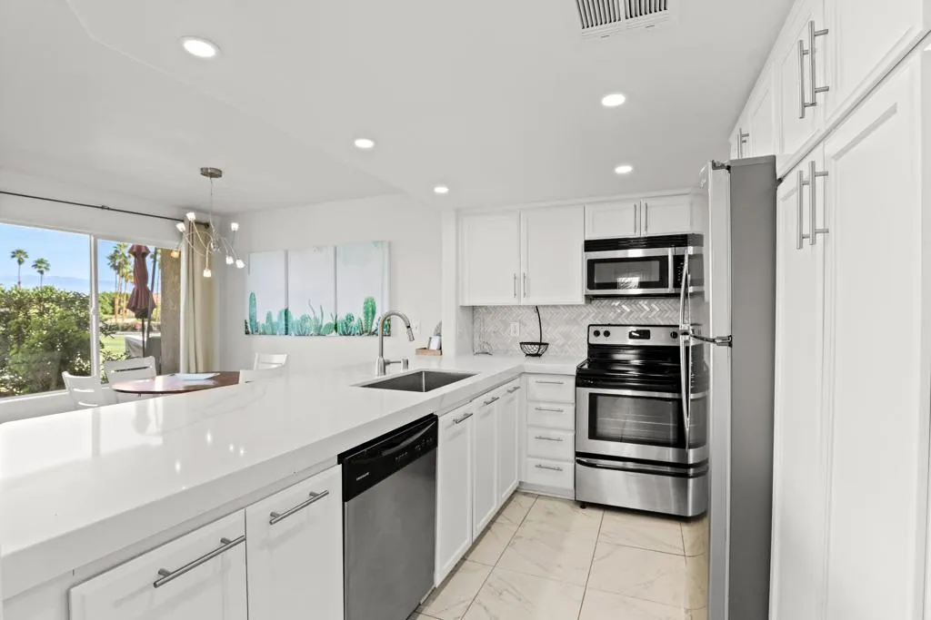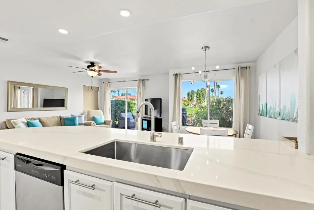 This single-level end-unit residence sits in a standout location within the gated Palm Royale community, offering sweeping lake, fairway, and mountain views while being tucked away from traffic and noise. The great-room floor plan creates an open, inviting layout, complemented by upgraded kitchen appliances, porcelain tile flooring throughout, skylights in the baths, and warm, neutral decor. Offered furnished and complete with a detached 1-car garage, the home is ready for immediate enjoyment.Palm Royale delivers an impressive lineup of amenities designed for an active desert lifestyle. Residents enjoy golf on the Ted Robinson-designed par-3 course, pickleball, tennis, six community pools and spas, a fitness center, and a clubhouse. HOA fees include unlimited golf, high-speed internet, cable TV, sewer, trash, and grounds maintenance--making daily living remarkably convenient. The community also serves as the desert headquarters for Helix Disc Golf, adding even more recreational variety.The location places you directly across from the Indian Wells Tennis Garden, home of the BNP Paribas Open, and within easy reach of shopping, dining, transportation, Acrisure Arena, and major seasonal events such as the Coachella and Stagecoach festivals. The property also offers long-term rental potential and income-producing possibilities (buyer to verify all rental guidelines with the City of La Quinta and the HOA). Whether used seasonally or as a long-term option, this condominium checks all the boxes and is a must-see for those seeking a well-situated desert retreat.