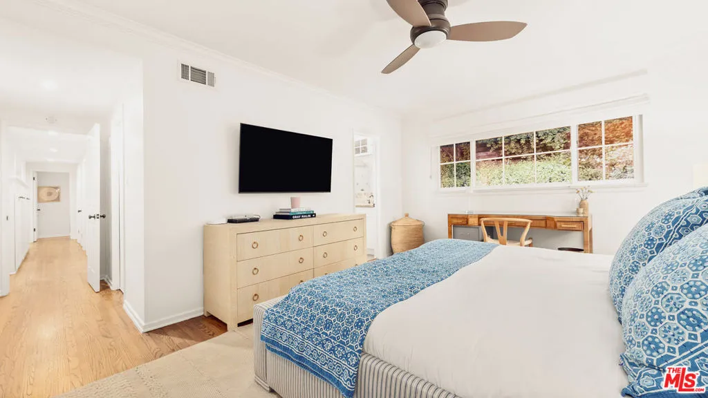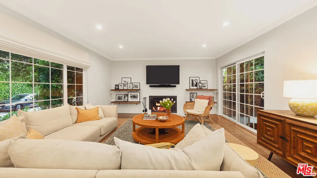 Best value in Mandeville Canyon under $2M! Charming in every sense, this Brentwood retreat offers a rare blend of tranquility and convenience just moments from the Brentwood Country Mart and the best of the Westside. Nestled among mature white birch and pepper trees, with fragrant rose and rosemary gardens, the home unfolds as a peaceful escape surrounded by natural beauty. An expansive living room, anchored by a classic brick fireplace, opens through glass doors to the rear patio and yard, creating a seamless indoor-outdoor flow. The galley-style kitchen is appointed with stainless steel appliances, granite countertops, and a tiled backsplash, and connects effortlessly to a sunlit formal dining room. The primary suite features a cedar-lined walk-in closet and a well-appointed ensuite bath with dual vanities and a glass-enclosed shower with bench seating. Two additional guest bedrooms enjoy abundant natural light and verdant outlooks, complemented by a secondary bath. Additional highlights include walnut hardwood floors, crown moldings, recessed lighting, generous built-in storage, and a two-car garage with direct entry. Set on an expansive 14,500+ square foot lot, the rear grounds provide exceptional privacy, a serene connection to nature, and ample potential for expansion or an ADU. Located within the coveted Kenter Canyon, Paul Revere, and Palisades High school districts, this property presents a rare opportunity in Brentwood.