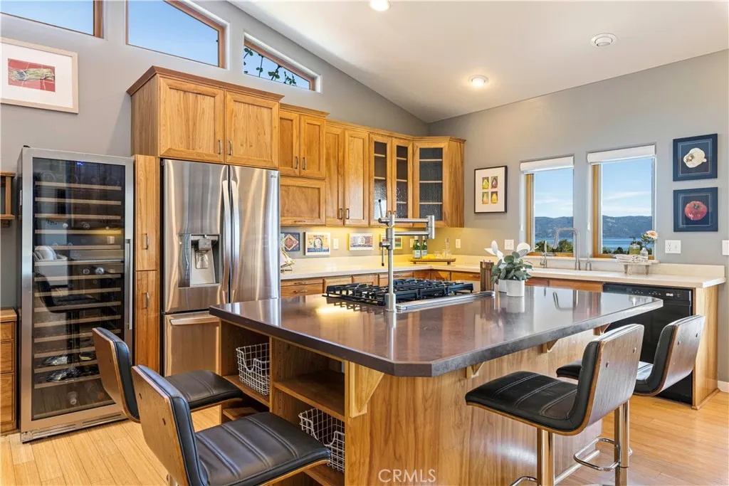 Panoramic Lake Views + Single-Level Living + Solar + Tesla Backup + Lake Access Unobstructed panoramic lake views steal the show in this architect-designed single-level home, where soaring ceilings and expansive Milgard sliding glass doors create a bright, open living space that brings the water into everyday living—visible from nearly every room, including the garage. Owned solar with additional photovoltaic panels and two Tesla backup batteries provide exceptional energy efficiency and impressively low annual electric costs. The interior is finished with custom kitchen cabinetry, quartz countertops, wrought iron detailing, slate decking, and designer dimmable lighting that adds warmth throughout. The well-designed floor plan offers a spacious primary suite positioned for beautiful sunrise views over the lake, complete with a seating area, direct access to the side yard and hot tub pad, a walk-in closet, and an oversized floor-to-ceiling tiled shower. Two guest bedrooms and a full bath are located down the hall. Near the garage entrance, a half bath, laundry closet, and a bonus storage room adjacent to the two-car attached garage with lake views. A covered slate deck extends the living space outdoors, with access from the kitchen, living room, and primary suite—ideal for relaxing or entertaining while taking in the view. The side yard, accessed from the primary suite, is privacy fenced with a lifetime warranty. The grounds offer raised garden beds with irrigation, a greenhouse, a new storage shed, and thoughtfully designed front landscaping with blooming shrubs throughout the year, automatic sprinklers, and a subtle water feature that adds a sense of calm on arrival. Conveniently located near the hospital and essential amenities. Lake access through a voluntary membership to a private lakefront beach area with picnic tables and restrooms, available exclusively to members. (For only $60/year). A rare opportunity to own a single-level home that combines expansive lake views, efficiency, and comfort in a truly special setting