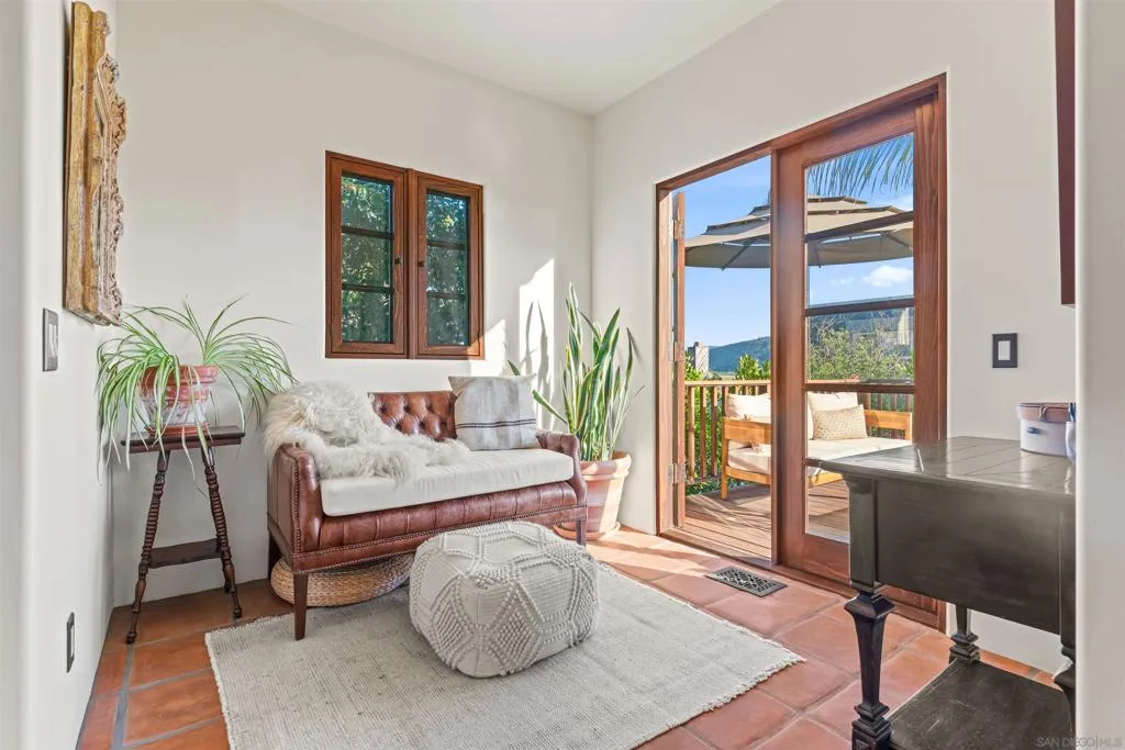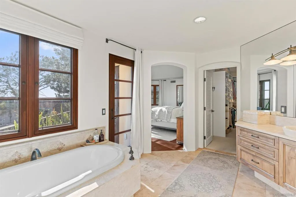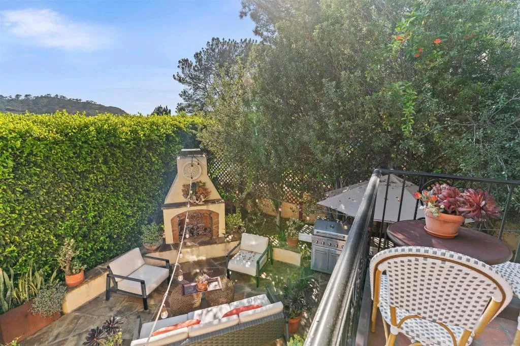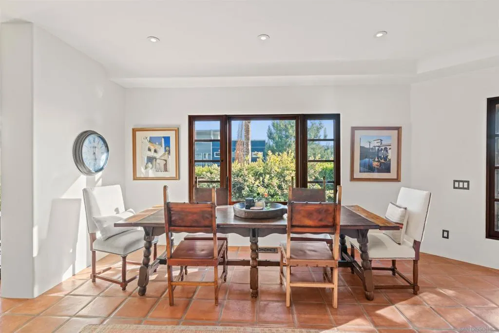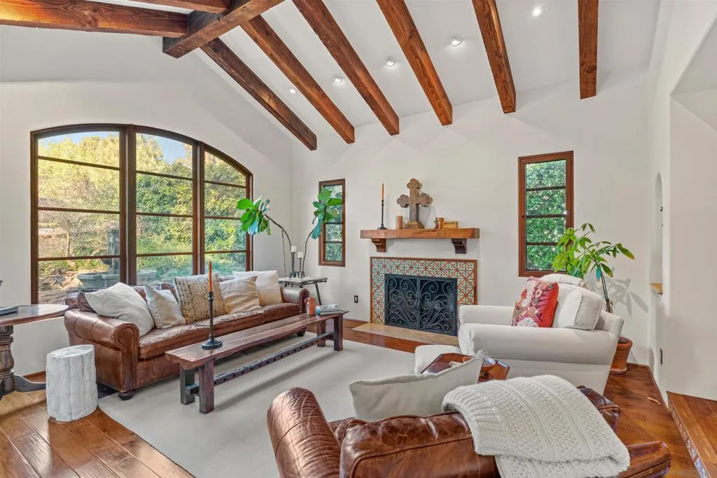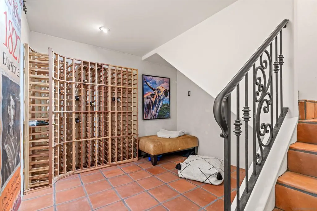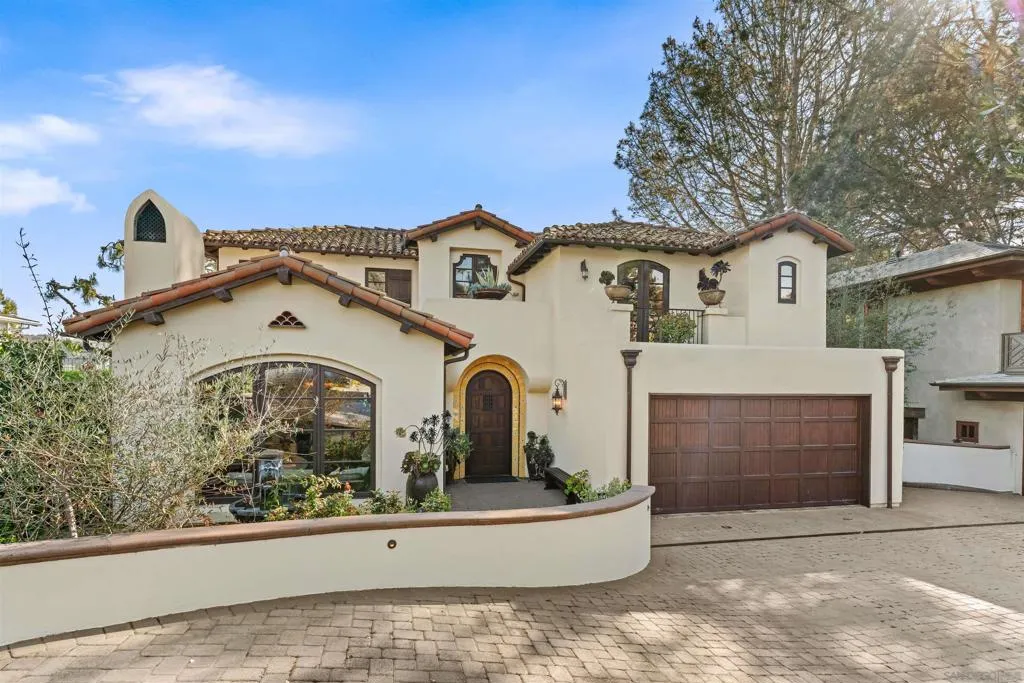 Perched above the Pacific with front-row views of Torrey Pines State Beach, this Spanish-modern residence is a rare convergence of craftsmanship, comfort, and California coastal living at its absolute finest. A sweeping private drive sets the stage, where hand-laid tilework, sun-warmed stucco, and a richly finished custom garage door hint at the artistry within. Inside, soaring ceilings and abundant natural light frame a grand staircase dressed in bespoke Spanish tile risers. The front living room stuns with wood-beam ceilings and wrap-around windows — equally suited for lively gatherings or slow Sunday mornings. A gracious dining room flows into a handsome wet bar, where generous storage makes entertaining feel entirely effortless. The west-facing great room opens to a Juliet balcony with sweeping ocean views, anchored by a chef's kitchen featuring marble countertops, custom cabinetry, and premium appliances. A tucked-away reading nook leads to the main ocean-view deck — made for morning coffee and golden-hour sunsets. Below, a fireplace patio unfolds into dining and lounge areas built for unhurried California living. A lower-level flex space serves as a wine cellar and fitness room, while upstairs, four bedrooms offer comfort and privacy. A self-contained guest suite with its own staircase and full bath completes the picture.