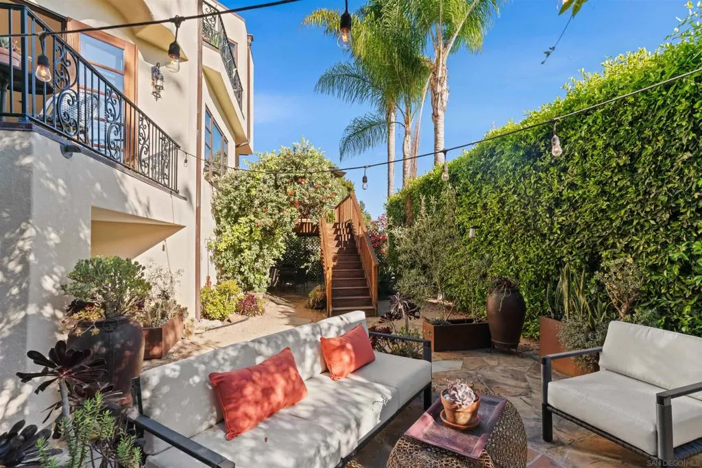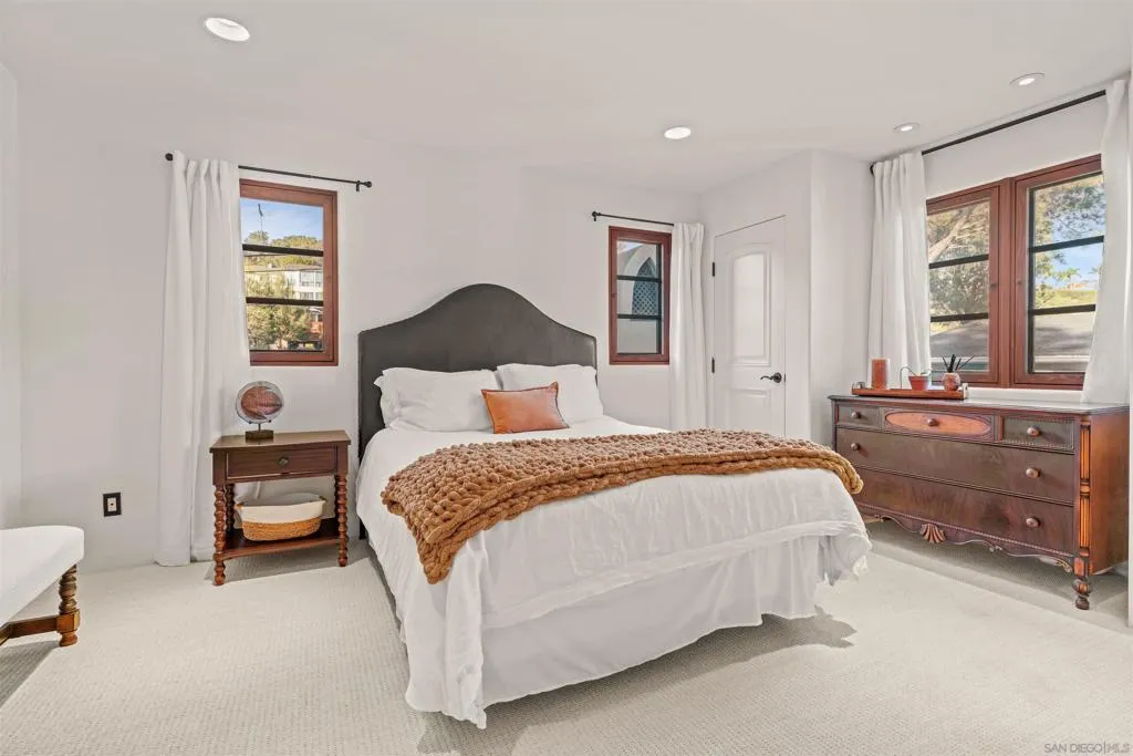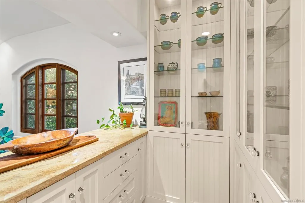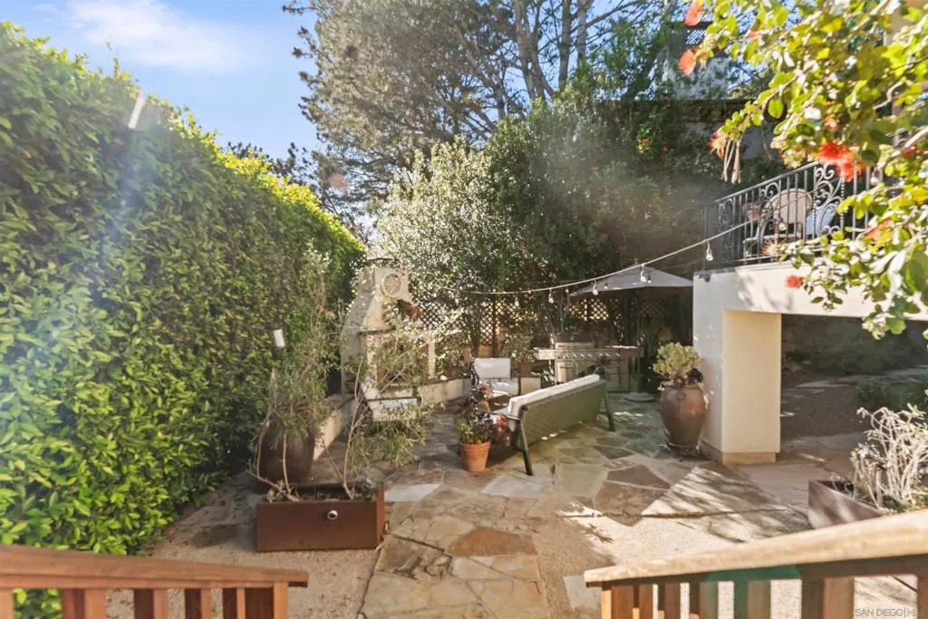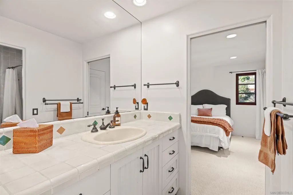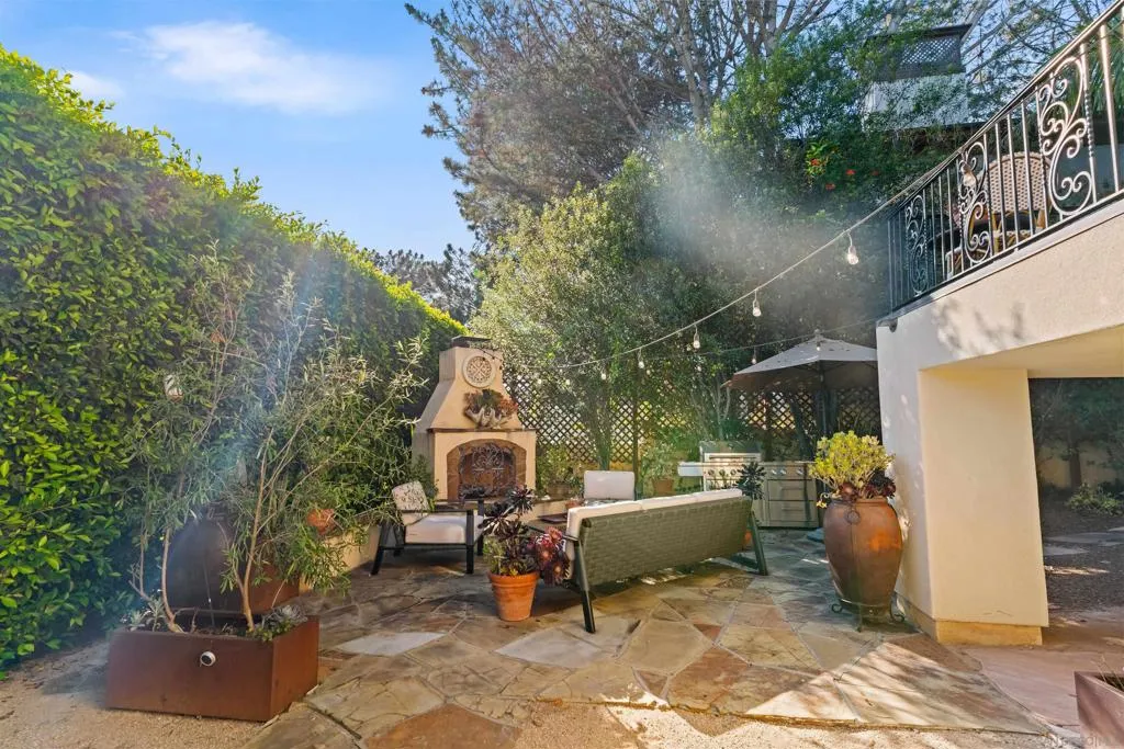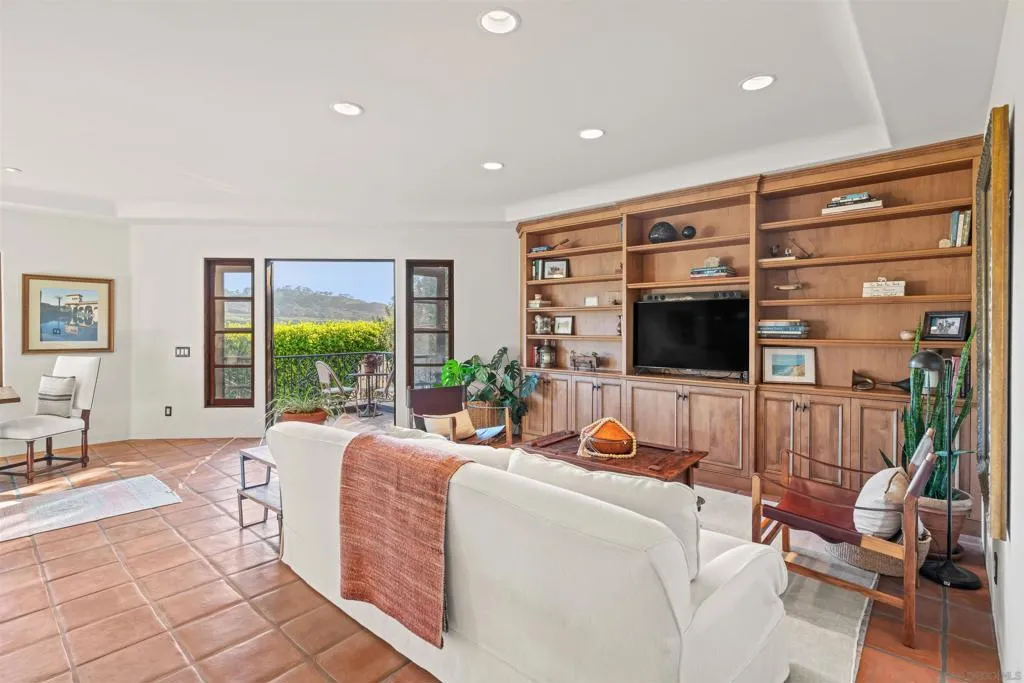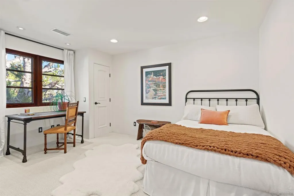 Perched above the Pacific with front-row views of Torrey Pines State Beach, this Spanish-modern residence is a rare convergence of craftsmanship, comfort, and California coastal living at its absolute finest. A sweeping private drive sets the stage, where hand-laid tilework, sun-warmed stucco, and a richly finished custom garage door hint at the artistry within. Inside, soaring ceilings and abundant natural light frame a grand staircase dressed in bespoke Spanish tile risers. The front living room stuns with wood-beam ceilings and wrap-around windows — equally suited for lively gatherings or slow Sunday mornings. A gracious dining room flows into a handsome wet bar, where generous storage makes entertaining feel entirely effortless. The west-facing great room opens to a Juliet balcony with sweeping ocean views, anchored by a chef's kitchen featuring marble countertops, custom cabinetry, and premium appliances. A tucked-away reading nook leads to the main ocean-view deck — made for morning coffee and golden-hour sunsets. Below, a fireplace patio unfolds into dining and lounge areas built for unhurried California living. A lower-level flex space serves as a wine cellar and fitness room, while upstairs, four bedrooms offer comfort and privacy. A self-contained guest suite with its own staircase and full bath completes the picture.