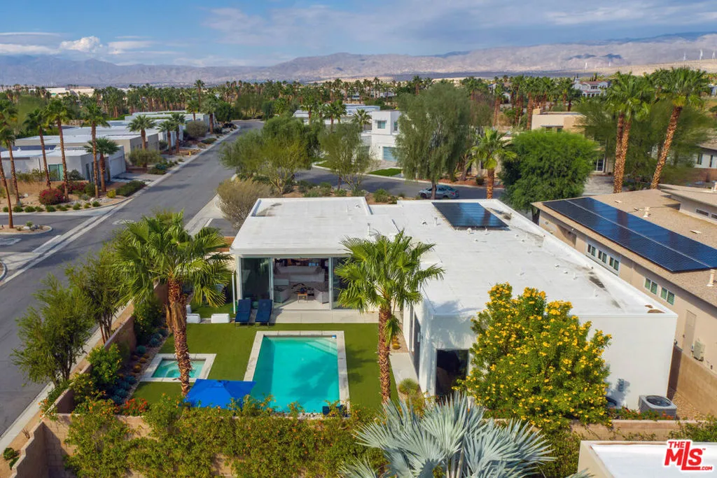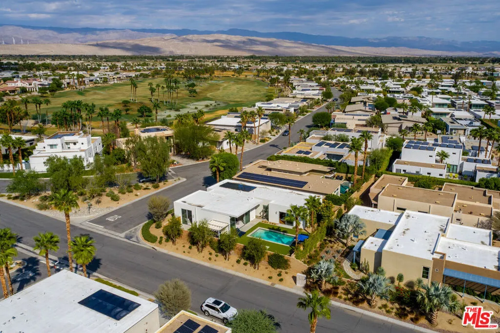 Welcome to "The Escena Marvel", a true jewel box home within the Escena community of Palm Springs. This stunning home showcases the award-winning "Garden/Gallery" Model by Alta Verde, celebrated with top honors from the National Association of Home Builders for its exquisite design and innovative architecture. This private modern oasis blends striking design with luxurious comfort, featuring an open-concept layout framed by walls of glass that offer breathtaking views of the San Jacinto Mountains. As you step inside, you'll discover a masterfully designed open-concept interior, where clean lines and abundant natural light set the tone for elevated desert living. Expansive Fleetwood sliding glass doors seamlessly merge indoor and outdoor spaces, while high ceilings and gallery-style walls provide the perfect backdrop for art and design. The minimalist kitchen is a true showpiece, featuring custom European cabinetry, a waterfall-edge island, and sleek, seamless finishes perfectly balancing function and beauty. The great room exudes timeless elegance, gallery lighting perfect for grand entertaining or intimate evenings. In the primary suite enjoy a retreat-like atmosphere where oversized windows capture curated garden views and majestic Mountain views, and a spa-inspired bath that provides a sanctuary for relaxation. Additional guest rooms reflect the home's modern ethos serene, flexible, and filled with natural light.The home features upgraded solar panels that are fully owned, significantly reducing your carbon footprint while maximizing savings. Outside, this jewel box home embraces a resort-inspired paradise. The architectural "L-shape" gracefully surrounds a sparkling pool and spa, complemented by meticulously landscaped desert gardens and tranquil lounging areas. Panoramic views of the San Jacinto Mountains provide a stunning backdrop, ensuring every sunset feels cinematic and every gathering memorable. Enhancing its allure, "The Escena Marvel" is equipped with cutting-edge smart home technology. Remotely control the garage door, sprinkler irrigation, thermostat, spa and pool lightings, as well as the landscape lights, ensuring convenience and a seamless, modern lifestyle.Living in Escena means enjoying one of Palm Springs' premier gated communities, complete with access to a championship golf course, a stylish clubhouse featuring dining at Escena Lounge & Grill, dog parks, biking trails, and beautifully maintained grounds. All of this is just minutes from downtown Palm Springs, the airport, and an array of entertainment and dining options.This property's bio communicates its luxurious amenities, modern design, and incredible lifestyle, along with sustainable living solutions. Whether looking to entertain or find a serene refuge, "The Escena Marvel" promises an unparalleled living experience in the heart of the desert.