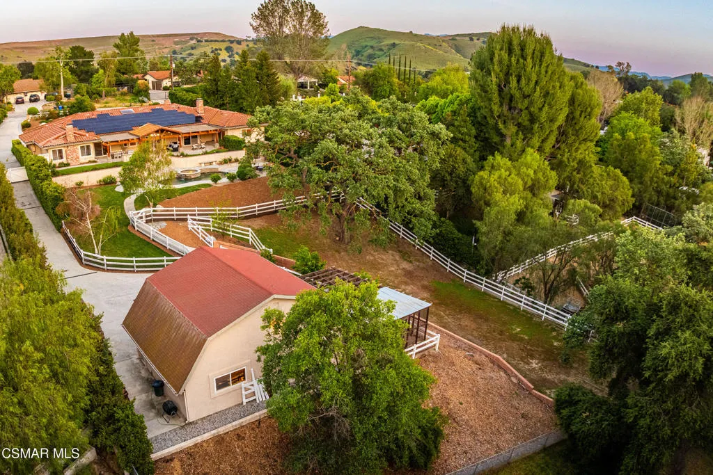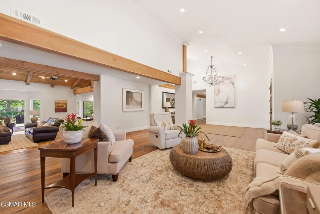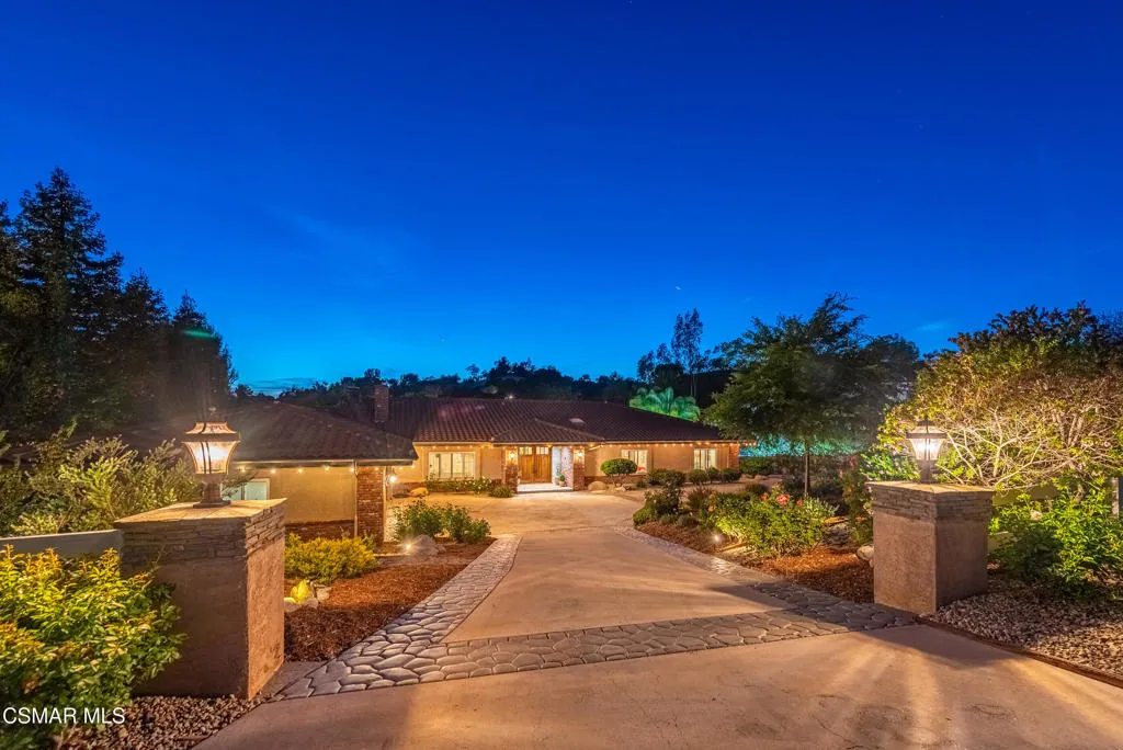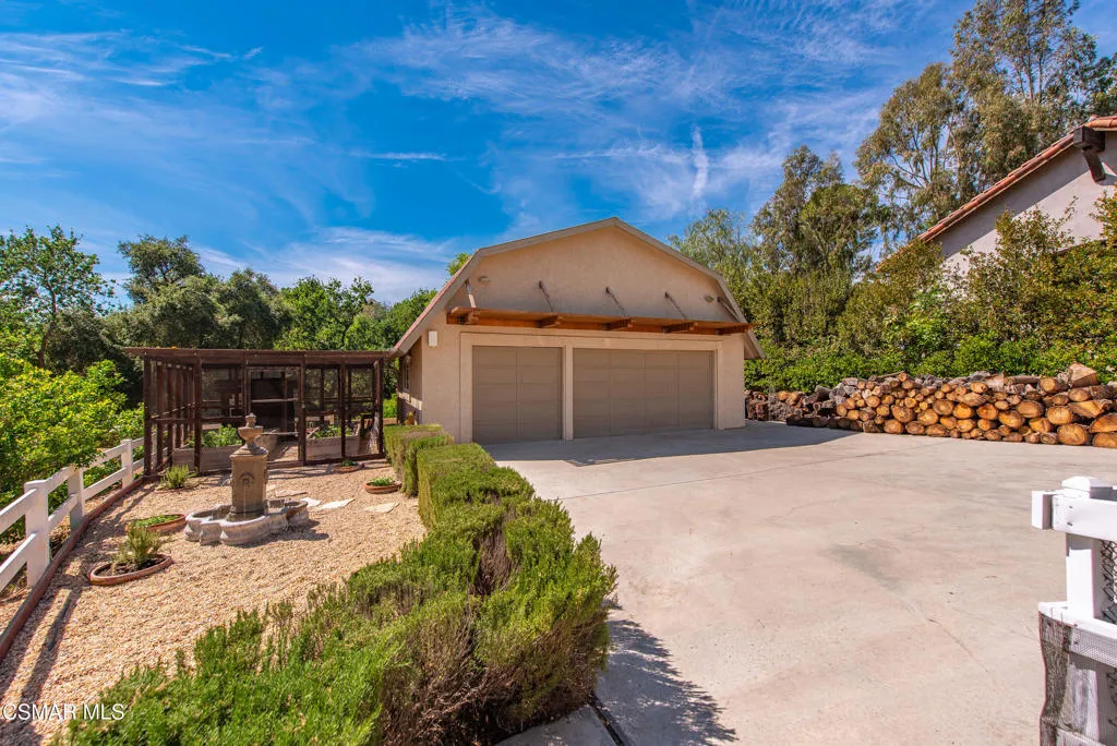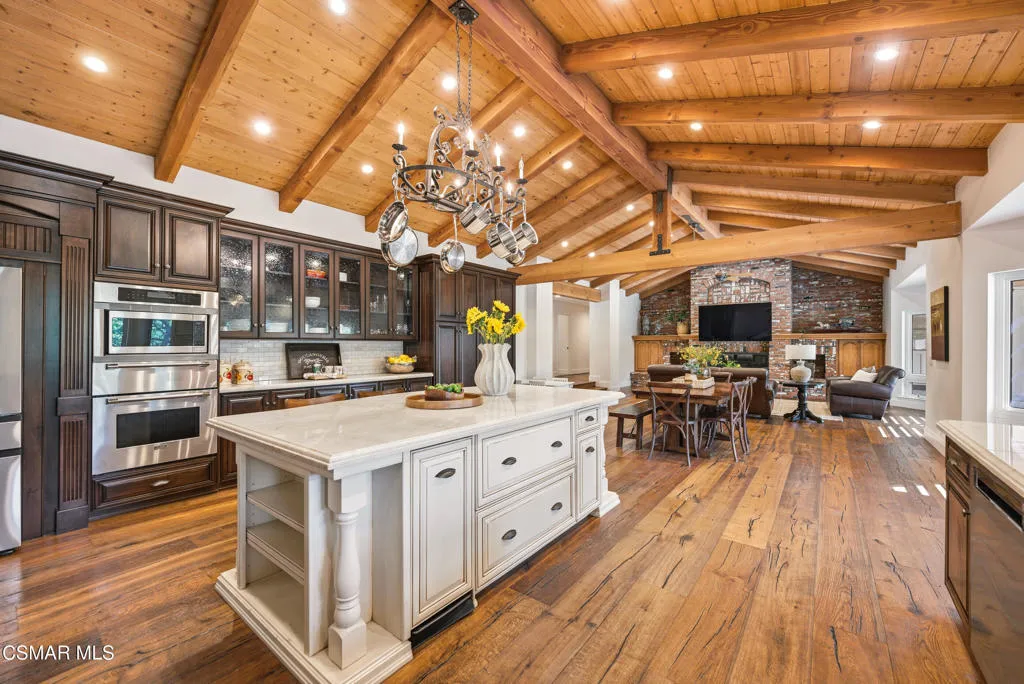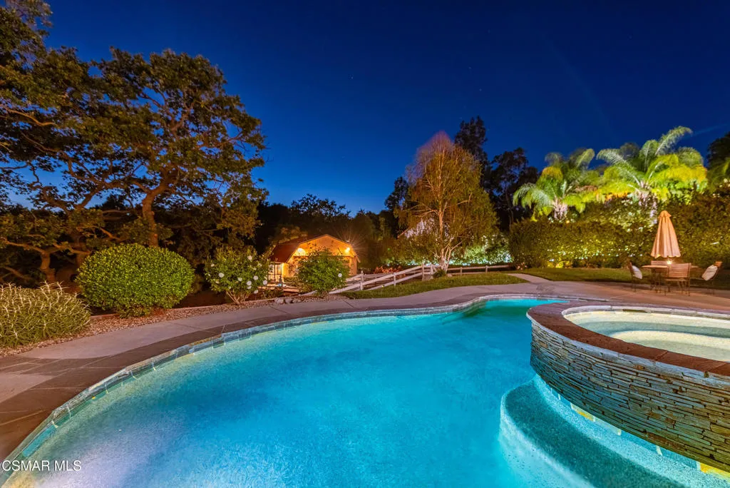 Tucked in the foothills of the Santa Monica Mountains, this sprawling single-story custom estate sits on a vibrant acre of land in the heart of charming Old Agoura. Encompassing 5,476 square feet of relaxed elegance, the property offers a pool and spa, circular driveway, and six garage spaces, including a detached three-car garage with its own gated driveway, perfect for a workshop, barn, or future ADU. Inside, the home exudes warmth and timeless style, where peaked wood-beamed ceilings, wide-plank walnut floors, natural stone counters, and three inviting fireplaces create an atmosphere of comfortable sophistication. The gourmet kitchen is a dream for those who love to cook and entertain, showcasing an eight-foot island, natural stone quartz counters with double ogee edge, a Thermador Professional gas range, two dishwashers, an imported Shaws sink, and a generous amount of cabinetry. The lovely primary suite takes in tranquil views of rolling hills and features a stone fireplace and direct access to the back patio. The home lives primarily as a single story, with stairs leading to a lower-level en-suite bedroom and bath, complete with its own private entrance off the backyard. Additional highlights include an exceptionally large laundry and mudroom, an oversized walk-in storage room not counted as a bedroom, and an owned solar system that includes 3 power wall batteries. Step outside to the covered patio overlooking the pool and landscaped grounds, where there's ample space for horses and a charming, enclosed vegetable garden with chicken coop. Life here can move at an easier pace, where long walks among gentle hills and mature trees make each day feel grounded and connected. Old Agoura is a treasured gem, a picturesque rural community just minutes from shopping, dining, and schools. Enjoy nearby hiking, cycling, or horseback riding at adjacent 4,000-acre Cheeseboro National Park, or be at the beach in about 20 minutes. Located in the award-winning Las Virgenes School District and close to excellent private schools, this property offers the best of both worlds, city close yet a world away.