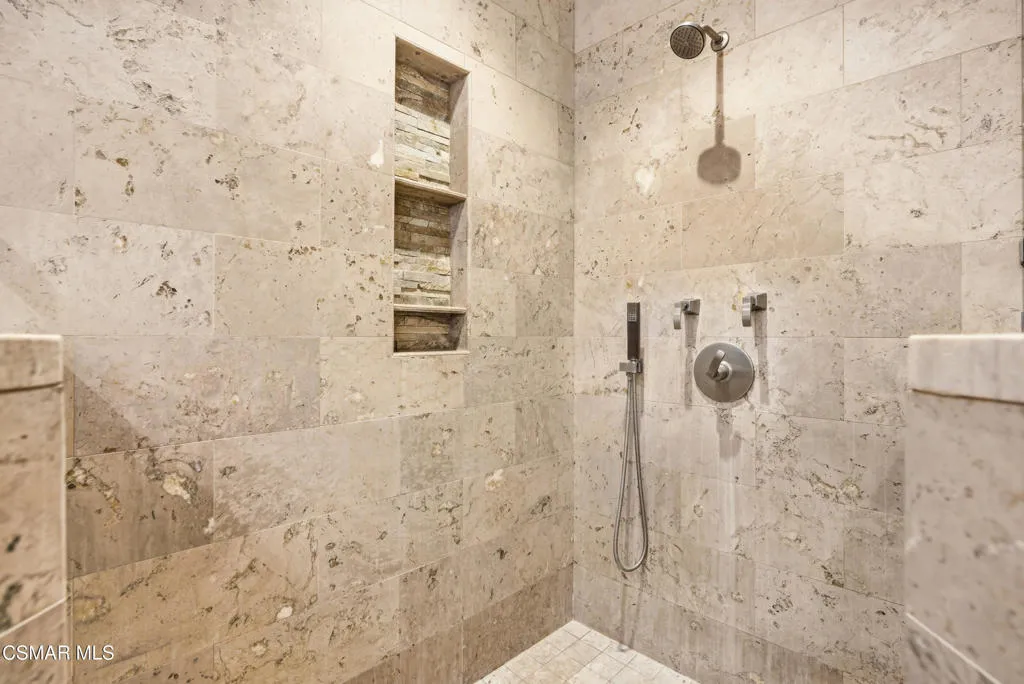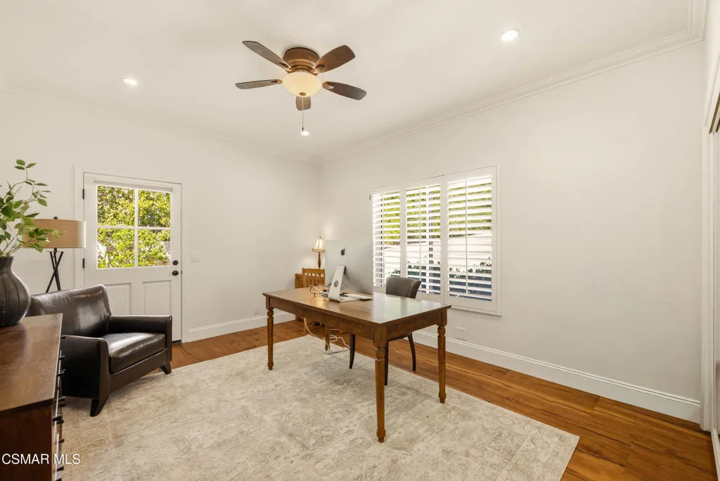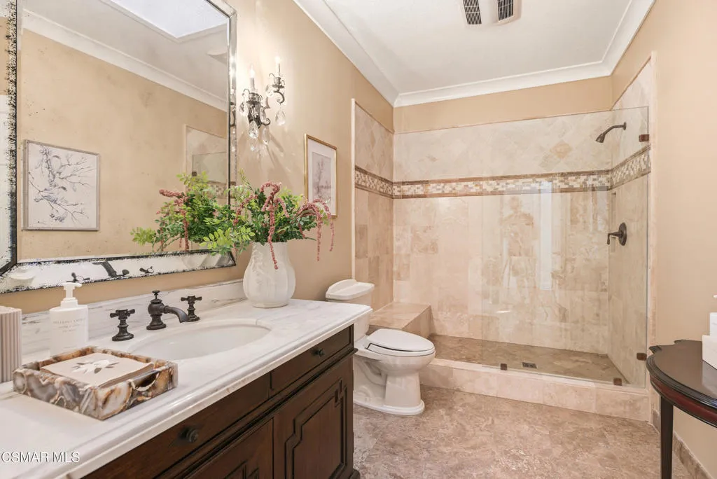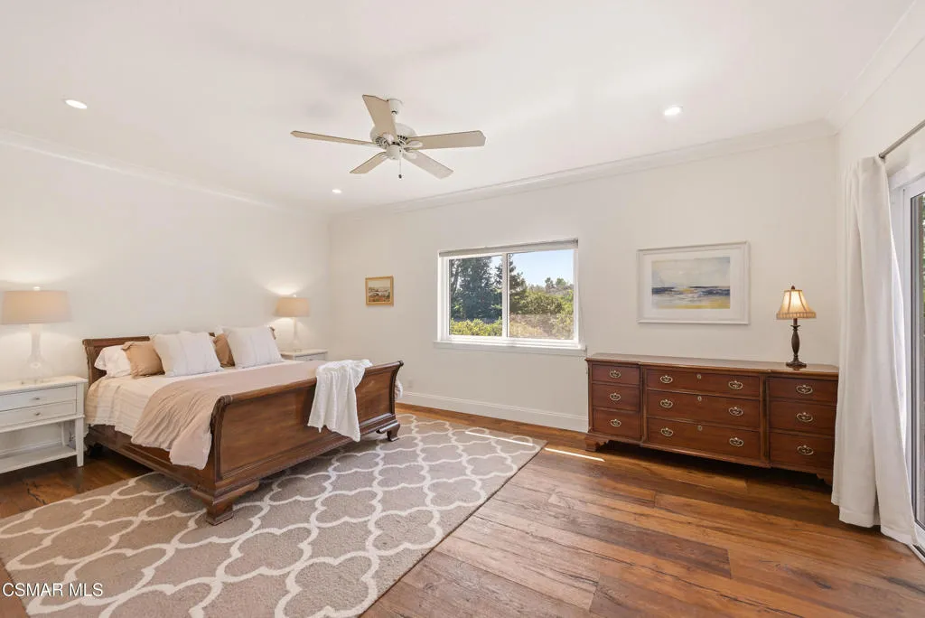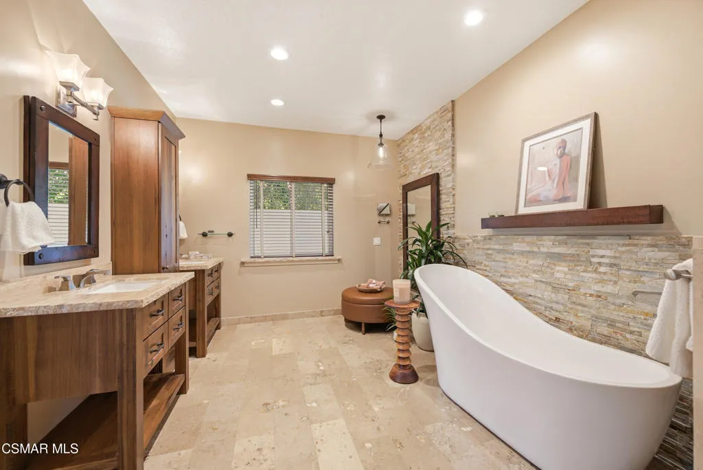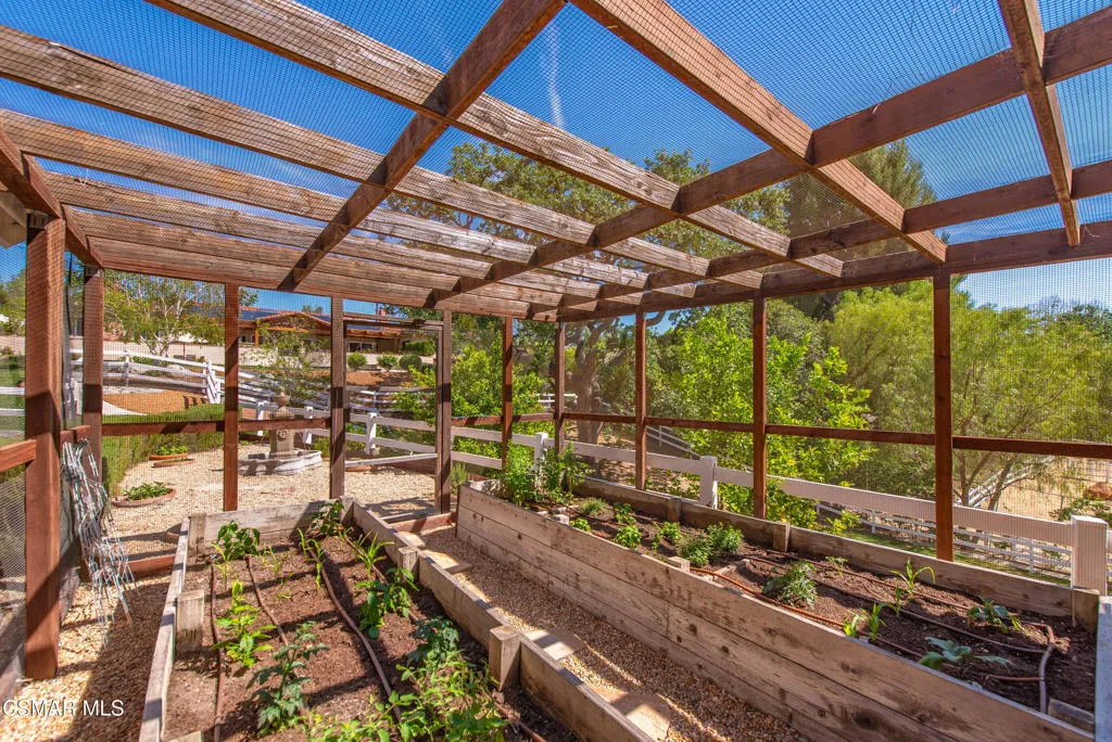 Tucked in the foothills of the Santa Monica Mountains, this sprawling single-story custom estate sits on a vibrant acre of land in the heart of charming Old Agoura. Encompassing 5,476 square feet of relaxed elegance, the property offers a pool and spa, circular driveway, and six garage spaces, including a detached three-car garage with its own gated driveway, perfect for a workshop, barn, or future ADU. Inside, the home exudes warmth and timeless style, where peaked wood-beamed ceilings, wide-plank walnut floors, natural stone counters, and three inviting fireplaces create an atmosphere of comfortable sophistication. The gourmet kitchen is a dream for those who love to cook and entertain, showcasing an eight-foot island, natural stone quartz counters with double ogee edge, a Thermador Professional gas range, two dishwashers, an imported Shaws sink, and a generous amount of cabinetry. The lovely primary suite takes in tranquil views of rolling hills and features a stone fireplace and direct access to the back patio. The home lives primarily as a single story, with stairs leading to a lower-level en-suite bedroom and bath, complete with its own private entrance off the backyard. Additional highlights include an exceptionally large laundry and mudroom, an oversized walk-in storage room not counted as a bedroom, and an owned solar system that includes 3 power wall batteries. Step outside to the covered patio overlooking the pool and landscaped grounds, where there's ample space for horses and a charming, enclosed vegetable garden with chicken coop. Life here can move at an easier pace, where long walks among gentle hills and mature trees make each day feel grounded and connected. Old Agoura is a treasured gem, a picturesque rural community just minutes from shopping, dining, and schools. Enjoy nearby hiking, cycling, or horseback riding at adjacent 4,000-acre Cheeseboro National Park, or be at the beach in about 20 minutes. Located in the award-winning Las Virgenes School District and close to excellent private schools, this property offers the best of both worlds, city close yet a world away.