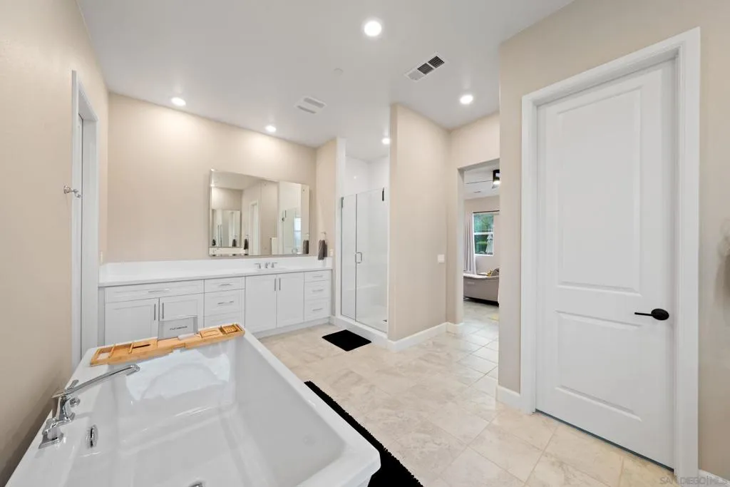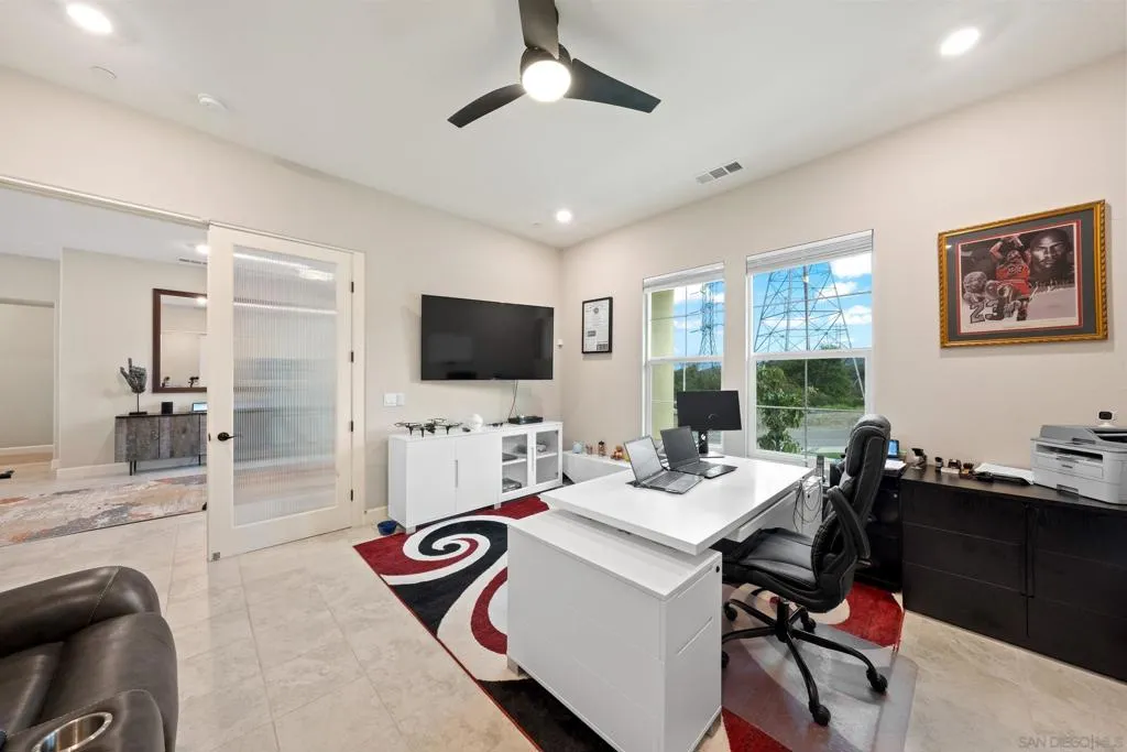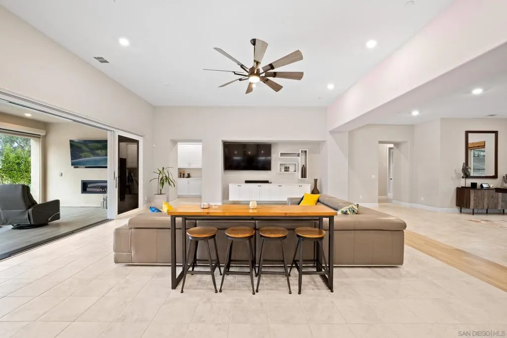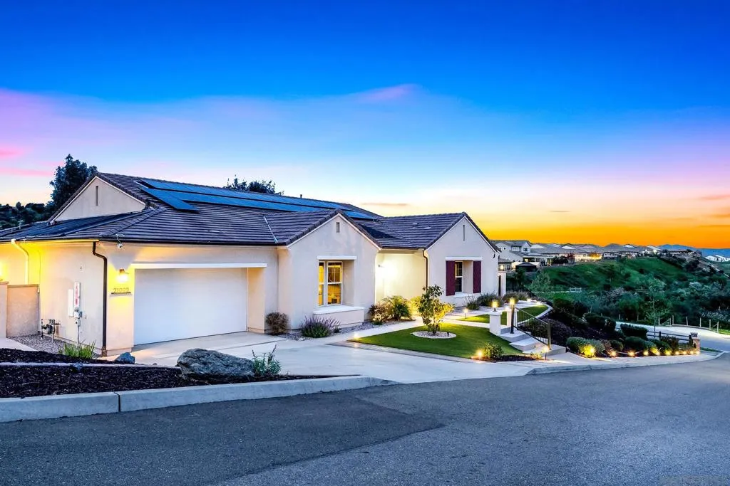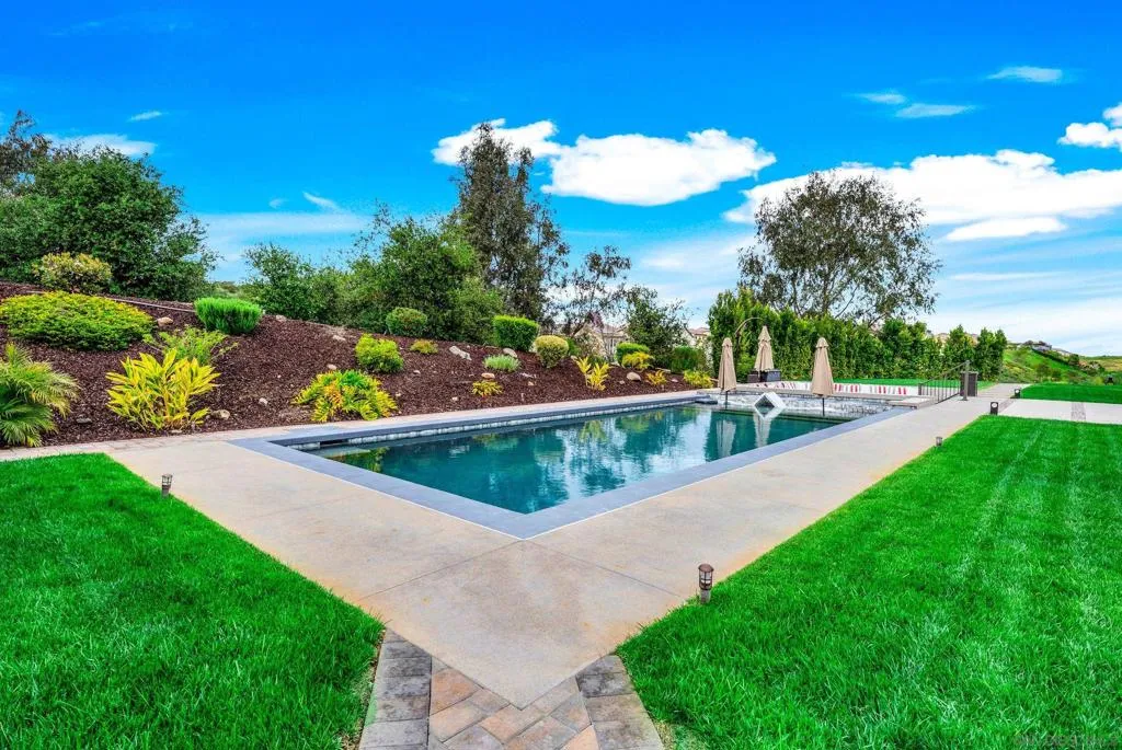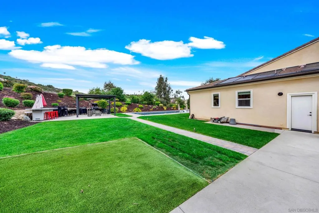 Exceptional single-story smart home on 1.5 private, view-filled acres, fully fenced and located on an elevated cul-de-sac with only two neighboring residences. This 2020 Lennar home features nearly $300,000 in resort-style landscaping, a saltwater pool and spa, and a dramatic fire-pit lounge with seating for 30—ideal for entertaining. Three-car garage with total parking for seven vehicles. Paid solar with Tesla batteries powers the estate and heats the pool/spa year-round. Elevated for sweeping vistas, privacy, and refined modern living. See supplement. Crafted for those who value privacy, luxury, and effortless indoor–outdoor living, this stunning single-story residence sits on beautifully landscaped grounds designed for true resort-style enjoyment. A custom saltwater pool and spa anchor the backyard, complemented by a dramatic fire pit with built-in seating for 30, a shaded pergola lounge, and a designer mobile outdoor kitchen for seamless al fresco dining. A gated side access with steps adds convenience and flow. Inside, soaring ceilings and natural light create an inviting, modern atmosphere. The great room features disappearing glass walls that blend into a stylish California room with fireplace, outdoor TV, and motorized shades—mirrored by automated window treatments in the living area. The chef’s kitchen impresses with high-end stainless appliances, a large quartz island, custom cabinetry, and both butler’s and walk-in pantries. The dining area frames picturesque views through floor-to-ceiling windows. Four ensuite bedrooms plus a flexible bonus room offer space for an office, studio, gym, or media room. The primary suite includes elegant molding, a spa-like bath with freestanding tub, dual vanities, a frameless shower, and a generous walk-in closet. California Closet built-ins enhance the primary suite, living room, and garage. Smart-home upgrades include voice-controlled thermostat, tankless water heater, Ring doorbell, paid solar (also heating the pool), Tesla batteries, EV pre-wire, generator, self-cleaning pool robots, LED lighting, dual A/C zones, alarm system, fire sprinklers, low-energy windows, and ceiling fans in all rooms. Yard is pre-wired for additional gas/electric and includes a turf pet area. The solar/battery system produces enough energy to power the home, heat the pool, and generate credits year-round. Harmony Grove Village amenities include a resort pool, spa, clubhouse, grilling areas, multiple parks, dog park, and over two miles of scenic trails for hiking, biking, and horseback riding.