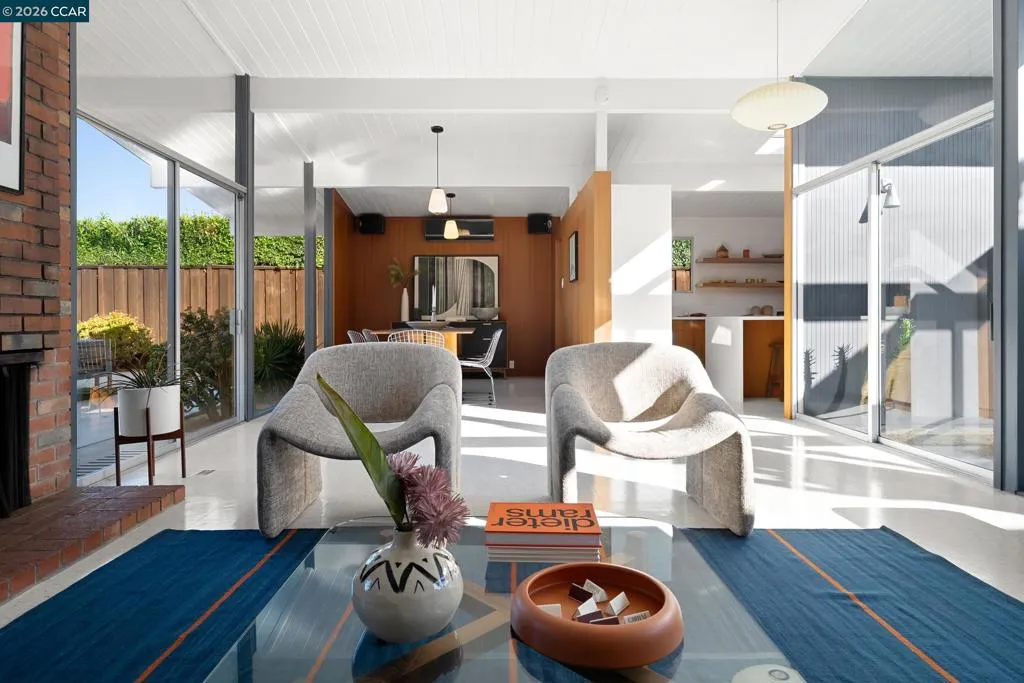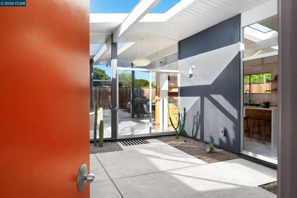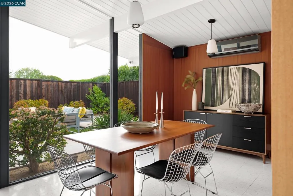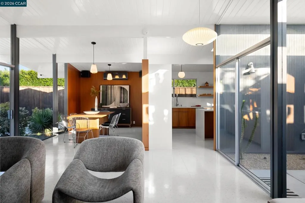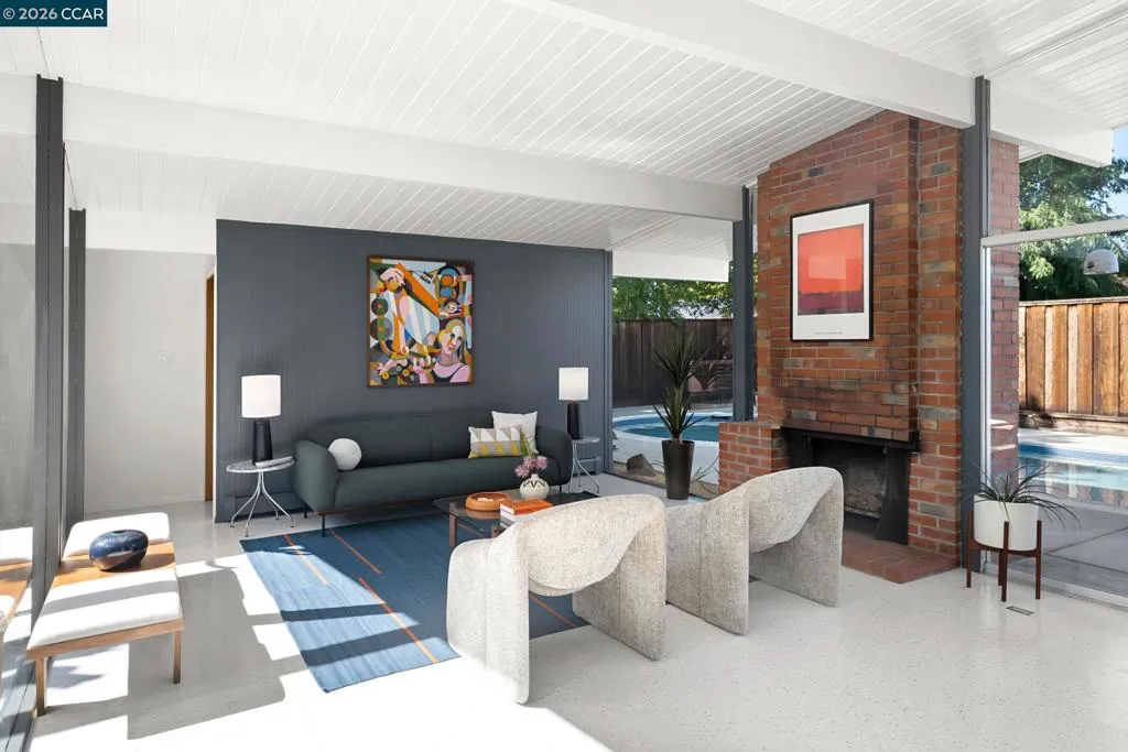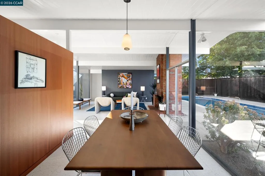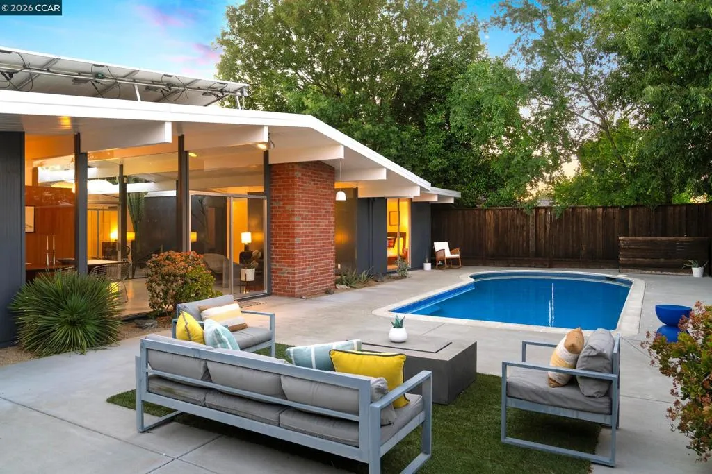 The epitome of California cool, this exceptional Eichler offers iconic mid-century modern living for the most discerning tastemakers. Built by renowned developer Joseph Eichler and designed by architects Jones & Emmons, this coveted pitched-roof, atrium, carport model, Plan OJ-1184, is an architectural offering that seamlessly blends timeless design with modern comfort. As featured in Atomic Ranch and the San Francisco Chronicle — and soon to be featured in an upcoming Eichler book, the home reflects a deep respect for its original design, enhanced by thoughtful, period-appropriate updates. Rich mahogany cabinetry by Berkeley Mills anchors the space, complemented by elegant wood paneling and classic VCT tile flooring that runs throughout, preserving its authentic mid-century character. Walls of glass flood the interiors with natural light, creating a bright and airy ambiance while fostering a seamless connection between indoor and outdoor living spaces. The signature atrium serves as a tranquil centerpiece, perfect for relaxation or entertaining. Designed for both everyday comfort and effortless hosting, the home features a chef’s kitchen with a generous island, ample pantry space, a new gas cooktop and stainless steel appliances. Additional highlights include a recently resurfaced pool, home sound system and a converted studio garage—ideal for a home office, gym, or creative retreat. Sustainability meets style with owned solar panels, allowing for energy efficiency and savings without compromising on luxury. Located in the vibrant Rancho Del Diablo community, the home enjoys picturesque surroundings with views of Mount Diablo and convenient access to BART, shopping, dining, and major freeways. Timeless design, elevated living, and unmistakable mid-century style—this is Eichler at its best.