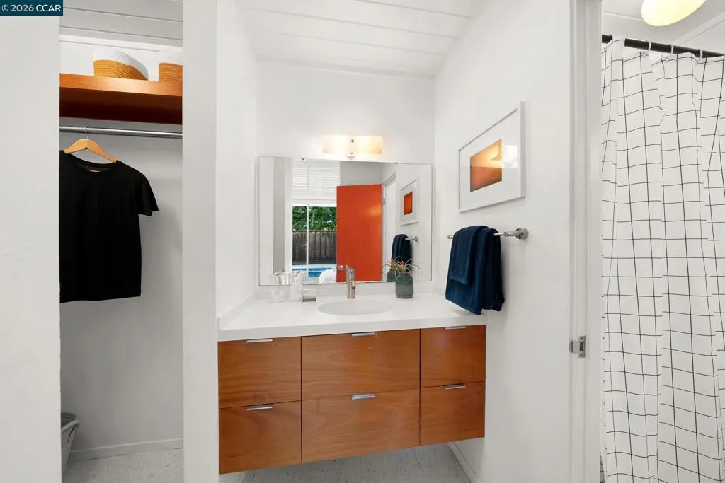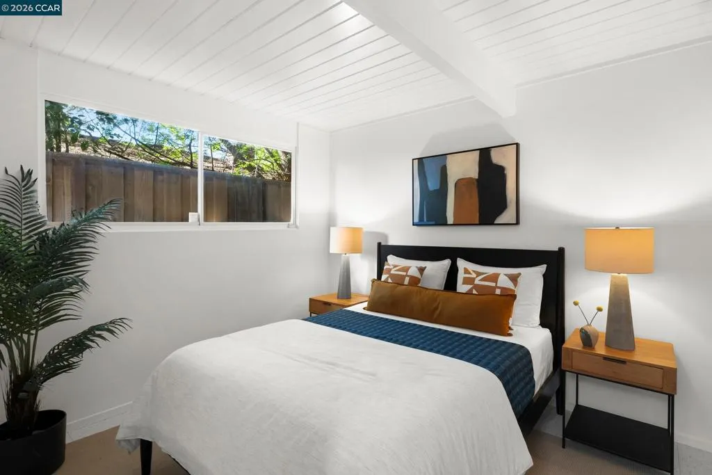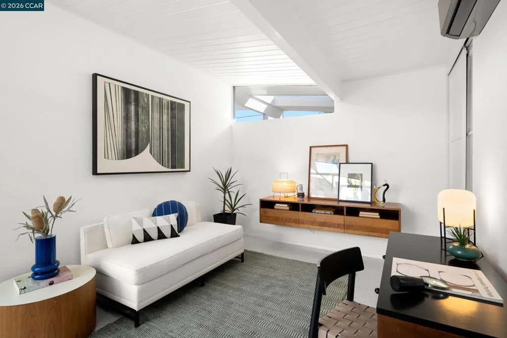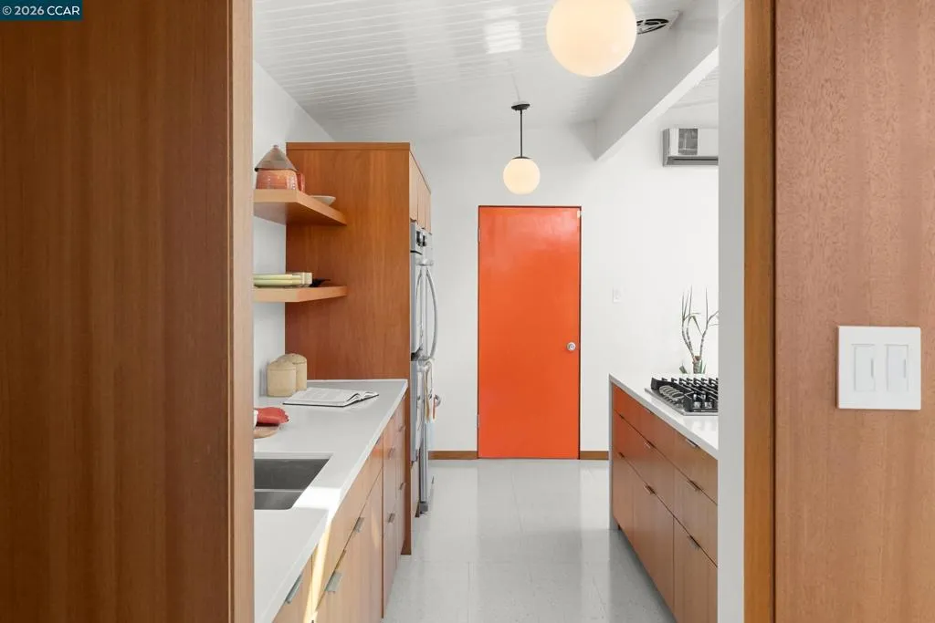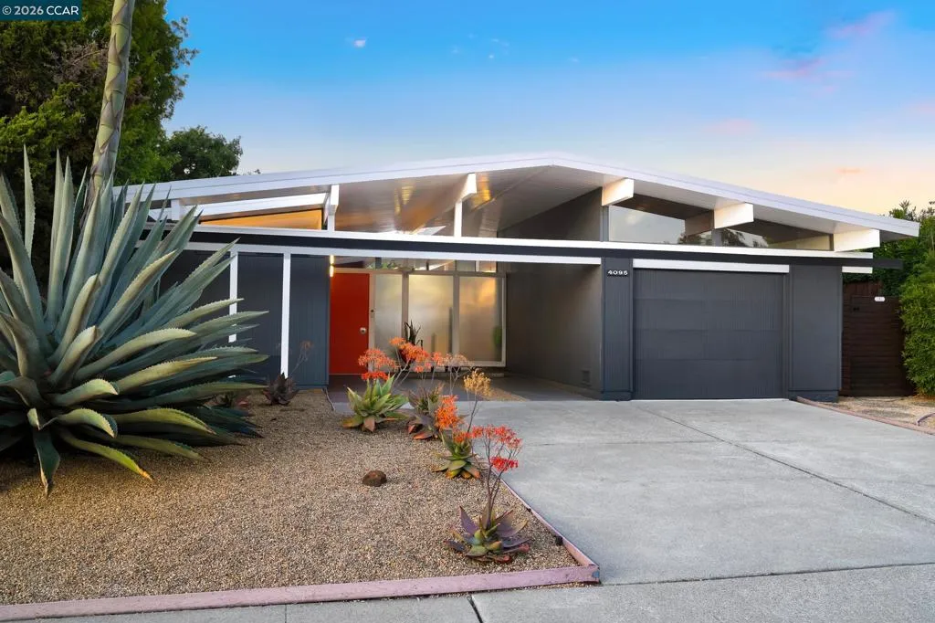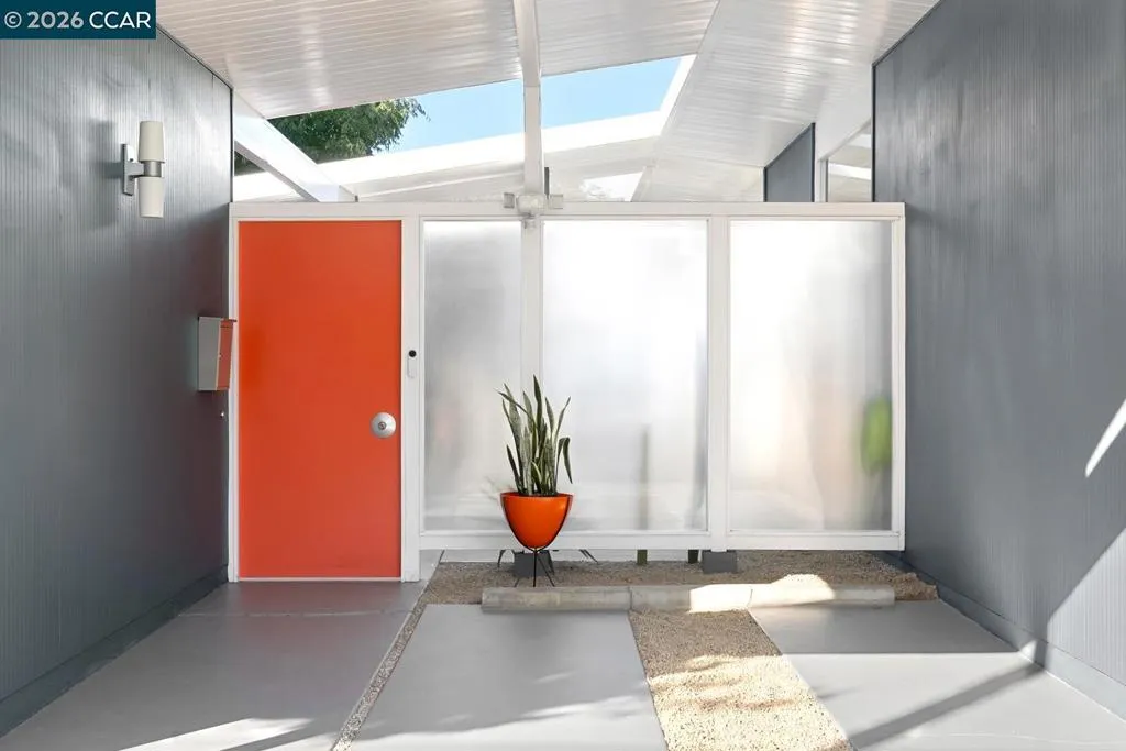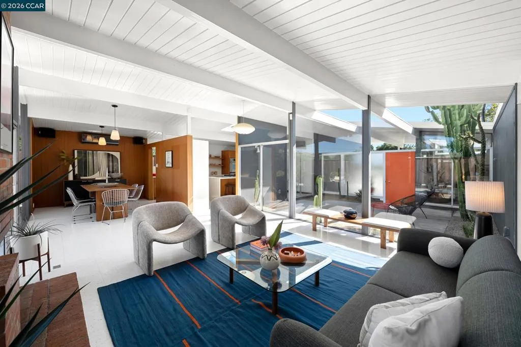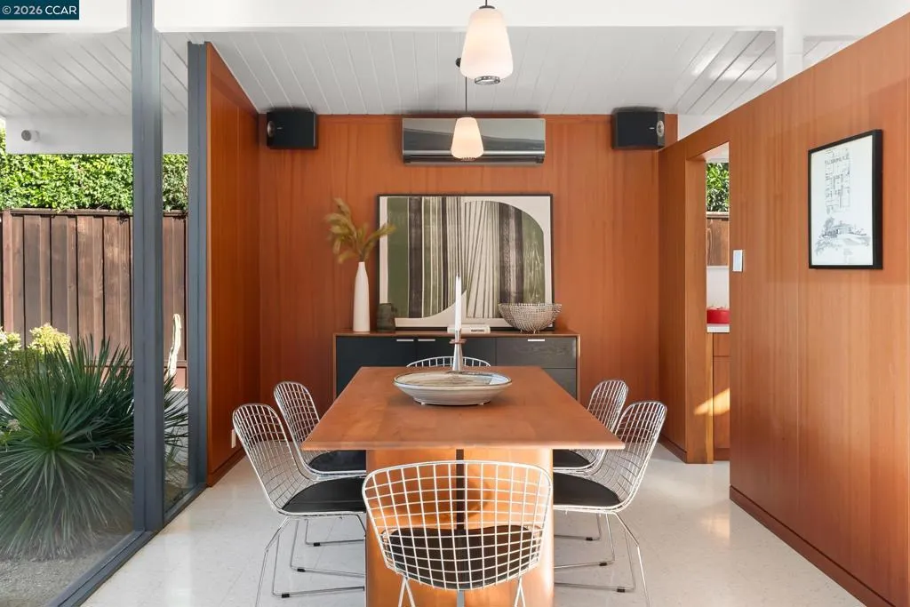 The epitome of California cool, this exceptional Eichler offers iconic mid-century modern living for the most discerning tastemakers. Built by renowned developer Joseph Eichler and designed by architects Jones & Emmons, this coveted pitched-roof, atrium, carport model, Plan OJ-1184, is an architectural offering that seamlessly blends timeless design with modern comfort. As featured in Atomic Ranch and the San Francisco Chronicle — and soon to be featured in an upcoming Eichler book, the home reflects a deep respect for its original design, enhanced by thoughtful, period-appropriate updates. Rich mahogany cabinetry by Berkeley Mills anchors the space, complemented by elegant wood paneling and classic VCT tile flooring that runs throughout, preserving its authentic mid-century character. Walls of glass flood the interiors with natural light, creating a bright and airy ambiance while fostering a seamless connection between indoor and outdoor living spaces. The signature atrium serves as a tranquil centerpiece, perfect for relaxation or entertaining. Designed for both everyday comfort and effortless hosting, the home features a chef’s kitchen with a generous island, ample pantry space, a new gas cooktop and stainless steel appliances. Additional highlights include a recently resurfaced pool, home sound system and a converted studio garage—ideal for a home office, gym, or creative retreat. Sustainability meets style with owned solar panels, allowing for energy efficiency and savings without compromising on luxury. Located in the vibrant Rancho Del Diablo community, the home enjoys picturesque surroundings with views of Mount Diablo and convenient access to BART, shopping, dining, and major freeways. Timeless design, elevated living, and unmistakable mid-century style—this is Eichler at its best.