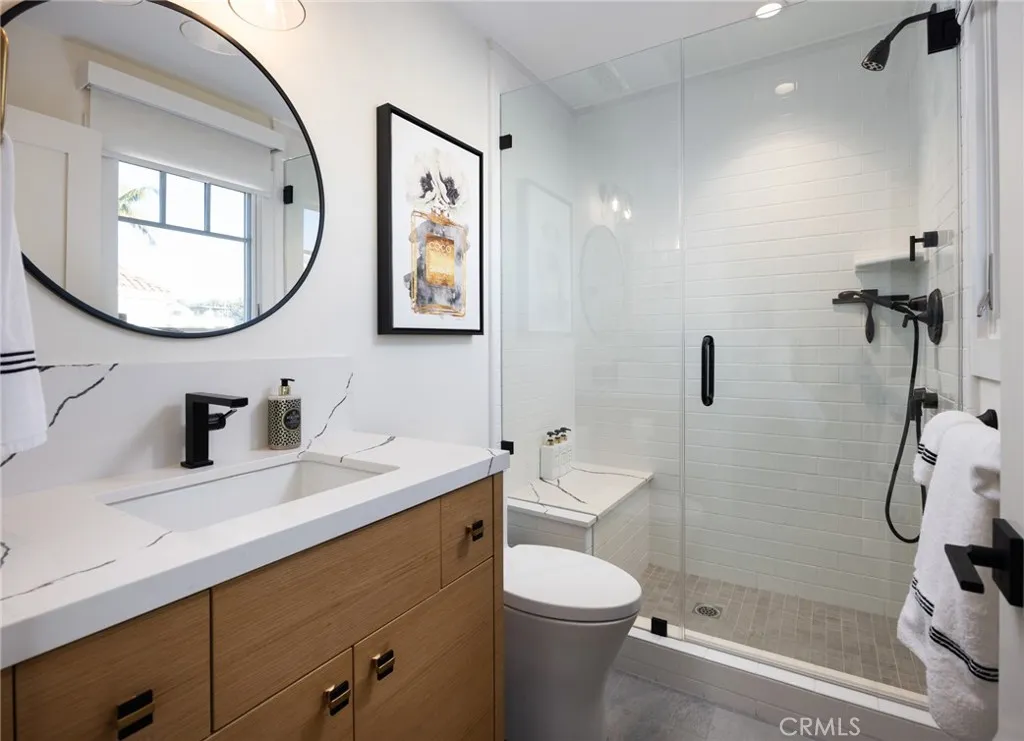 COASTAL LUXURY | PRIME FLOWER STREETS LOCATION | FULLY RENOVATED | INDOOR-OUTDOOR LIVING | Welcome to this beautifully reimagined front-unit residence in the highly sought-after Flower Streets of Corona del Mar Village. Just moments from the beach, this 3-bedroom, 3-bathroom home offers a seamless blend of timeless Cape Cod design and relaxed coastal living. Set on a prime corner lot, the home immediately impresses with its inviting presence and attention to detail. A private gate opens to an expansive front patio with a built-in BBQ, creating the perfect setting for entertaining, relaxing, and enjoying the ocean breeze. Bifold glass doors fully open to connect the outdoor space with the main living areas, filling the home with natural light and enhancing the indoor-outdoor lifestyle. At the heart of the home is a stunning chef’s kitchen designed for both function and style. Featuring custom rift white oak cabinetry, a Calacatta marble double waterfall island, and top-tier appliances including a Dacor 6-burner range with steam oven, built-in refrigerator, Miele coffee system, Sub-Zero wine cooler, and Zephyr hood with brass detailing, this space is as impressive as it is functional. Thoughtful design continues throughout, including 8-inch European white oak flooring, vaulted tongue-and-groove ceilings, custom molding, wainscoting, and detailed millwork. The open living area offers built-in bookcases, integrated speakers, a Dutch entry door, and warm, inviting spaces to gather. A main-level bedroom and full bathroom provide flexibility for guests, a home office, or multigenerational living. Upstairs, the primary suite is a true retreat with soaring cathedral ceilings, a fireplace, private balcony, and a custom walk-in closet. The spa-inspired bathroom, remodeled in 2025, features large-format quartz tile, quartz countertops, a built-in vanity, soaking tub, and a statement Capiz shell chandelier. A rooftop deck with views offers the perfect place to unwind and enjoy coastal sunsets. Additional highlights include Sonos sound, three fireplaces, whole-house water filtration, custom electric window coverings, a security system, private dog run, oversized laundry and mudroom, subterranean garage access, a one-car garage, covered carport, and ample street parking. Located just blocks from world-class beaches, restaurants, and boutique shopping, this home offers an exceptional opportunity to experience the best of Corona del Mar coastal living.