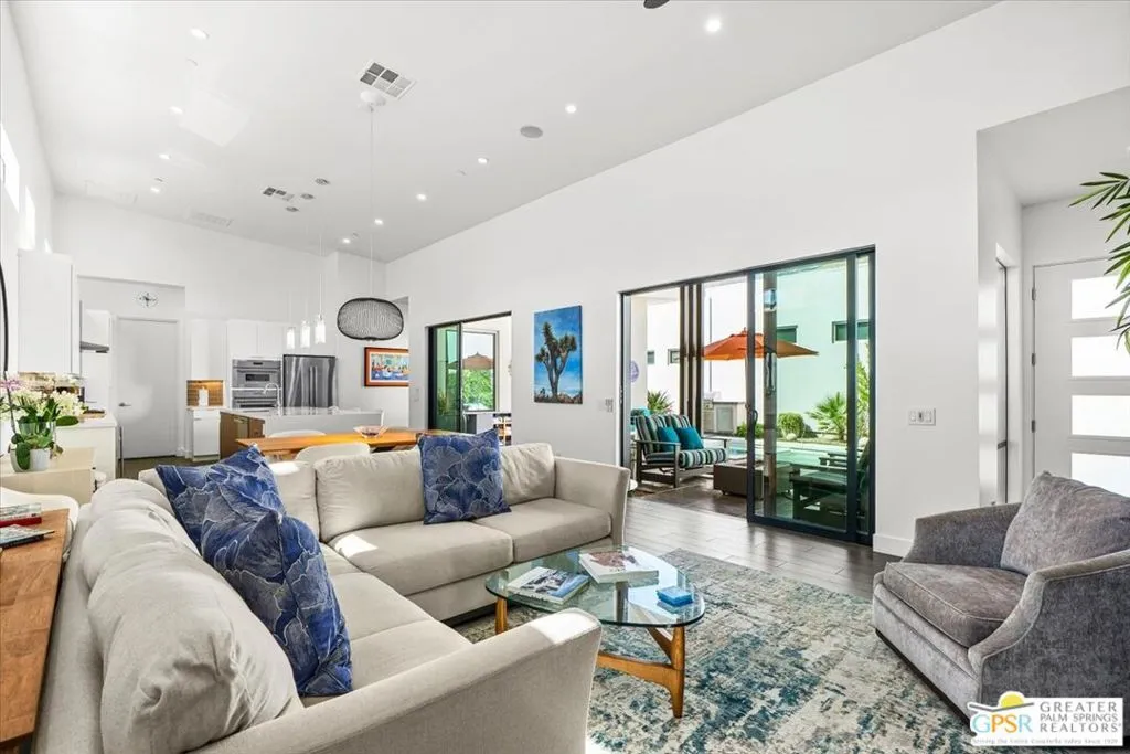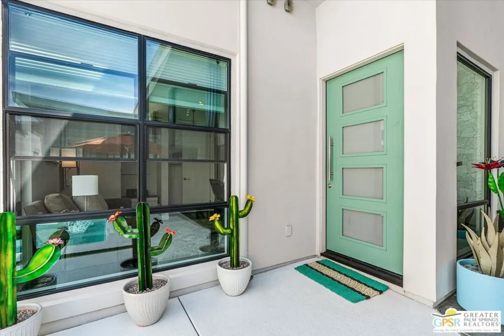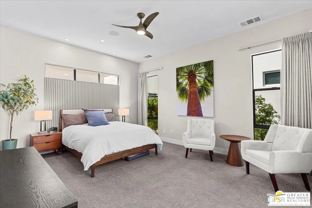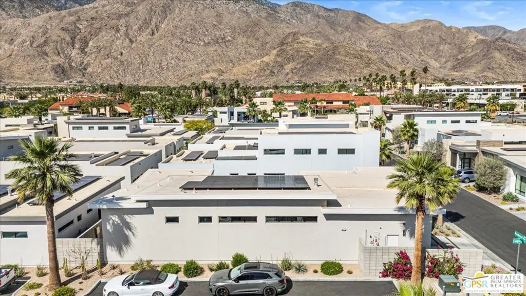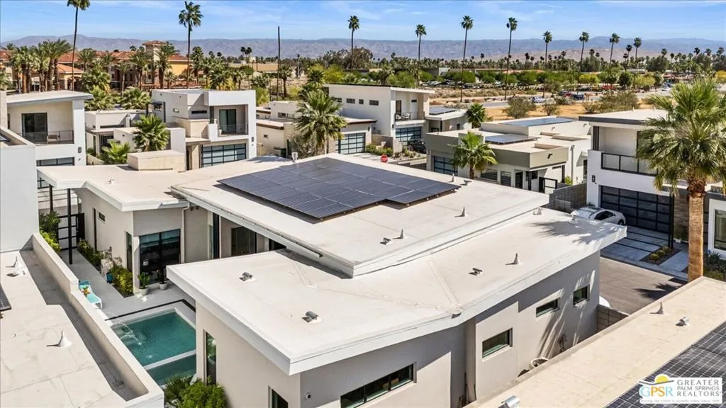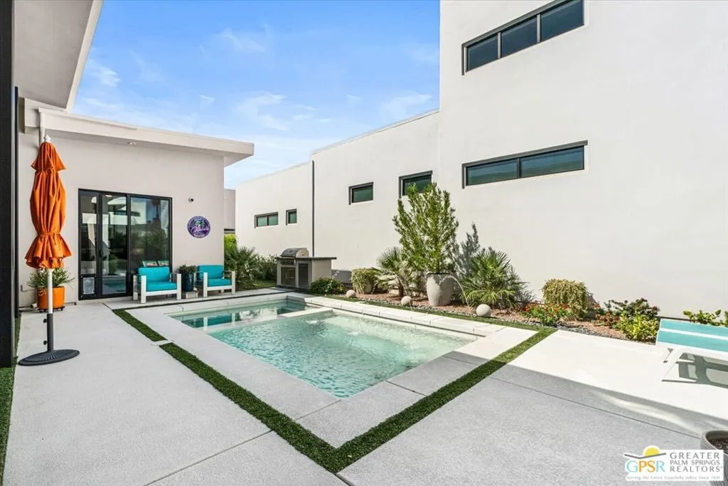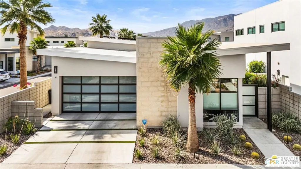 Located in the heart of vibrant Palm Springs, this modern home in the gated community of Vue is your perfect desert retreat. With 3 spacious bedrooms and 3 beautifully upgraded baths, this property is packed with luxurious features that elevate everyday living. Step inside to discover a sleek, open layout boasting a gourmet kitchen equipped with upgraded appliances, a gas fireplace for cozy evenings, and high-tech touches like electronic blinds, drapes, and a Sonos surround sound system. Ceiling fans throughout and a custom-built primary closet add both comfort and style. Outside, soak up the desert sunshine in your private oasis with dining, seating and lounging areas. The saltwater pool and spa, complete with water features and a pebble tech finish, are complemented by a Cool-Tech patio and a built-in BBQ station perfect for entertaining or unwinding under the stars. Additional perks include 34 owned solar panels with a backup battery, a full house water filtration and purification system, plus an air-conditioned, epoxy-floored 2-car garage. For added peace of mind, the home is equipped with an alarm system, cameras, a DoorBird entry system and whole house surge protection. This is more than just a home; it's a lifestyle. Don't miss your chance to own this stunning Palm Springs gem!