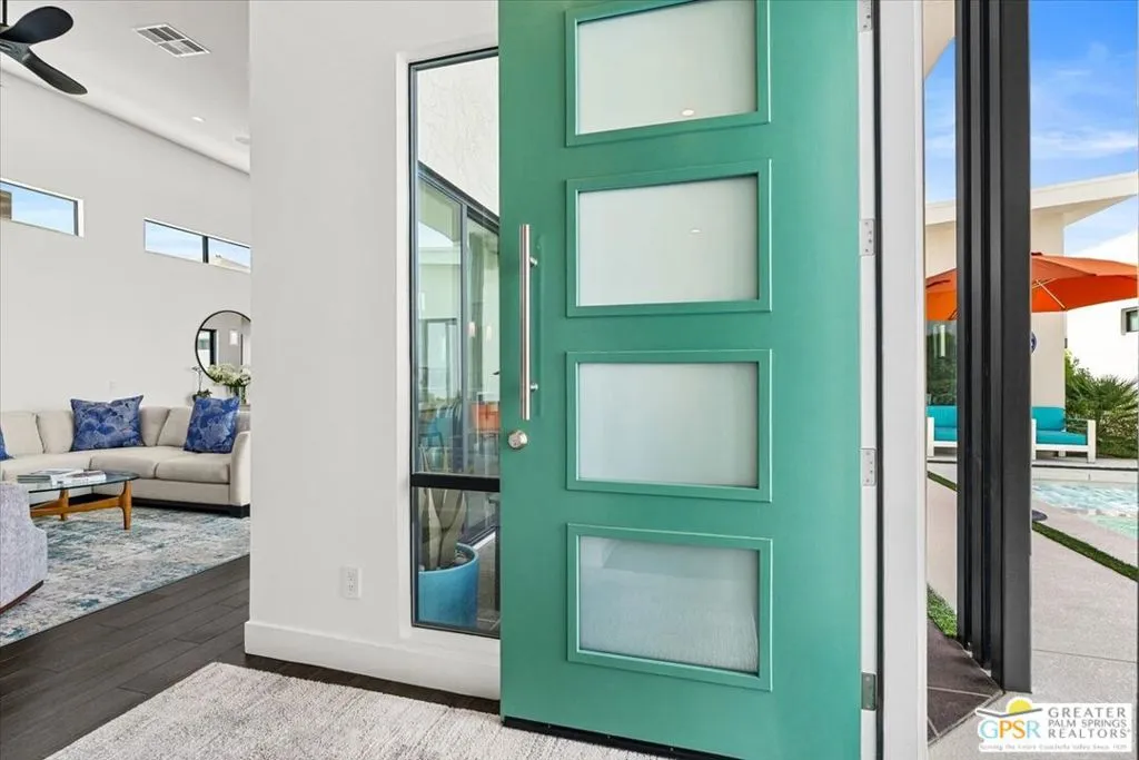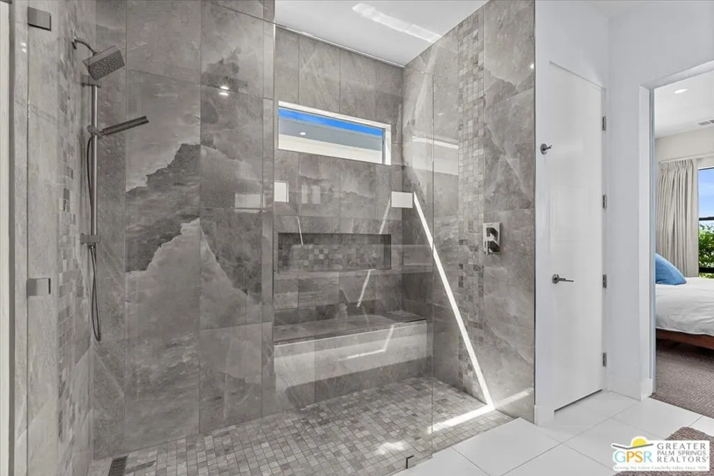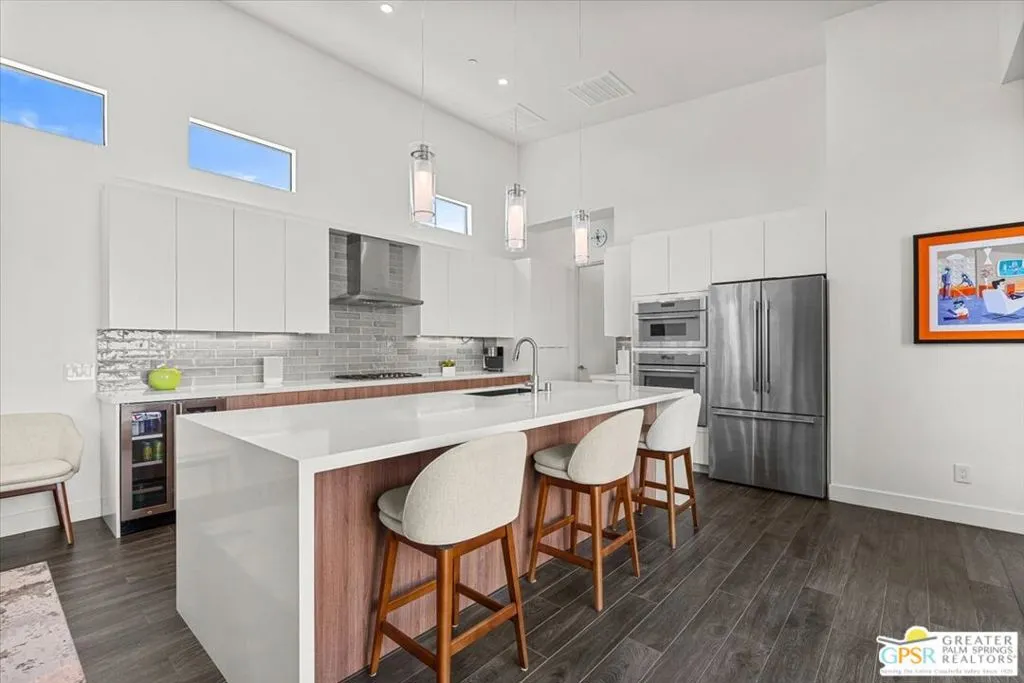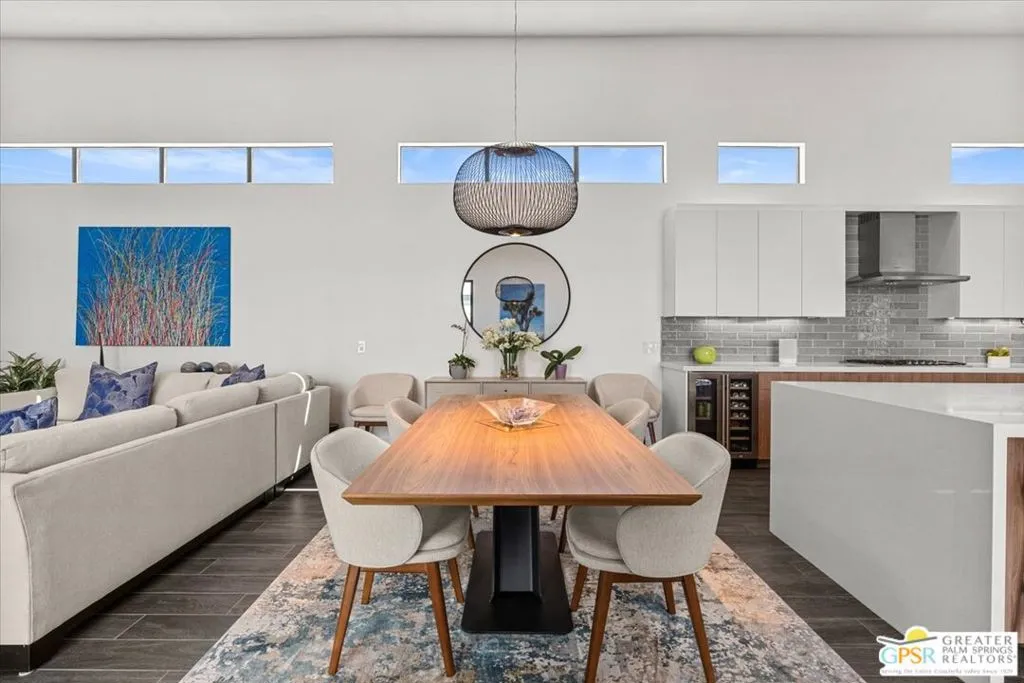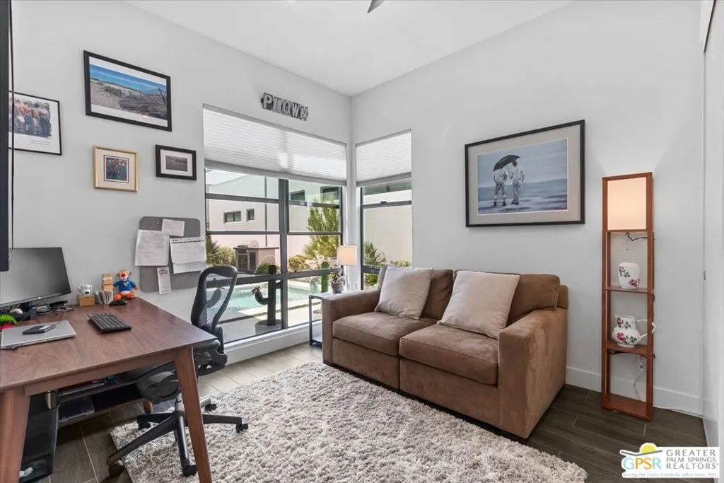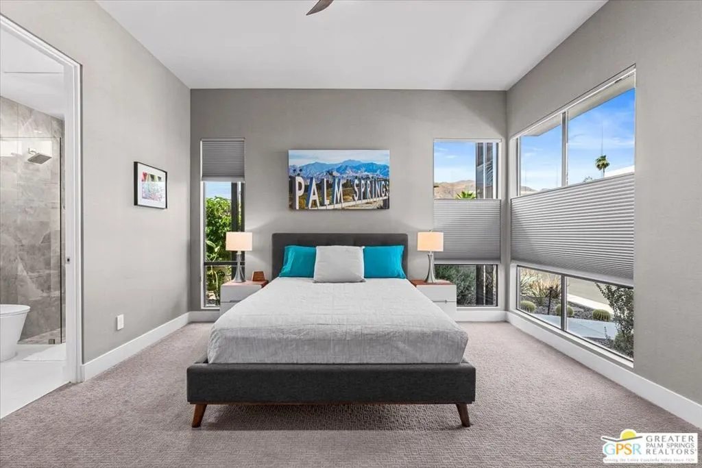 Located in the heart of vibrant Palm Springs, this modern home in the gated community of Vue is your perfect desert retreat. With 3 spacious bedrooms and 3 beautifully upgraded baths, this property is packed with luxurious features that elevate everyday living. Step inside to discover a sleek, open layout boasting a gourmet kitchen equipped with upgraded appliances, a gas fireplace for cozy evenings, and high-tech touches like electronic blinds, drapes, and a Sonos surround sound system. Ceiling fans throughout and a custom-built primary closet add both comfort and style. Outside, soak up the desert sunshine in your private oasis with dining, seating and lounging areas. The saltwater pool and spa, complete with water features and a pebble tech finish, are complemented by a Cool-Tech patio and a built-in BBQ station perfect for entertaining or unwinding under the stars. Additional perks include 34 owned solar panels with a backup battery, a full house water filtration and purification system, plus an air-conditioned, epoxy-floored 2-car garage. For added peace of mind, the home is equipped with an alarm system, cameras, a DoorBird entry system and whole house surge protection. This is more than just a home; it's a lifestyle. Don't miss your chance to own this stunning Palm Springs gem!