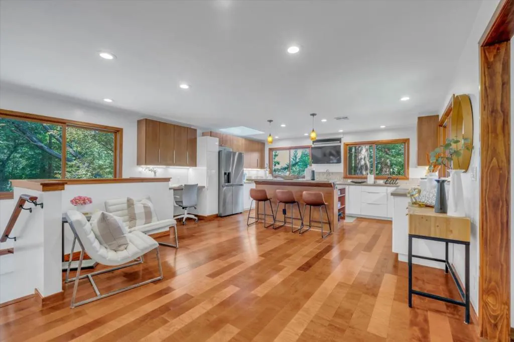 Set on 2.6+ wooded acres in the hills, this warm & beautifully renovated home offers something genuinely rare on the Peninsula: complete privacy amid towering redwood trees, a profound sense of forest immersion, and less than 15 minutes to Sand Hill & 280. The updated & open floor plan kitchen flows into generous dining and living spaces, all oriented towards sweeping forest views. Natural light fills the space, and wraparound decks extend living outdoors, with a hot tub just off the primary suite. A flexible two bedroom wing can accommodate children, teens, guest rooms, or office and studio space. An independent 1-bdrm ADU with its own kitchen / bath is ideal for rental income, an au pair, or an aging parent. The kitchen, secondary bathrooms, finishes, HVAC, roof, and water heater - have all been recently renovated, and pre-sale inspections were completed with virtually all items addressed. Hiking, cycling & equestrian trails connect directly to the property, and the land is zoned for horses. Stanford's campus is a short, predictable 25 min commute away. Zoned for Portola Valley El / Mid schools and Woodside HS, with several excellent private schools nearby. Soaring redwoods, architectural warmth & effortless access to the heart of Silicon Valley - come see it for yourself.