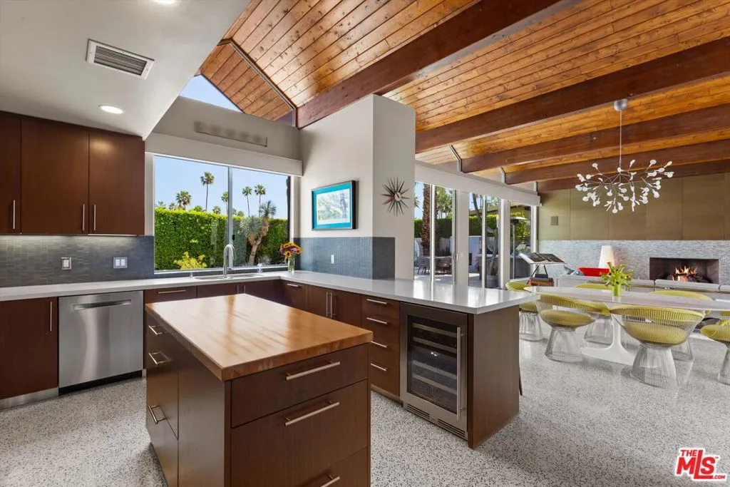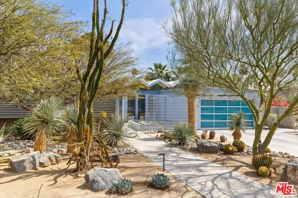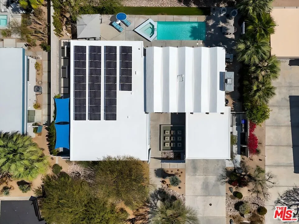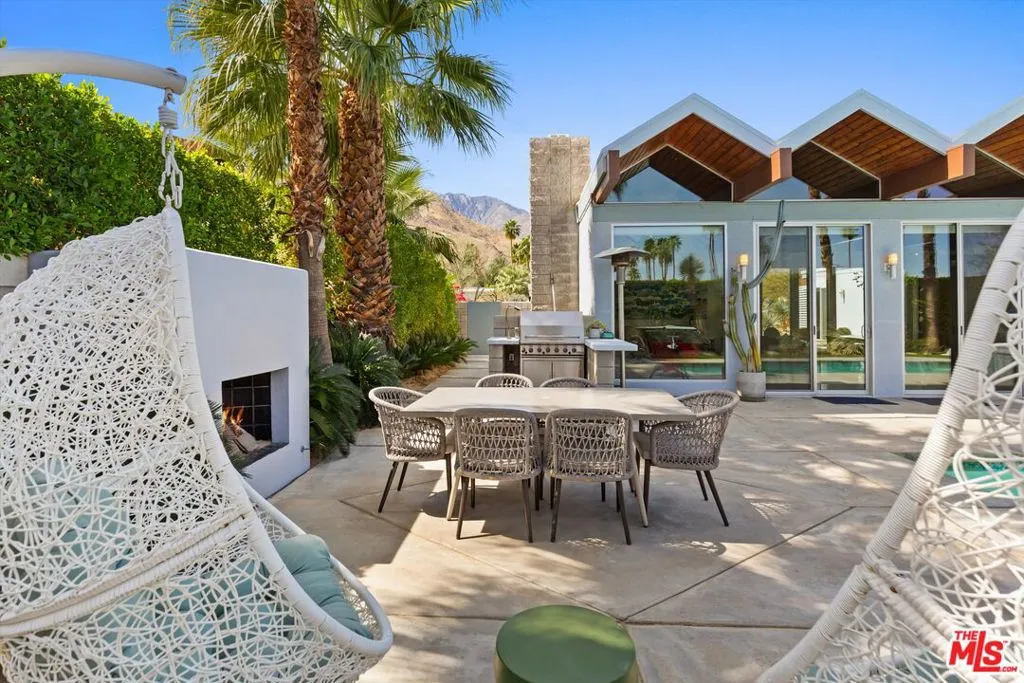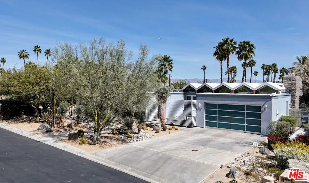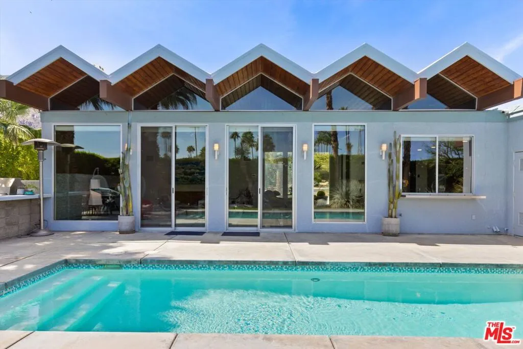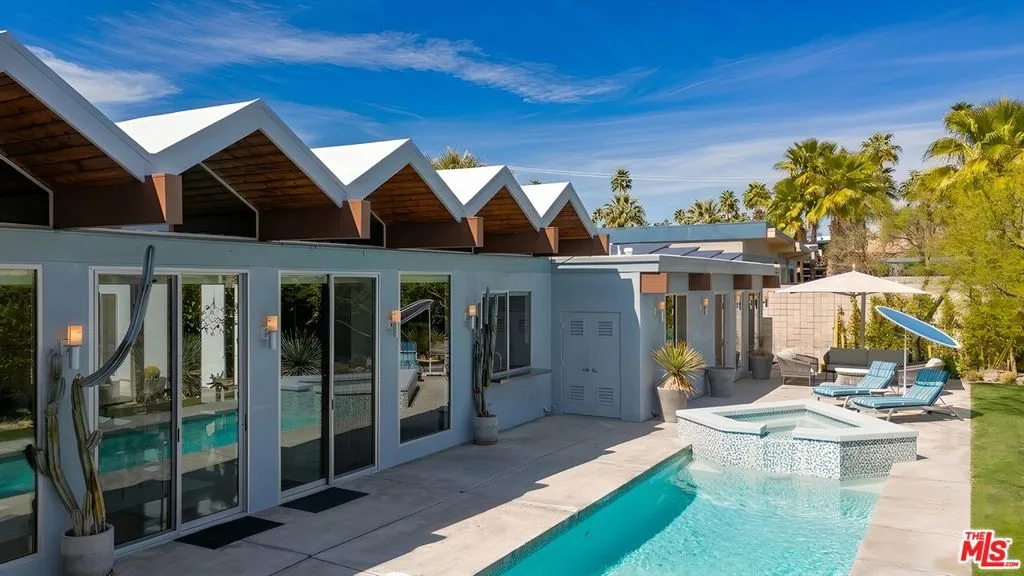 (Also included is a flexible BONUS room ideal as a gym, office, or optional 4th bedroom.) Set within an intimate enclave of just six architecturally cohesive residences, this striking home captures the essence of Palm Springs modernism. Its sculptural folded-plate roofline draws inspiration from the iconic design language attributed to Palmer & Krisel, where geometry, light, and landscape exist in perfect balance. From the moment you arrive, the experience is intentional. A private front courtyard, anchored by a linear water feature and framed by curated desert plantings, creates a sense of calm and quiet sophistication. It is both architectural and meditative, offering a compelling preview of the design narrative that unfolds within. Step through the glass entry and the home immediately opens upward and outward. Soaring wood-plank ceilings span overhead, intersected by clerestory windows that draw in soft desert light throughout the day. Walls of glass dissolve the boundary between indoors and out, allowing the surrounding landscape and mountain backdrop to become part of the living experience. The main living area is expansive yet grounded, designed for connection while maintaining a refined sense of scale and proportion. Poured terrazzo floors reflect light beautifully, adding texture and authenticity while anchoring the space in timeless mid-century materiality. The open layout allows the living, dining, and kitchen areas to flow effortlessly together, creating a cohesive experience throughout the home. At the heart of the residence, the kitchen balances warmth and precision. Custom cabinetry, generous prep surfaces, and a central island create a space equally suited for quiet mornings or elevated entertaining. Sightlines extend through the home to the outdoors, reinforcing the seamless integration of interior and exterior living. The primary suite offers a private retreat that feels both serene and connected. A spa-inspired bath features a striking walk-in shower with custom tilework and direct outdoor access, creating a distinctly Palm Springs indoor-outdoor bathing experience. Two additional guest bedrooms are thoughtfully positioned for privacy, while a flexible bonus room adapts effortlessly as a fourth bedroom, office, or dedicated fitness space. Outside, the backyard unfolds as a true private resort. The pool and spa are framed by clean architectural lines and mature landscaping, while multiple seating and dining areas invite both relaxation and entertaining. A built-in BBQ and outdoor fireplace create an ideal setting for evenings under the desert sky, where the mountains slowly transform into dramatic silhouettes as day gives way to night. Modern efficiency is seamlessly integrated into the home's design. An owned solar system with 36 panels producing 11.8 kW is paired with three Tesla Powerwall-3 battery backup systems, offering energy independence, resilience, and long-term sustainability. Situated on FEE LAND (you own it), adds both tangible value and long-term security. Tucked within a serene, private enclave, this residence offers a rare balance of architectural integrity, privacy, and livability, just moments from the best of Palm Springs. This is where architecture becomes atmosphere, and light becomes a living element. Each space is designed not only to be seen, but to be felt, capturing the rhythm of the desert and the effortless elegance of Palm Springs living at its most refined.
