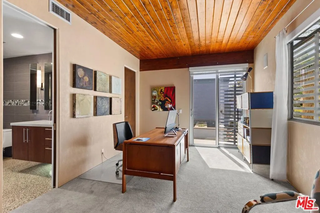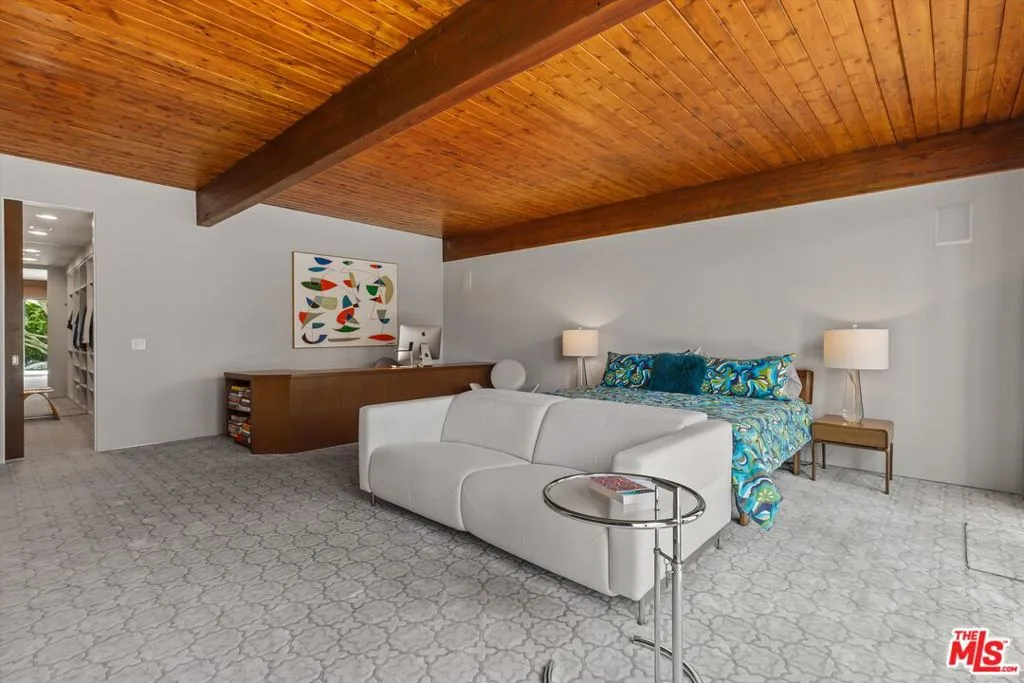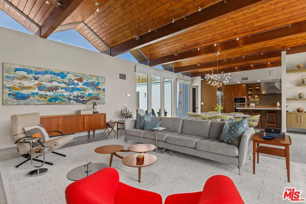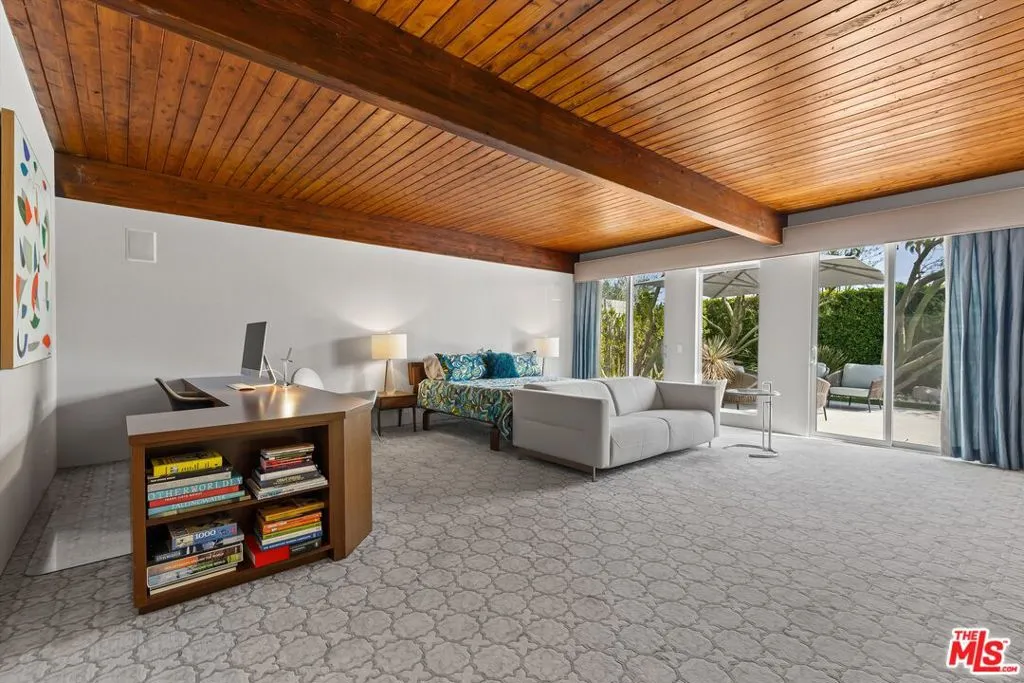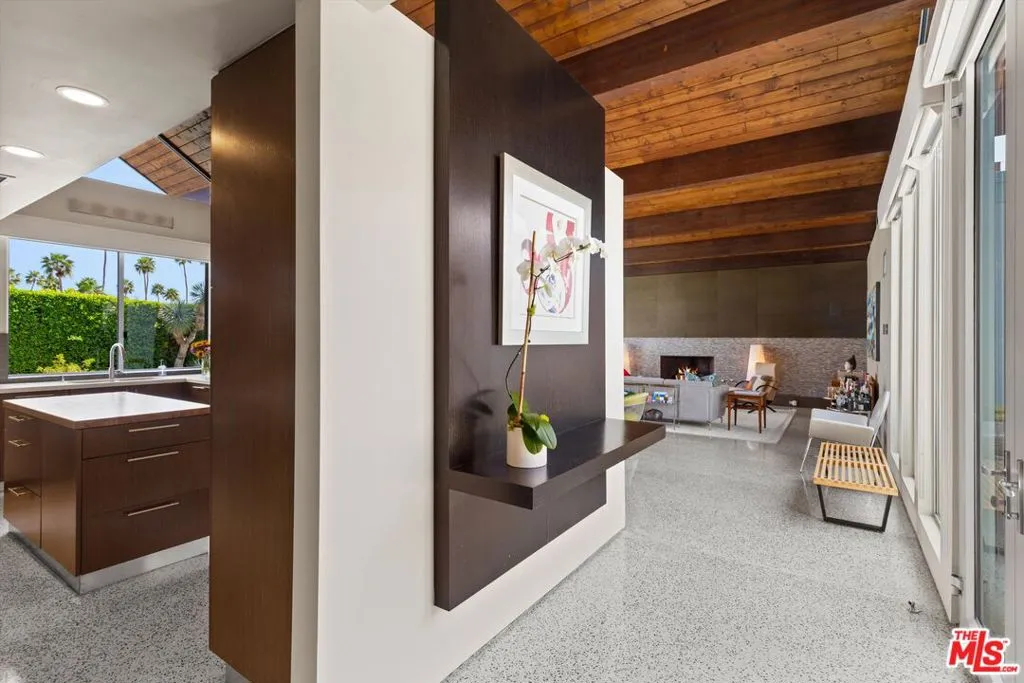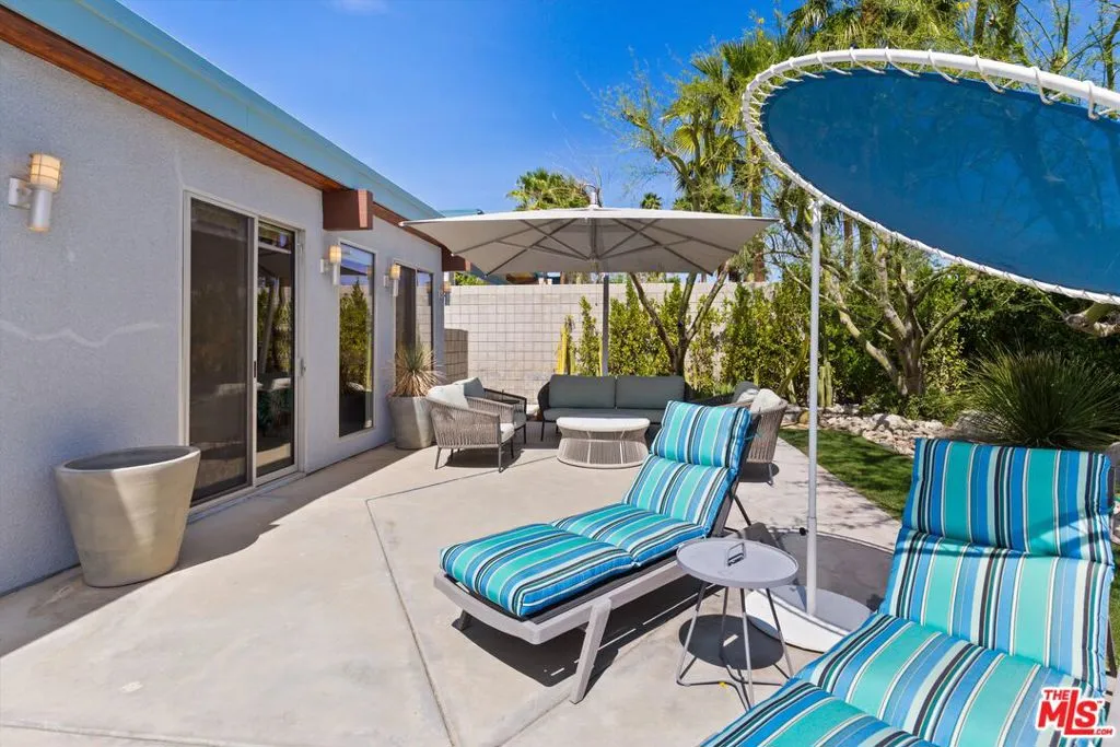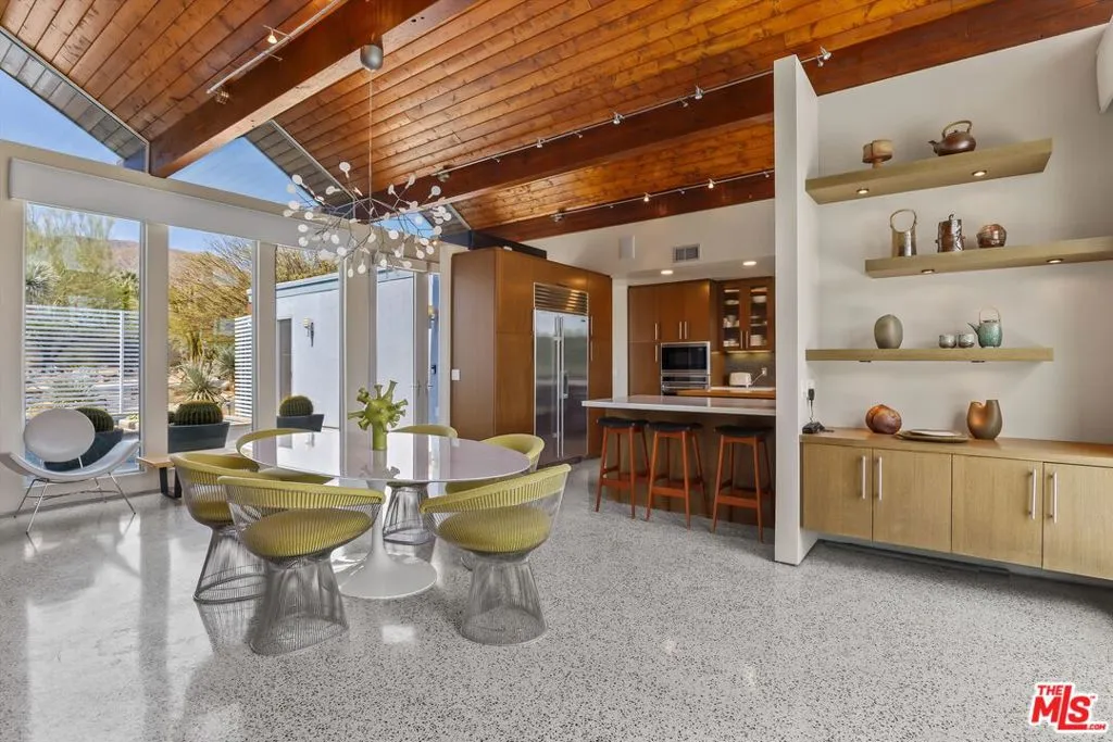 (Also included is a flexible BONUS room ideal as a gym, office, or optional 4th bedroom.) Set within an intimate enclave of just six architecturally cohesive residences, this striking home captures the essence of Palm Springs modernism. Its sculptural folded-plate roofline draws inspiration from the iconic design language attributed to Palmer & Krisel, where geometry, light, and landscape exist in perfect balance. From the moment you arrive, the experience is intentional. A private front courtyard, anchored by a linear water feature and framed by curated desert plantings, creates a sense of calm and quiet sophistication. It is both architectural and meditative, offering a compelling preview of the design narrative that unfolds within. Step through the glass entry and the home immediately opens upward and outward. Soaring wood-plank ceilings span overhead, intersected by clerestory windows that draw in soft desert light throughout the day. Walls of glass dissolve the boundary between indoors and out, allowing the surrounding landscape and mountain backdrop to become part of the living experience. The main living area is expansive yet grounded, designed for connection while maintaining a refined sense of scale and proportion. Poured terrazzo floors reflect light beautifully, adding texture and authenticity while anchoring the space in timeless mid-century materiality. The open layout allows the living, dining, and kitchen areas to flow effortlessly together, creating a cohesive experience throughout the home. At the heart of the residence, the kitchen balances warmth and precision. Custom cabinetry, generous prep surfaces, and a central island create a space equally suited for quiet mornings or elevated entertaining. Sightlines extend through the home to the outdoors, reinforcing the seamless integration of interior and exterior living. The primary suite offers a private retreat that feels both serene and connected. A spa-inspired bath features a striking walk-in shower with custom tilework and direct outdoor access, creating a distinctly Palm Springs indoor-outdoor bathing experience. Two additional guest bedrooms are thoughtfully positioned for privacy, while a flexible bonus room adapts effortlessly as a fourth bedroom, office, or dedicated fitness space. Outside, the backyard unfolds as a true private resort. The pool and spa are framed by clean architectural lines and mature landscaping, while multiple seating and dining areas invite both relaxation and entertaining. A built-in BBQ and outdoor fireplace create an ideal setting for evenings under the desert sky, where the mountains slowly transform into dramatic silhouettes as day gives way to night. Modern efficiency is seamlessly integrated into the home's design. An owned solar system with 36 panels producing 11.8 kW is paired with three Tesla Powerwall-3 battery backup systems, offering energy independence, resilience, and long-term sustainability. Situated on FEE LAND (you own it), adds both tangible value and long-term security. Tucked within a serene, private enclave, this residence offers a rare balance of architectural integrity, privacy, and livability, just moments from the best of Palm Springs. This is where architecture becomes atmosphere, and light becomes a living element. Each space is designed not only to be seen, but to be felt, capturing the rhythm of the desert and the effortless elegance of Palm Springs living at its most refined.