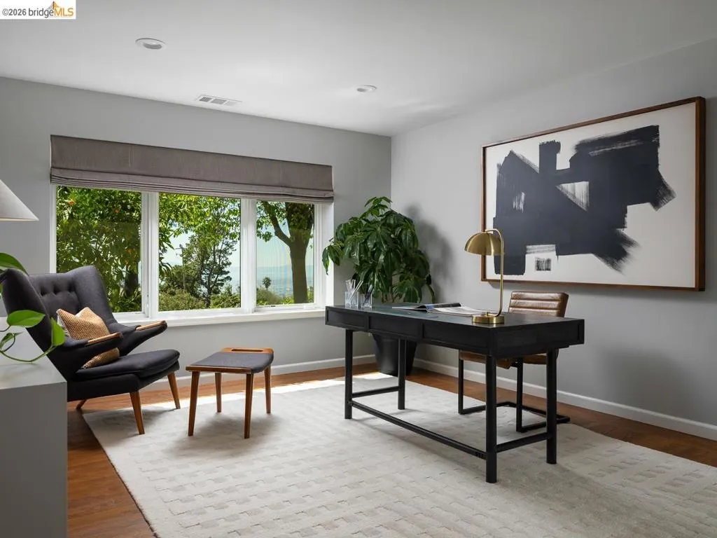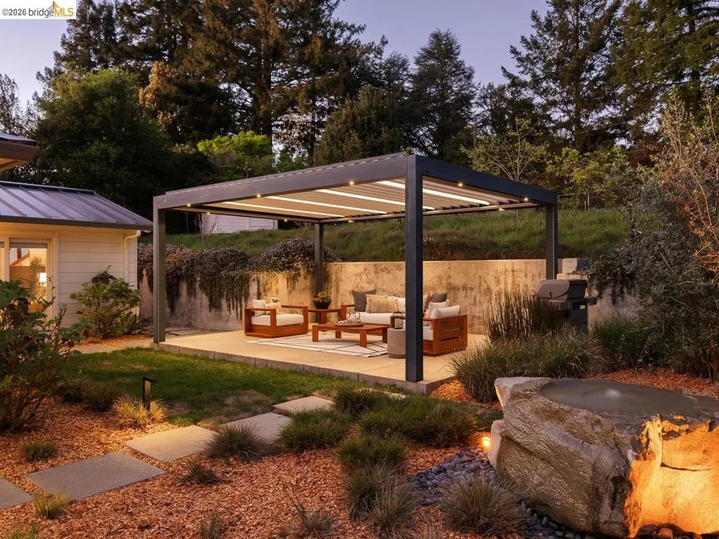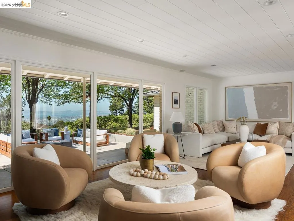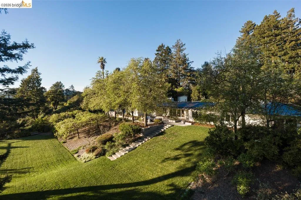 Set on approximately 1.1 acres in the coveted Hillcrest Estates enclave of the Oakland Hills, Skyland offers a rare blend of space, privacy, and natural beauty. Originally built in 1948 and thoughtfully reimagined in 2021, this single-level home balances timeless architecture with modern living. Walls of glass fill the home with natural light while framing views of redwoods, curated grounds, and the Bay. The well-designed layout includes 4 bedrooms, 4.5 baths, highlighted by a luxurious primary suite with a spa-like bath, steam shower, and soaking tub, along with a private guest suite. A dedicated executive office and separate studio/gym support work, creativity, and wellness. Designed for both everyday living and entertaining featuring a heated pool with Bay views, a pergola lounge with integrated lighting and sound, expansive patios, and a rare level lawn surrounded by mature landscaping originally envisioned by Napa Valley designer Jack Chandler. The kitchen offers marble countertops, Wolf and Sub-Zero appliances, abundant storage, and a walk-through pantry. Solar, a whole-home generator, enterprise-grade networking, and advanced air filtration complete the home; single-level living on over an acre with Bay views, an incredibly rare combination seldom found in the Bay Area.