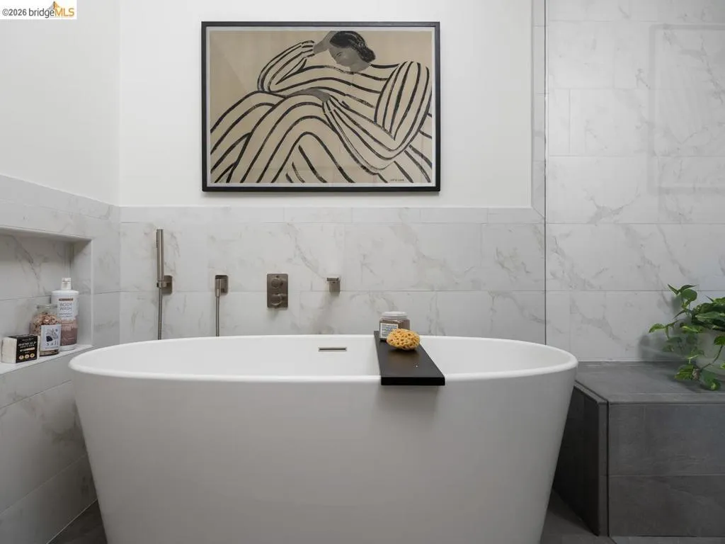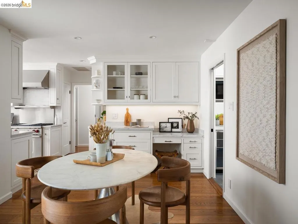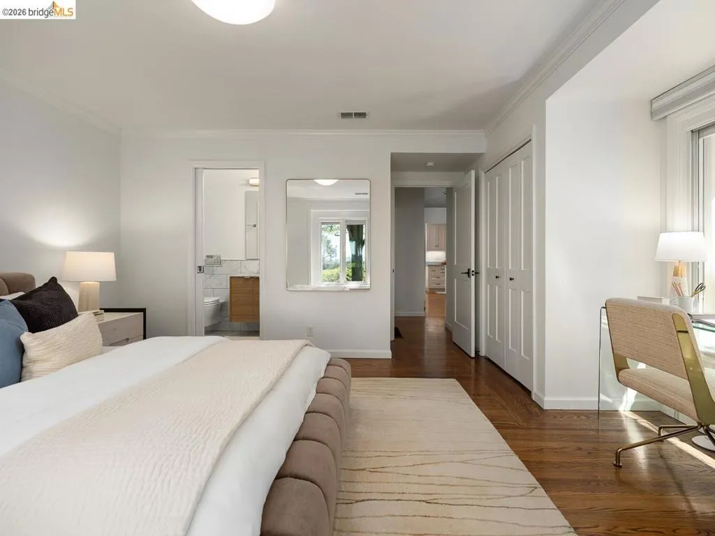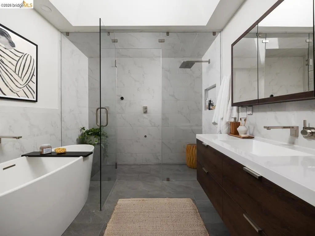 Set on approximately 1.1 acres in the coveted Hillcrest Estates enclave of the Oakland Hills, Skyland offers a rare blend of space, privacy, and natural beauty. Originally built in 1948 and thoughtfully reimagined in 2021, this single-level home balances timeless architecture with modern living. Walls of glass fill the home with natural light while framing views of redwoods, curated grounds, and the Bay. The well-designed layout includes 4 bedrooms, 4.5 baths, highlighted by a luxurious primary suite with a spa-like bath, steam shower, and soaking tub, along with a private guest suite. A dedicated executive office and separate studio/gym support work, creativity, and wellness. Designed for both everyday living and entertaining featuring a heated pool with Bay views, a pergola lounge with integrated lighting and sound, expansive patios, and a rare level lawn surrounded by mature landscaping originally envisioned by Napa Valley designer Jack Chandler. The kitchen offers marble countertops, Wolf and Sub-Zero appliances, abundant storage, and a walk-through pantry. Solar, a whole-home generator, enterprise-grade networking, and advanced air filtration complete the home; single-level living on over an acre with Bay views, an incredibly rare combination seldom found in the Bay Area.
