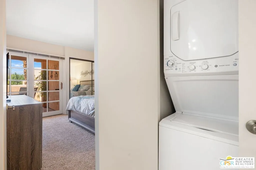 Looking for the perfect desert escape and an investment opportunity? Turnkey furnished and ready to enjoy, welcome to Palm Springs Deauville, just blocks from the buzz of Palm Canyon Drive. Designed by celebrated desert architect Hugh Kaptur, this upper level condo features vaulted ceilings, clerestory windows, an open concept layout, and abundant natural light. Both the main living area and the ensuite bedroom open to a private patio with pleasant views and a quiet location away from road noise. This one bedroom, two bath home is ideal for part time residents or vacation rental investors, with gated security, a dedicated storage closet, and an additional large underground storage unit. Resort style amenities include three sparkling pools and spas, tennis courts, a fitness center, clubhouse, and underground parking for up to three cars with extra storage and bike space, plus the convenience of an in unit washer and dryer. Palm Springs Deauville allows 14 day minimum rentals, and the future high end Dream Hotel and Condos across the street promises even greater long term value. Whether you are looking to invest, escape, or both, this Palm Springs home is a delight on all fronts.