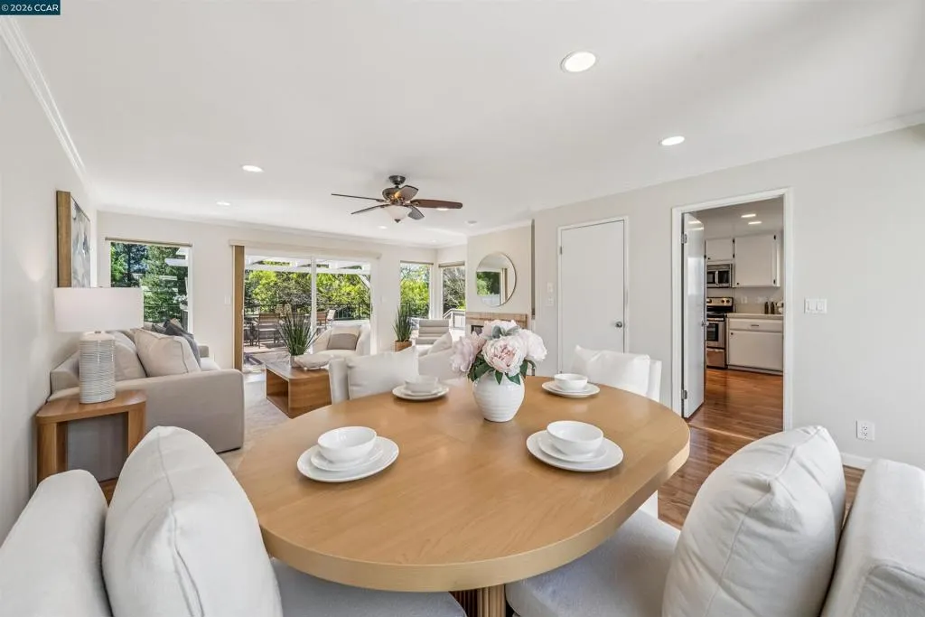 Perched on one of the quietest and most sought-after streets in the heart of Crow Canyon Country Club, this lovingly maintained townhome on Myrtle Beach Lane offers the perfect blend of comfort and resort-style living. Step inside to discover 1,553 square feet of thoughtfully designed space, featuring 2 generously sized bedrooms, a versatile office, 2 full bathrooms, rich hardwood floors, and a sun-filled atrium that bathes the home in natural light. The living room charms with built-in bookshelves and a wood-burning fireplace, while sliding doors open directly onto the fairway, seamlessly connecting indoor living to breathtaking panoramic views of hole 3, rolling hills, and wide-open skies. The eat-in kitchen extends the living experience outdoors through its own sliding doors to a lovely garden patio — ideal for morning coffee, al fresco dining, or golden-hour entertaining on the eco-friendly composite deck. As a resident, you'll enjoy exclusive access to the Bay Club Crow Canyon Country Club, complete with a manicured 18-hole golf course, magnificent clubhouse with bar and grill, formal dining, gym, tennis, pickleball, a heated junior Olympic pool, and luxurious spa facilities — all secured behind a 24-hour manned guard gate with roving privacy patrols.
