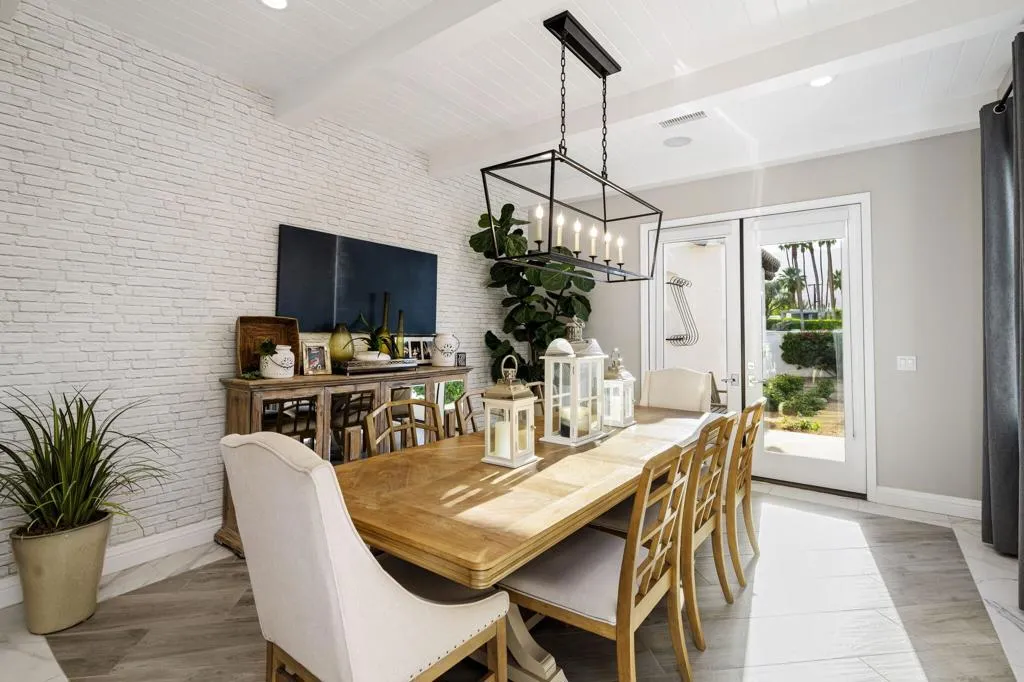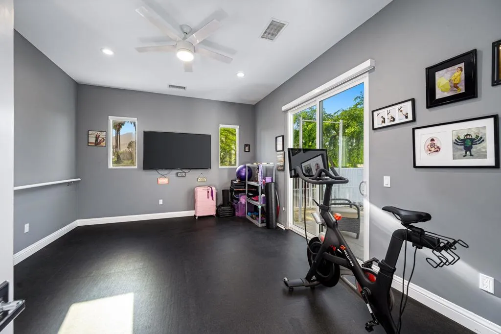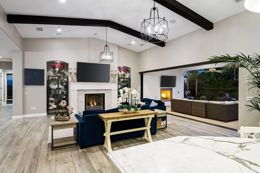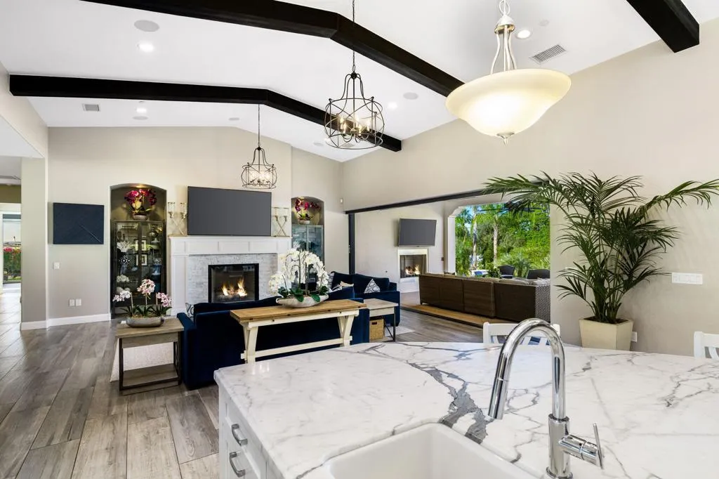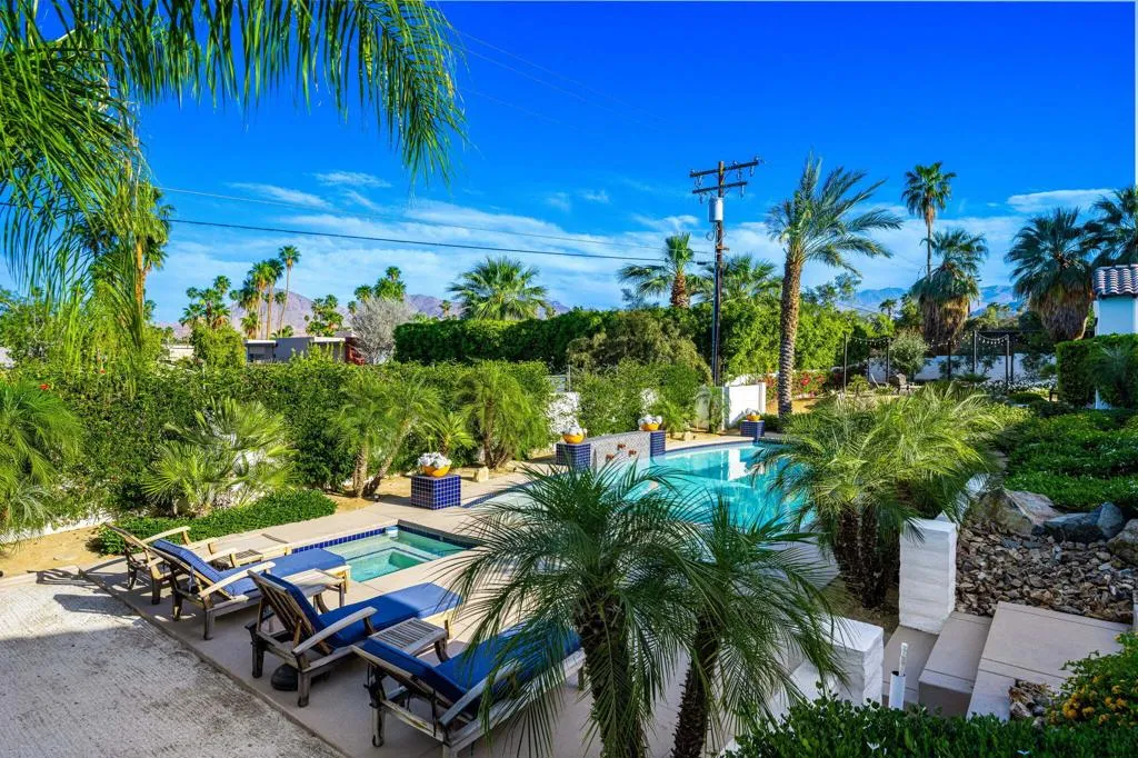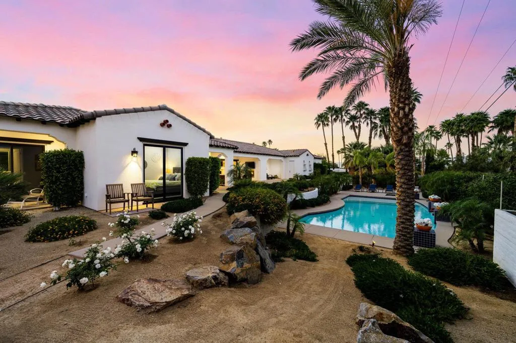 Incredible custom Spanish estate home, in the heart of desirable South Palm Desert. Four bedrooms, four baths plus two half baths in a spacious 5,411 SF, situated on a huge .69 acre lot! From the paver-stone circular drive, you enter through a gated courtyard with impeccable landscaping, into a dramatic great room with towering beam ceilings and walls of glass. The showroom worthy kitchen boasts a large island with a gorgeous marble countertop, top of the line stainless steel appliances and exceptional functionality for day to day living, or effortless entertaining. Further, there is a formal dining room. The luxurious primary suite has a spa-like his and hers bath. In addition to the three other lovely bedroom suites, there is also a large family room with a bar, a very functional office, and a gym. Proceeding outside, you are greeted by a fairytale backyard featuring an oversized pool and spa with large tanning shelf, welcoming firepit area, multiple seating areas with strings of cafe lights, a BBQ center, an outdoor rain shower and even a bocce ball court! Rounding out this exceptional home is an oversized three car garage with loads of storage, This impeccable property is a perfect full-time home, or desert getaway ... and there are NO HOA dues! Offered unfurnished, but furnishings may be negotiable.