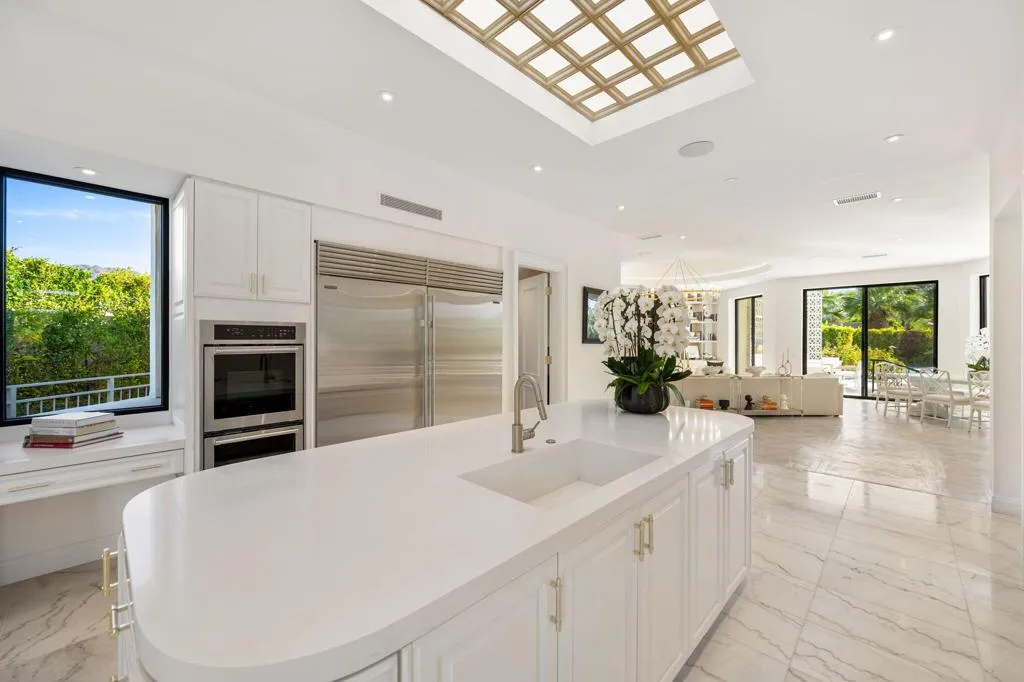 Designed by visionary architect Tom Jakway, this extraordinary 15,389 sq. ft. estate is set on a rare 41,817 sq. ft. double lot overlooking the 5th tee of the Desert Course, offering the ultimate in luxury desert living. Thoughtfully reimagined by its current owners, the residence blends sophisticated elegance with exceptional indoor-outdoor flow, ideal for both intimate retreats and grand-scale entertaining.A dramatic gated entry opens to a stunning enclosed courtyard featuring a resort-style pool and spa, tranquil water feature, fireside lounge, and seamless access to the home's grand bar through pocket sliding glass doors. Outdoor amenities include a barbecue kitchen, dining area, expansive lawn, and multiple seating areas perfectly oriented for sun-filled days and breathtaking sunset views.The home is organized into distinct living spaces, including a grand great room with soaring volume, multiple seating areas, and a statement fireplace, as well as a formal dining room and an elegant lounge with sit-down bar and floor-to-ceiling windows capturing panoramic views of the Santa Rosa Mountains. The chef's kitchen anchors the family wing with multiple work areas, morning room, family room, and casual dining.An expansive lower-level entertainment retreat features a state-of-the-art theater, game areas, full bar, secondary kitchen, and a private wellness suite with exercise room and steam bath.The luxurious primary suite offers a private terrace, fireplace, spa-inspired bath, dual water closets, and three walk-in closets. Additional accommodations include multiple ensuite guest rooms, a detached guest house with living area, and a second guest house with full kitchen--ideal for extended family, guests, or staff.With its premier golf course location, resort-caliber amenities, and exceptional scale, this one-of-a-kind estate delivers an unparalleled lifestyle in a truly spectacular setting.