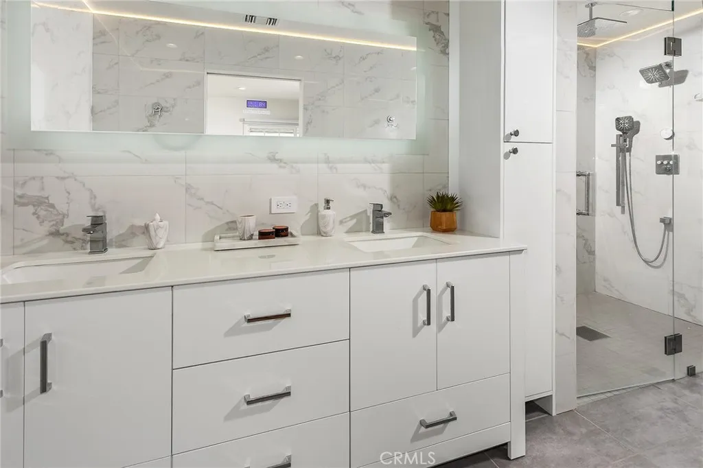 Renovated Smart home with Control4 automation, Level 2 EV charger, and indoor/outdoor living with integrated AV, hardwood floors, new windows, new exterior doors, cedar fencing, fresh exterior paint, and upgraded drainage. 12-zone Rain Bird irrigation system with drip and spray lines. Integrated Control4 system with central automation hub, enterprise-grade networking, and distributed wireless access points providing full-coverage Wi-Fi. System controls lighting, TVs, and audio indoors and outdoors; pre-wired for additional switches and keypads and fully expandable. Family room features custom millwork built-ins, 220V electric fireplace, integrated AV system with 7 in-wall speakers, subwoofer, receiver, RGB accent lighting. Kitchen includes quartz waterfall countertops, custom lacquered cabinetry with glass display uppers and lighting, center island with breakfast bar, in-kitchen dining area, pantry, motorized window shades, pop-up outlets, and undermount sink with pull-down faucet. Equipped with pro-style Thor appliances including 6-burner gas range, double oven, hood, refrigerator, dishwasher, microwave drawer, warming drawer, and wine cooler. Primary suite offers walk-in closet and natural light. Primary bath features floor-to-ceiling tile, dual vanity, frameless backlit mirror with integrated digital display, zero-entry glass shower with multiple heads and body jets, bidet, and customizable RGB lighting. Additional bedrooms include hardwood floors, recessed lighting, and ample closet space. Guest bath updated with tile walls, modern vanity, undermount basin, and tub/shower combination. Backyard designed for indoor/outdoor living with covered patio, tongue-and-groove ceiling, recessed lighting, ceiling fans, custom awnings, motorized exterior shades, integrated outdoor entertainment system, landscape speakers, landscape lighting, artificial turf putting green, raised planter, mature privacy hedging, drainage system, and finished shed with power and lighting. Systems include new 5-ton HVAC, upgraded 200-amp electrical panel, all new Lutron receptacles and Caseta switches, whole-house water filtration and softening, reverse osmosis drinking water system, and new gutters. ADT security system with whole-home cameras and power for future motorized gate. Insulated direct-access garage with mini-split HVAC, epoxy flooring, laundry area, full AV setup, and golf simulator capability. A beautifully upgraded home where smart design meets effortless living.