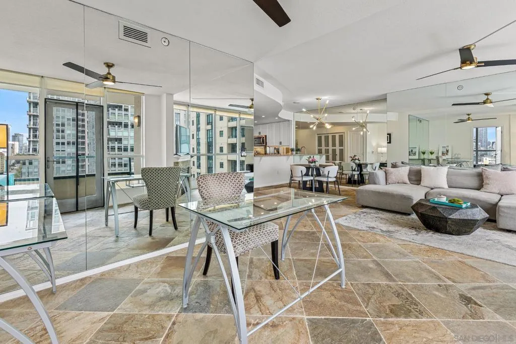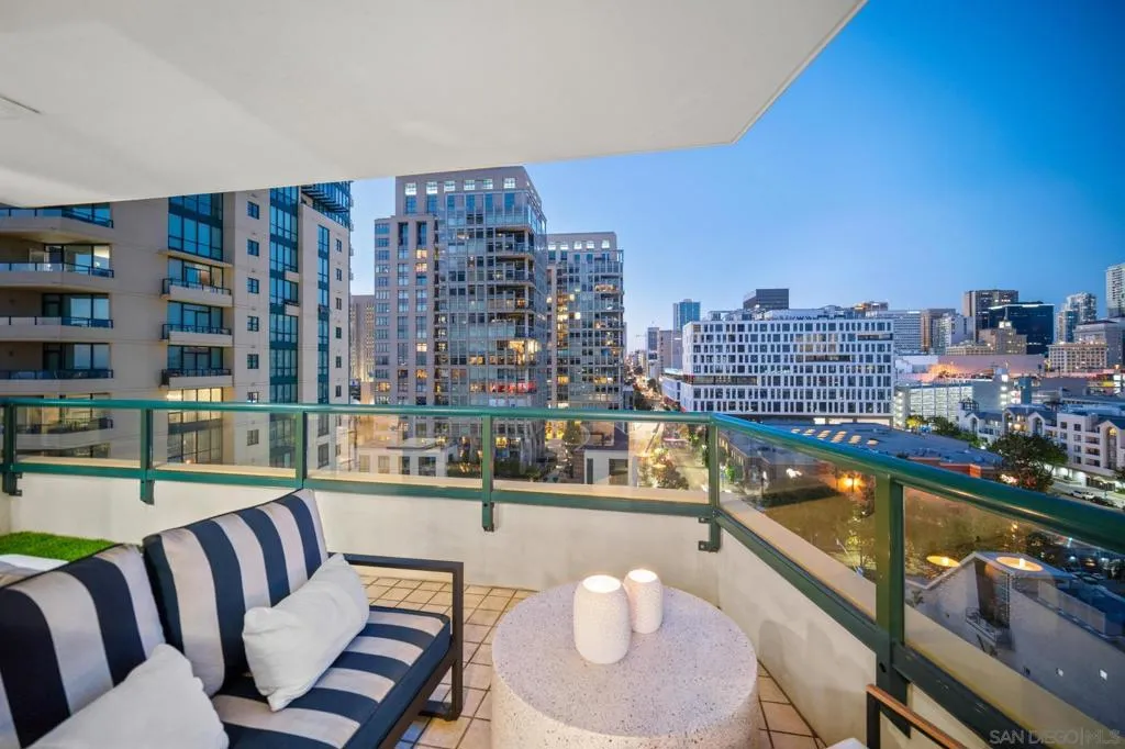 Spacious & bright corner unit with incredible panoramic views of downtown San Diego from every window! Located in the heart of the marina district, this chic condo in Horizon South has been updated with travertine flooring, a stone-surround gas fireplace, premium light fixtures, ceiling fans, and new modern doors and hardware. The well-designed layout includes a versatile den, perfect for a home office, fitness area, or creative studio, offering flexible space to fit your lifestyle. The kitchen boasts stainless steel appliances, crisp white cabinetry, and granite counters. The primary bedroom features a large walk-in closet, blackout shades, access to the patio, and an ensuite bath with a shower/tub combo and plenty of cabinet storage. Additional features include a second bathroom with a walk-in shower and an in-unit laundry closet large enough to accommodate a full-sized washer and dryer! Enjoy beautiful sunset views of Downtown from your spacious, private patio. Resident amenities include a gym, pool, spa, conference room, lounge, updated lobby area, storage unit, EV chargers, guest parking, and 24-hour gated security. Horizon residents enjoy year-round socials for the entire community. Ideally situated just steps to The Rady Shell and adjacent to a dog park, with easy access to Padres games at Petco Park and year-round concerts without the hassle of downtown parking. You’re also moments from Seaport Village, the Gaslamp Quarter, Little Italy, and San Diego’s incredible calendar of events.