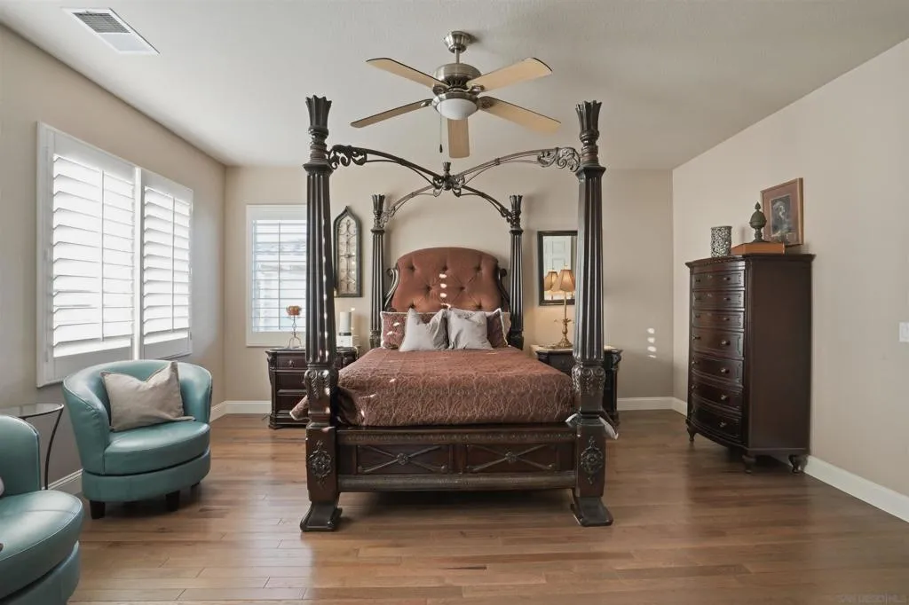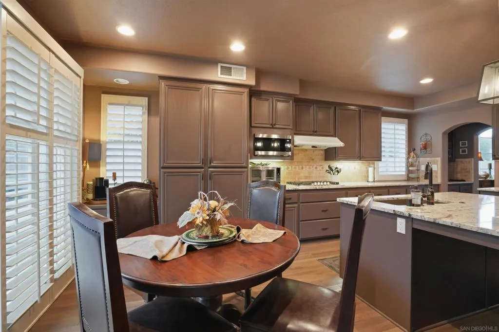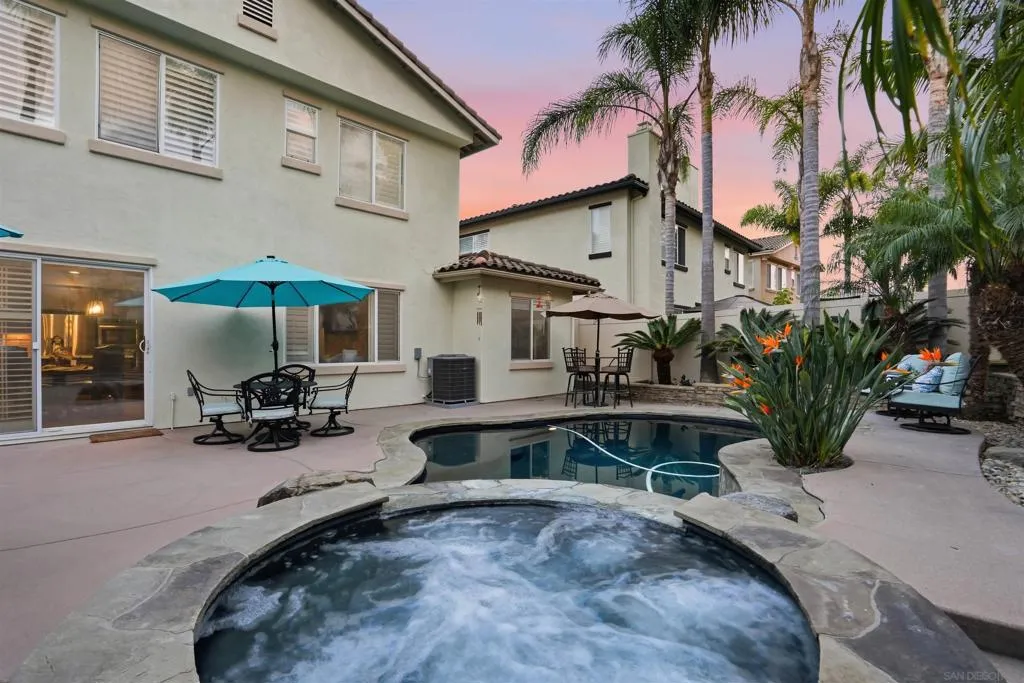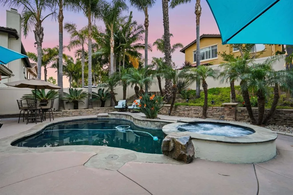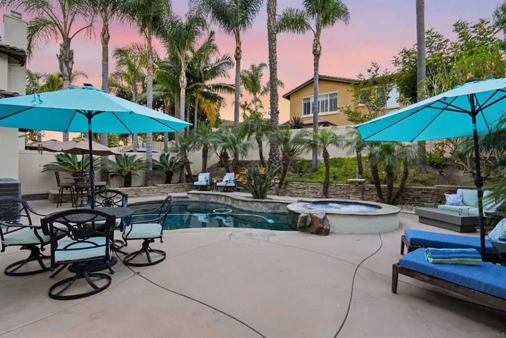 Luxury pool home with low HOA in the highly desirable Calavera Hills community of Carlsbad. Ideally located near Calavera Lake, scenic trails, shopping, Carlsbad Village, and convenient freeway access. This turnkey, fully renovated residence offers approximately 2,579 sq ft with 4 spacious bedrooms and 3 bathrooms, including a main-level bedroom and full bath. The open, light-filled floor plan features solid wood flooring throughout, with travertine in the bathrooms, laundry room, and primary walk-in closet. The redesigned kitchen showcases granite countertops, travertine backsplash, new cooktop, double ovens, microwave, upgraded sinks, and modern fixtures. All bathrooms have been remodeled with travertine stone showers, new toilets, and updated finishes. Additional upgrades include new HVAC, designer lighting, dimmer switches, and fresh interior paint. The living room is anchored by a stacked stone fireplace, while the dining room features soaring 20-ft ceilings and a statement chandelier from a historic hotel. Step outside to a private backyard retreat with tropical landscaping, new fencing, updated hardscape, and a pool/spa combo with new equipment, solar heating, and interior controls. Optional flex space in the third-car garage is ideal for a gym or studio.