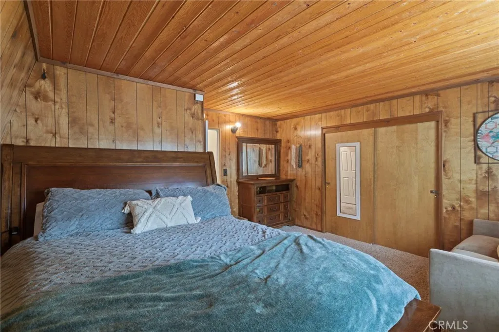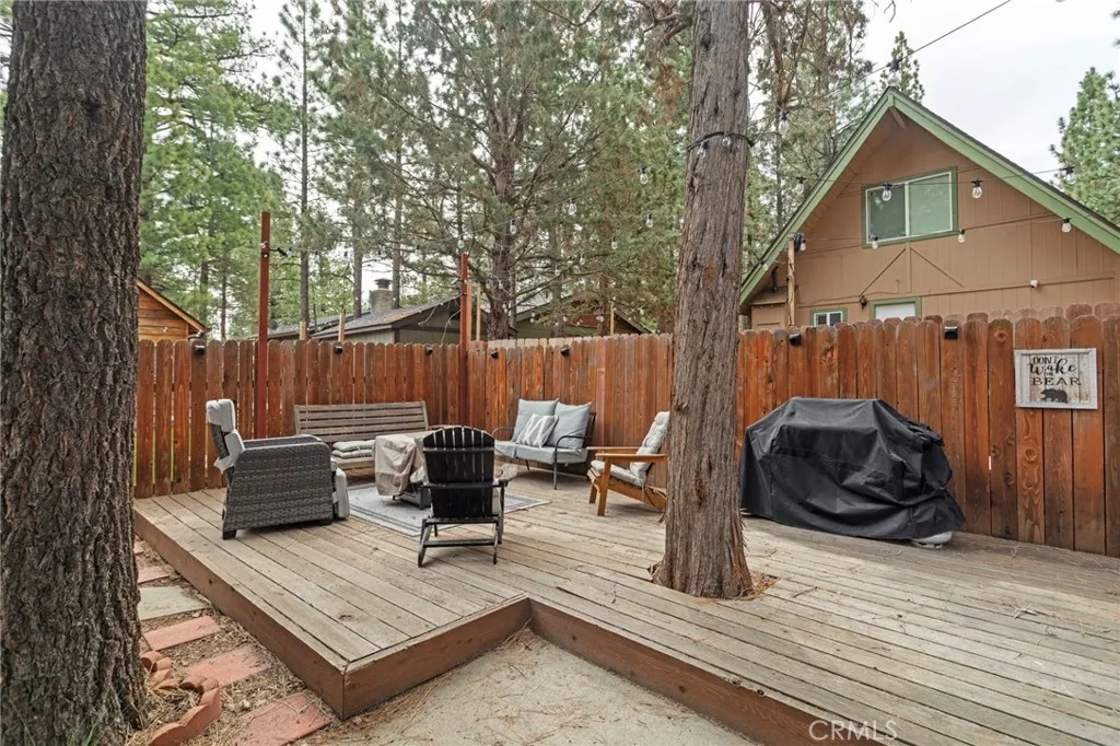 Beautiful cabin just minutes from hiking trails and off-roading; this updated Gambrel-style home delivers the mountain lifestyle you've been dreaming of! From the moment you arrive, the lovely front porch invites you to sit back, breathe in the fresh mountain air, and settle into a slower pace of life. Step inside to discover an open-concept first floor where the living room, kitchen, and dining room flow together seamlessly. The living room is featuring open beam ceilings and a wood-burning stone fireplace with original cast iron fixtures. The adjacent kitchen boasts new quartz countertops, light-colored wood cabinetry, and a double-basin stainless steel sink with modern fixtures. Just beyond, the dining room is accented with classic wainscoting and a new double-pane sliding glass door that opens to the backyard. The first floor has been thoughtfully upgraded with new, high-quality waterproof plank flooring throughout, fresh paint, and new insulation. A convenient half bath, complete with a beautiful crystal chandelier. Convenient laundry hookups are located on the first floor. Upstairs, you'll find spacious bedrooms featuring real wood paneling and open beam ceiling. The full bath is generously sized with an oversized vanity and large mirrored medicine cabinet. Upgrades on the second floor include waterproof plank flooring in the hall and bath, plus new wainscoting. A peaceful deck, nestled among mature trees, offers effortless outdoor living with minimal upkeep. Additional upgrades include new roof, rain gutters, fresh exterior paint, updated front porch with new fascia boards. Nestled near Erwin Lake Park and the San Bernardino National Forest, this home offers easy access to hiking trails, off-roading, horseback riding, rock climbing, mountain biking, and more. A short drive takes you to the ski resorts of Big Bear and the charming Big Bear Village, yet you're far enough away to enjoy the serenity and tranquility of true mountain living. Year-round living or weekend escape, this home works beautifully for both!