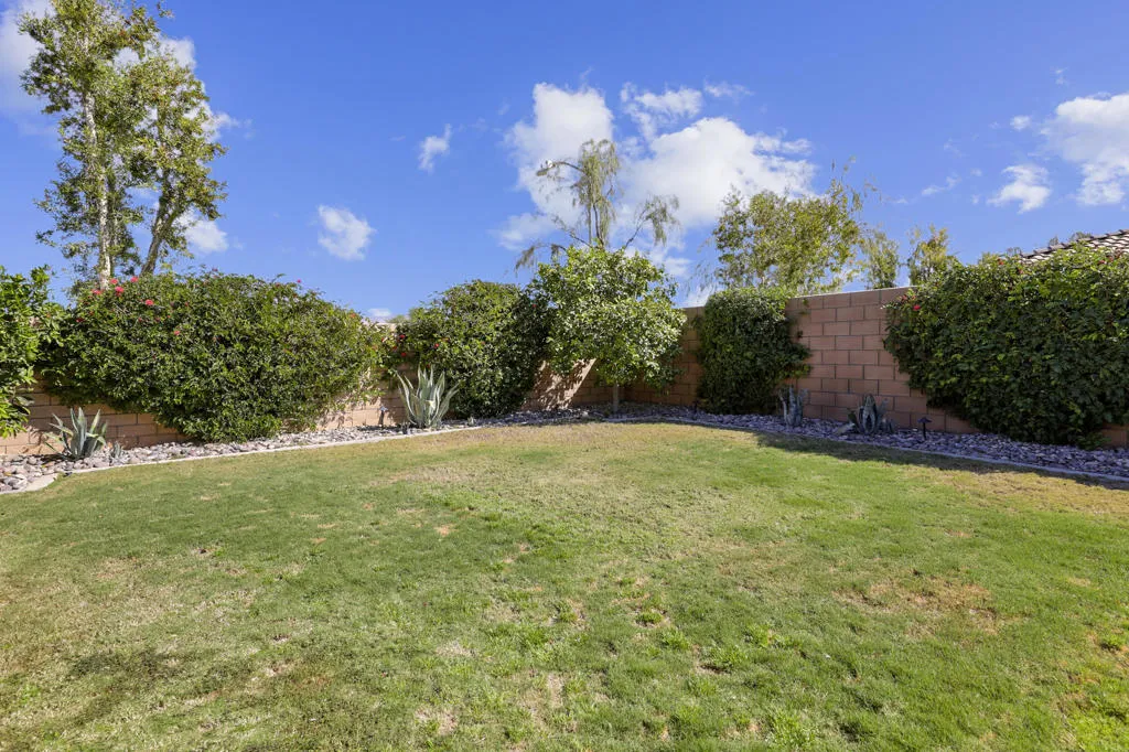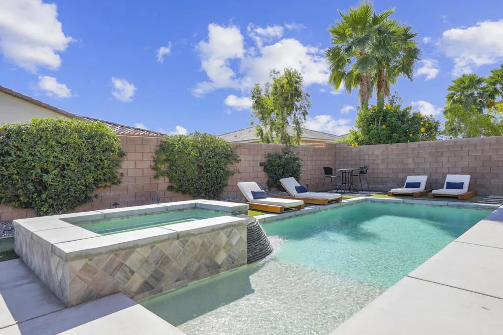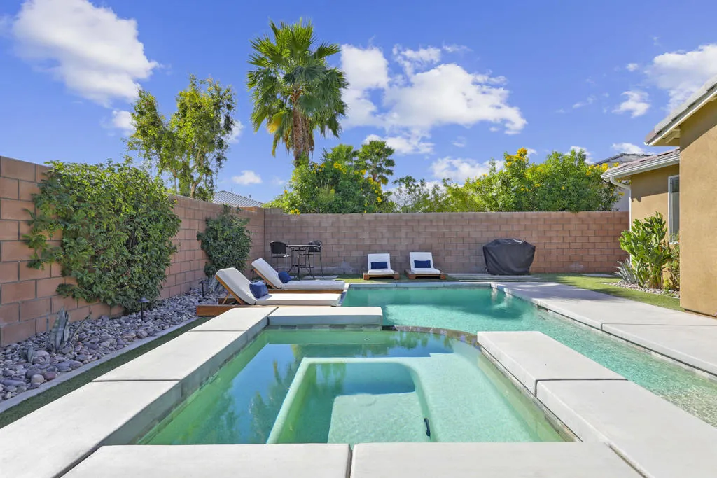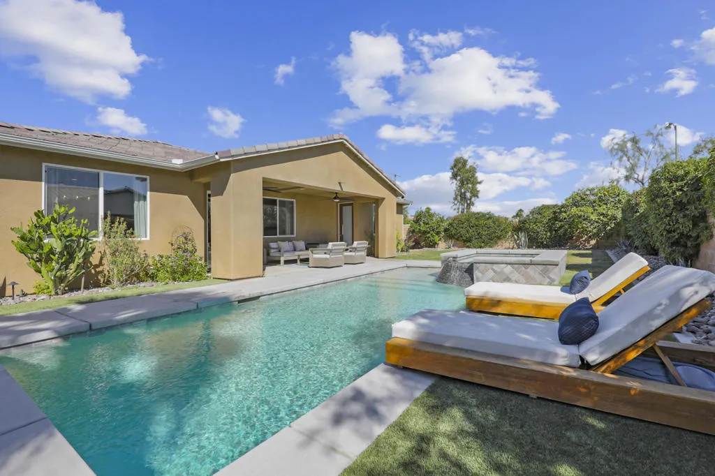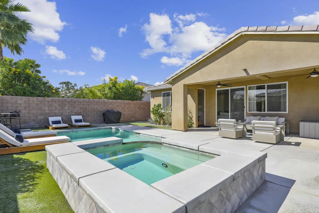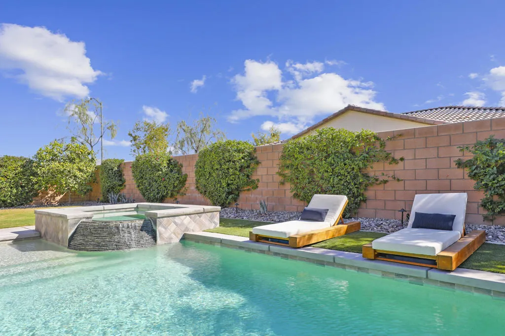 Welcome to Yorkville in Bermuda Dunes, where opportunity rarely knocks twice. This beautifully maintained 2018 residence sits on an expansive 8,000+ sq ft lot, offering privacy, space, and exceptional value in one of the area's most desirable communities. Designed for both comfort and entertaining, the backyard is a true retreat. Enjoy a saltwater PebbleTec pool, elevated infinity-edge spa, lush real grass and artificial turf, all creating the perfect setting for gatherings, pets, or play. There is plenty of room to host, relax, and savor the desert lifestyle.Inside, the home is light, bright, and airy with polished stone tile flooring throughout and carpet in bedrooms. The chef's kitchen features sleek quartz countertops, a spacious island ideal for entertaining, and high-end finishes that elevate everyday living. Most furnishings are included, showcasing quality pieces from Arhaus, West Elm and other premium brands, allowing for a seamless move-in experience.Homes in Yorkville are seldom available, and this one combines location, upgrades, and value in a way that is hard to match. If you have been searching for a refined, turnkey property in Bermuda Dunes with low Hoa's this is a must see. Call today!