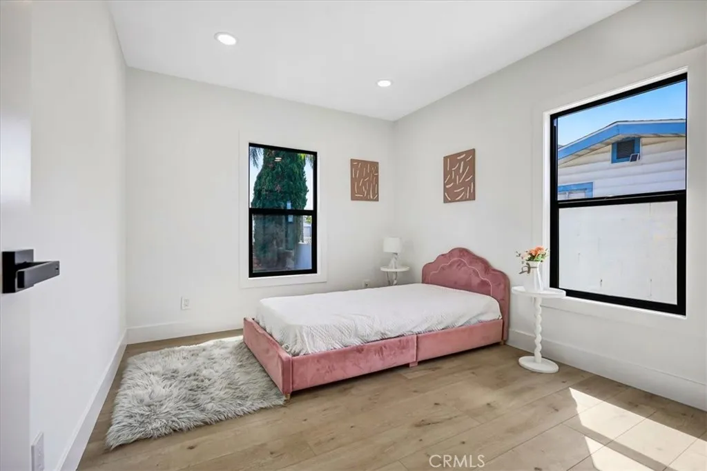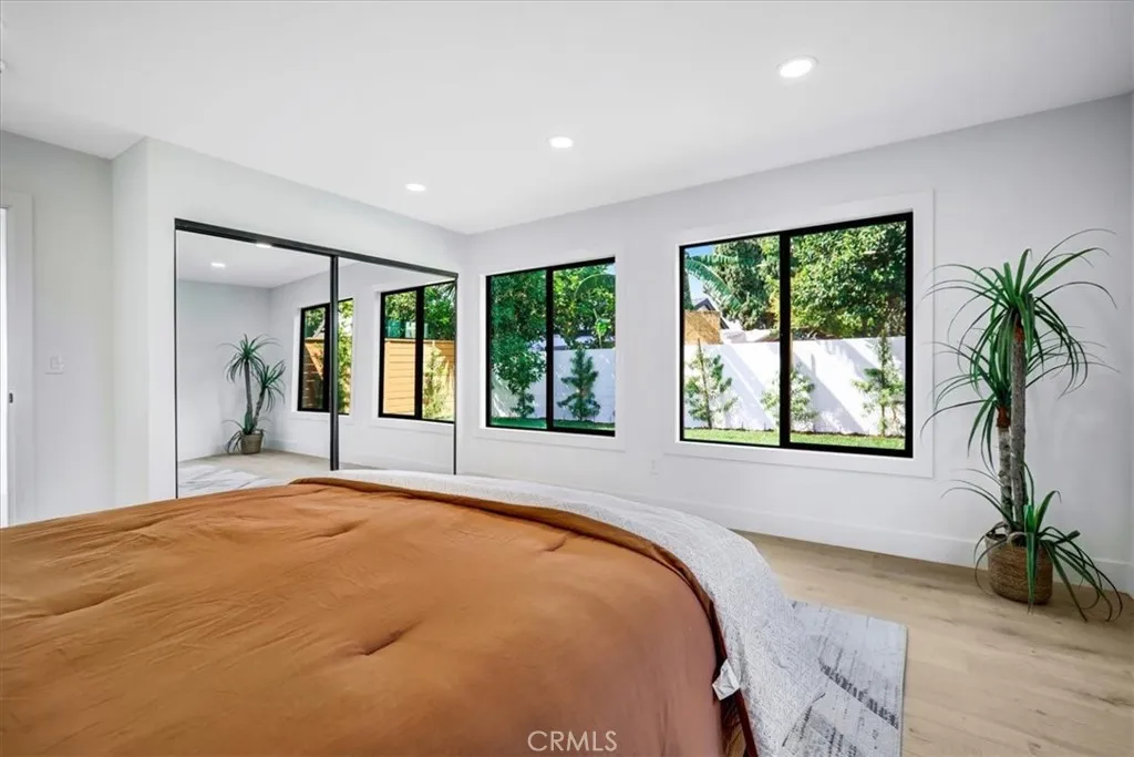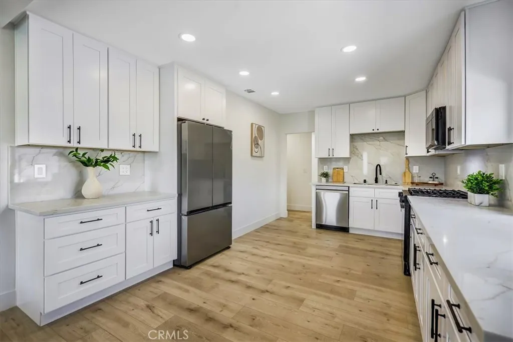 Fully rebuilt and taken down to the studs, this thoughtfully reimagined property features all work completed with permits and city inspections, providing peace of mind and modern living throughout. Set behind a gated frontage, the home features a freshly painted white exterior with contrasting black trim, a spacious front lawn, and a long driveway that extends along the side of the property to a two-car garage. A covered front porch with mosaic tile detailing adds character, while a separate side pathway provides additional access to the backyard. Inside, the home opens to a bright and cohesive living space with recessed lighting and a modern fireplace that anchors the room. The living and dining areas connect seamlessly to a fully updated kitchen, complete with white cabinetry, matching countertops, and a marble backsplash, creating a clean and contemporary design. The layout offers multiple bedrooms arranged for both functionality and privacy. Two bedrooms and a full bathroom are positioned off the main hallway, while an additional wing of the home includes larger bedrooms, including a primary suite with an updated en-suite bathroom. Sliding doors provide direct access to the backyard and enhance the indoor-outdoor connection. The backyard features a spacious grass lawn with surrounding landscaping and a private, enclosed feel, offering a comfortable setting for outdoor use. With a complete permitted rebuild, modern finishes throughout, and a well-designed layout, this home presents a turnkey opportunity.