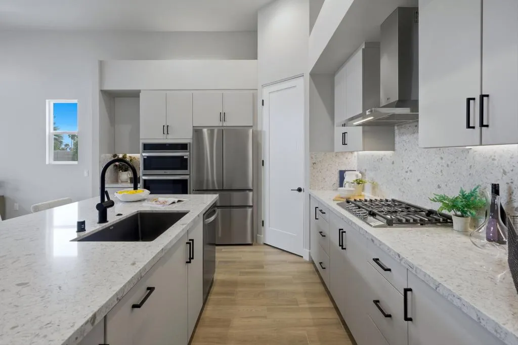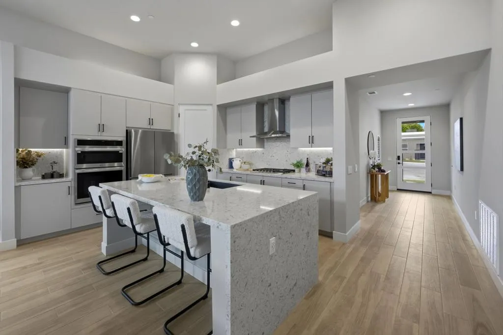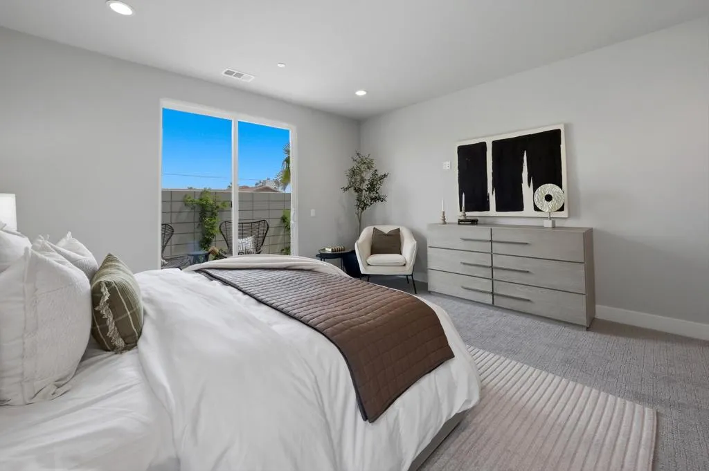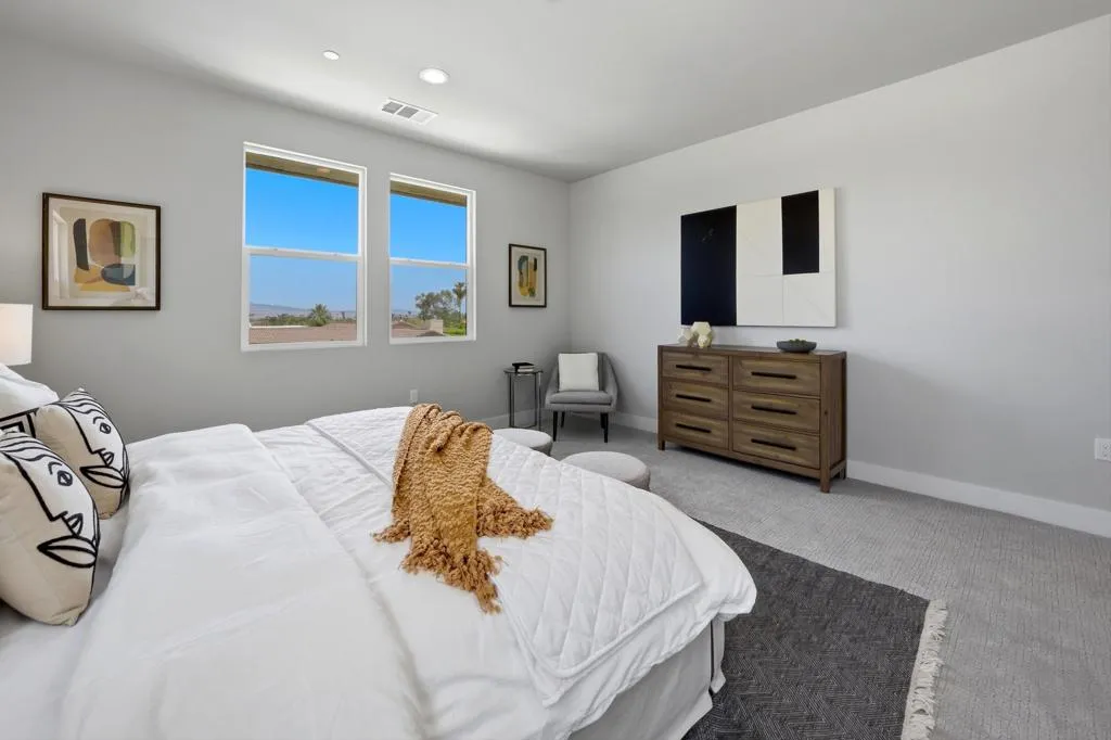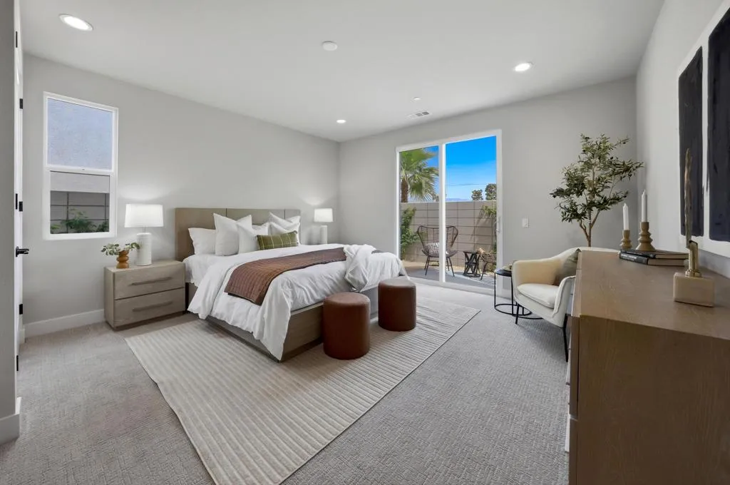 Discover the final opportunity at Volare in Bermuda Dunes! This beautifully designed Plan 3 home offers exceptional versatility and modern luxury, featuring 4 bedrooms and 3 full baths with 2 bedrooms and a bath upstairs with a private balcony and downstairs is the main bedroom and bath along with another bedroom and guest bath.The chef-inspired island kitchen is the heart of the home, showcasing sleek quartz countertops, stainless steel appliances, and a spacious walk-in pantry. Soaring 13-foot ceilings and 8-foot doors create an open, airy feel, complemented by designer interior paint, upscale flooring, and contemporary cabinetry throughout.Additional highlights include an interior laundry room with wash basin, matte black hardware and fixtures, and a fully finished 2-car garage EV charging ready! Built with energy efficiency in mind, this home also includes owned solar for long-term savings.Step outside to your private backyard oasis, complete with a sparkling saltwater pool and spa, low-maintenance turf, and desert-friendly landscaping--ideal for relaxing or entertaining. covered patio and ready for your BBQ!Located within an exclusive gated enclave of just 18 homes, hurry to choose one of the Last 6 remaining homes! Volare offers privacy and a sense of community, all with low HOA dues of only $286 per month. Ask about Builder incentives!!! Short Term Rental Approved...