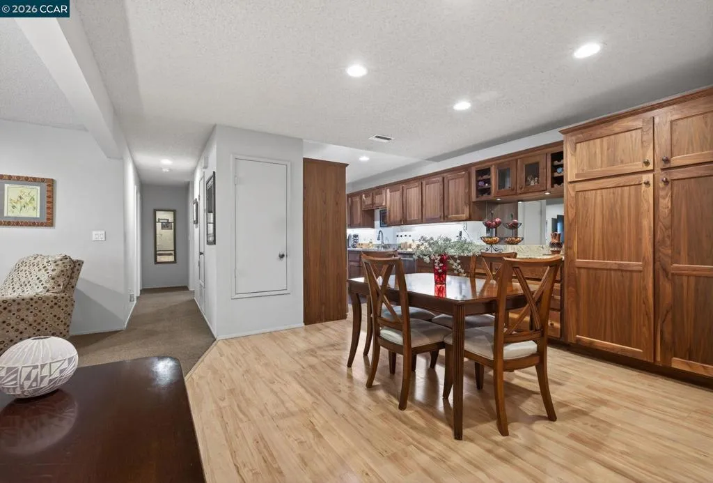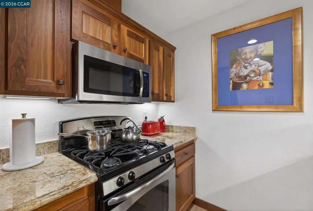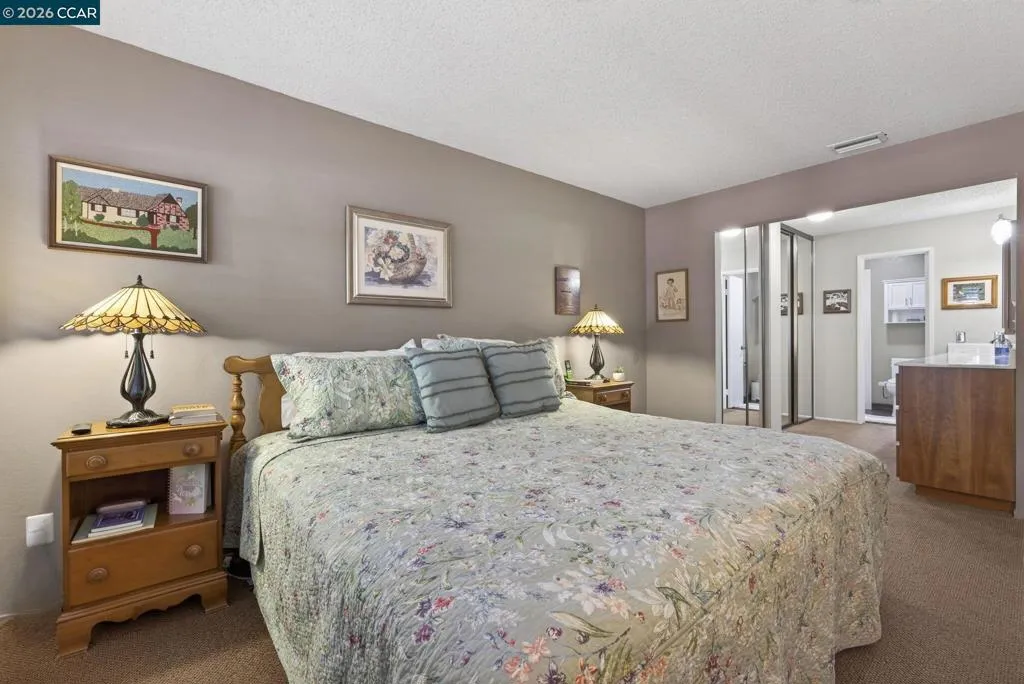 Don’t miss this exceptional ground-floor, level-in unit tucked away in a quiet location. The spacious private patio is ideal for a barbeque, a picnic table, and planting area. Enjoy the convenience of two reserved parking spaces—one covered carport and one uncovered spot both numbered 9121—just steps from your door. The spectacular kitchen and dining area showcase Black Walnut custom cabinetry, granite countertops, laminate flooring, stainless steel appliances, and plenty of lighting, including under-cabinet fixtures. The hall bath features durable vinyl plank flooring, while the main bedroom offers a private bath with a walk-in shower and a dressing area adorned with a stunning custom-built Cherry Wood vanity and cultured marble countertop. Berber carpeting adds comfort to the living room, hall bedroom, and main bedroom. Excellent double-pane windows and elegant plantation shutters are found throughout, ensuring style and energy efficiency. The laundry area includes washer and dryer hookups for added convenience. This development boasts amenities such as a pool, clubhouse, play area, and beautifully maintained landscaping. Located close to shopping, transportation, parks, and schools, this unit offers both convenience and tranquility. Don’t miss out—this home is truly beautiful!